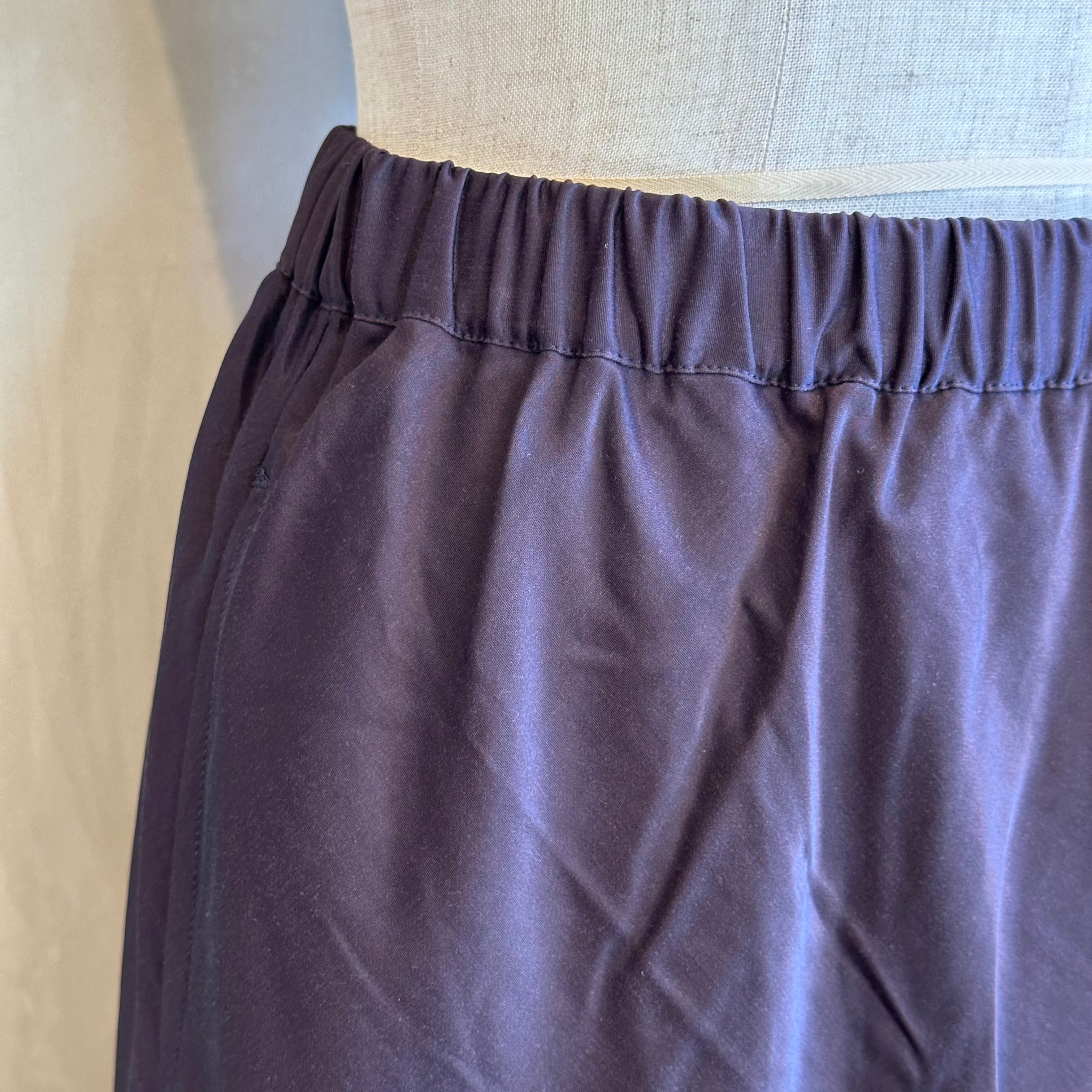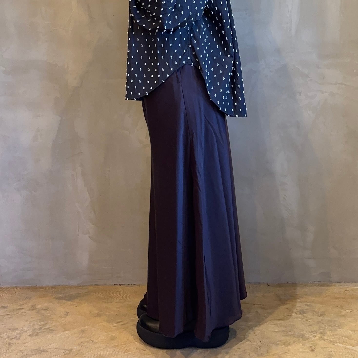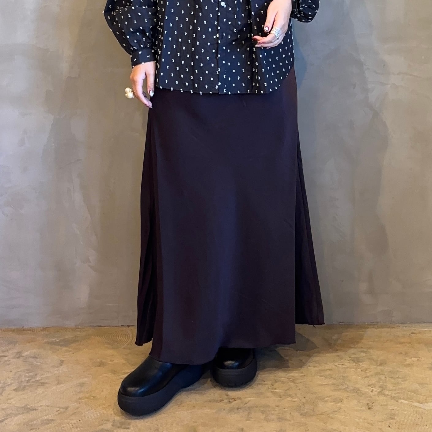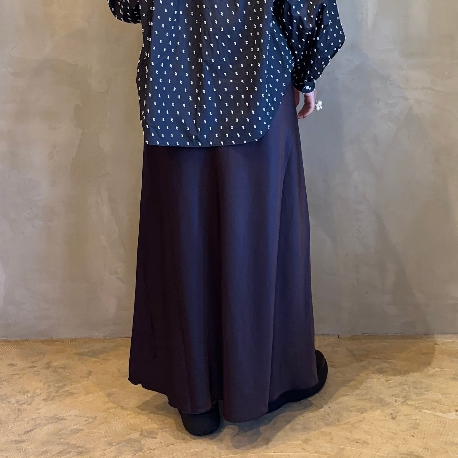 マットな光沢と、とろみのあるキュプラのような上品な印象の生地を使用しています。ビンテージライクな表面のオウトツ感も高見えポイント◎肉厚な生地感で裏地は付いてませんが、ボディラインをひろわず安心して着用頂けます。
