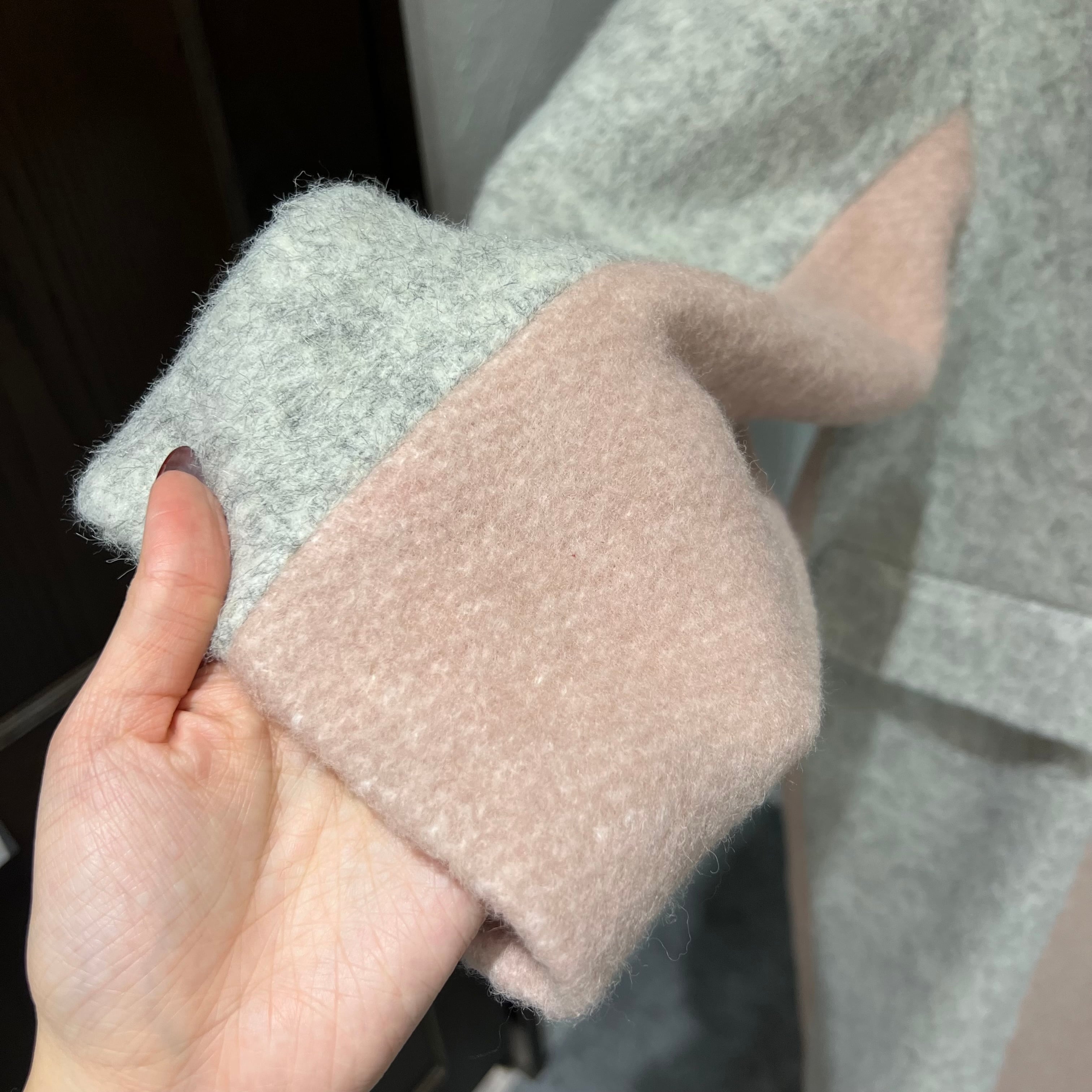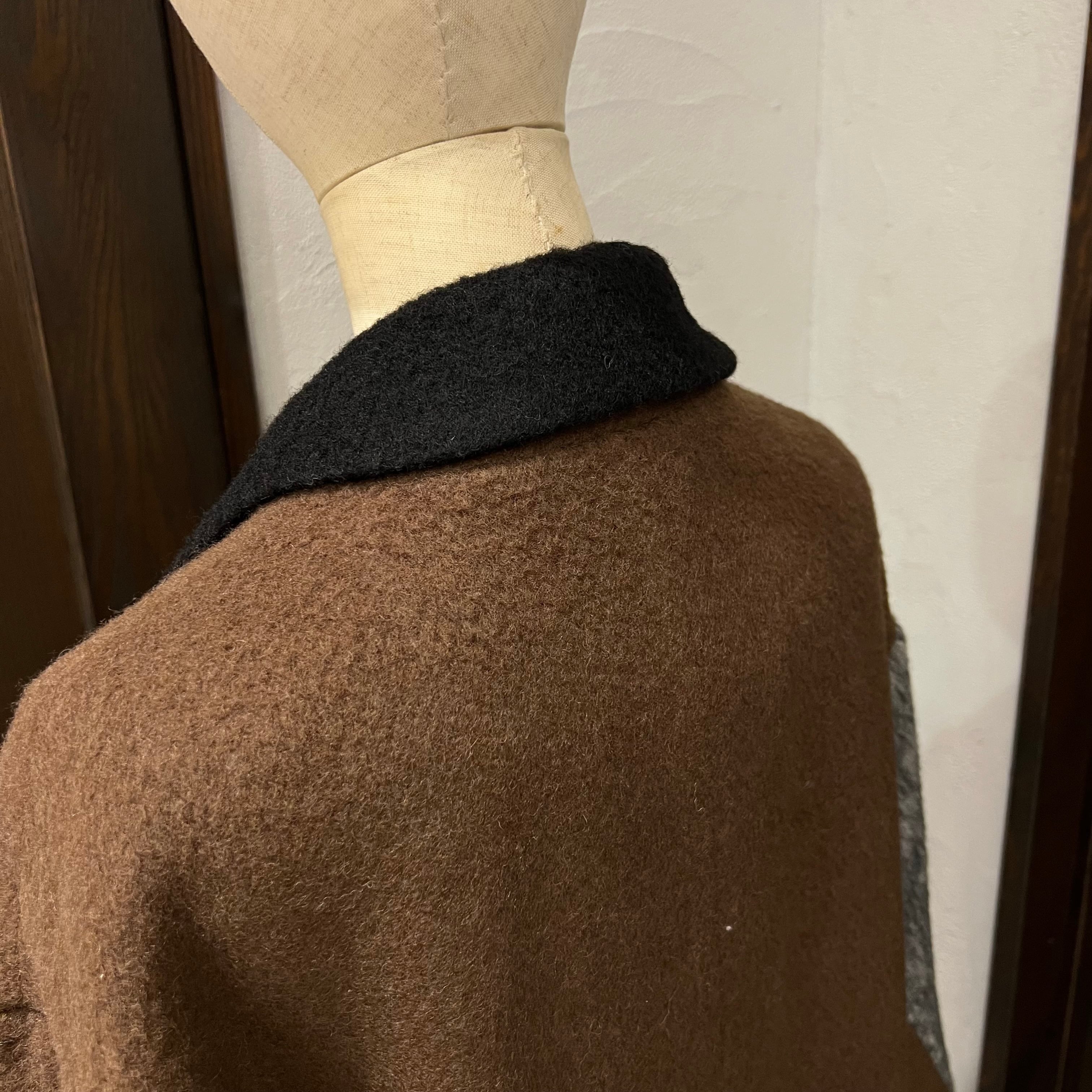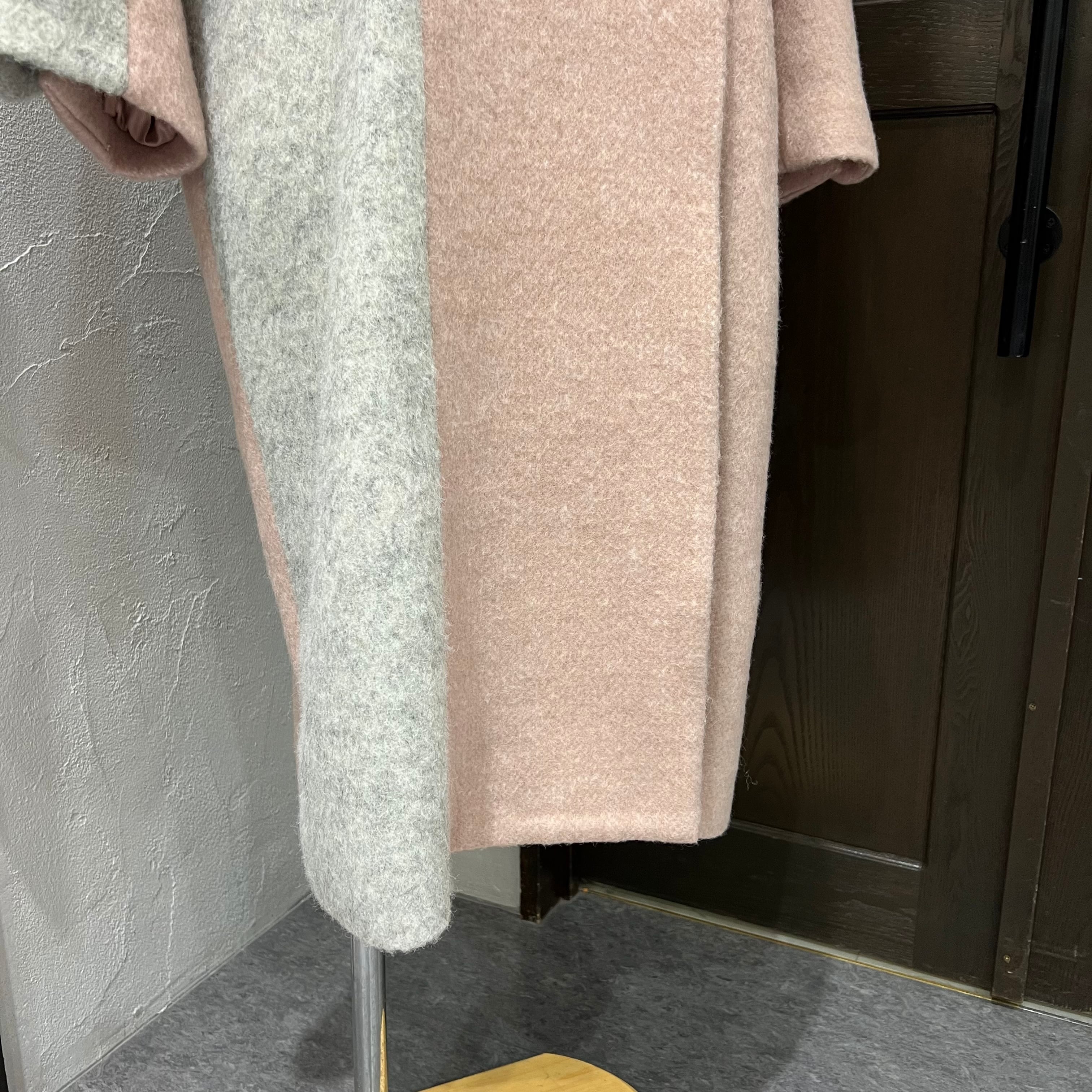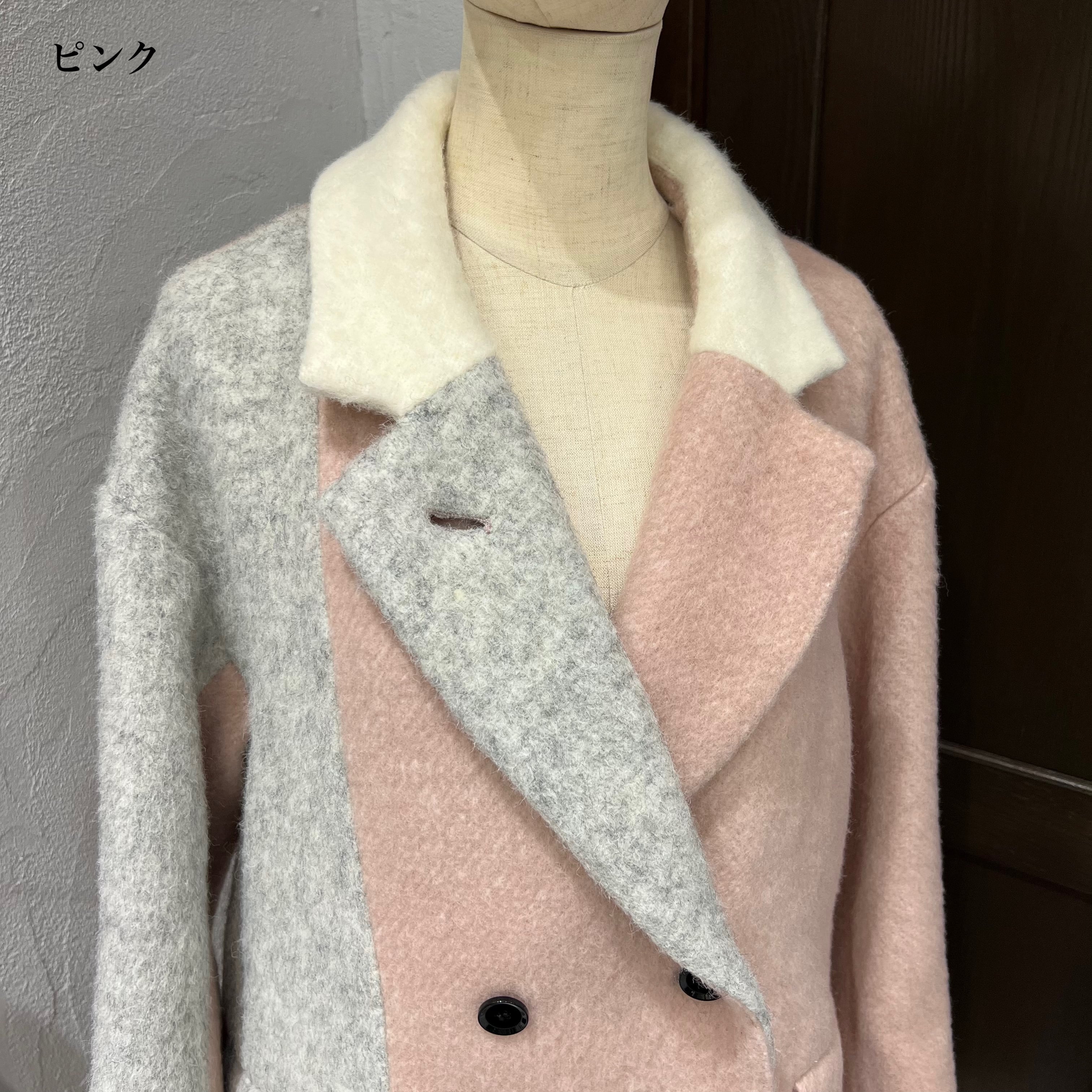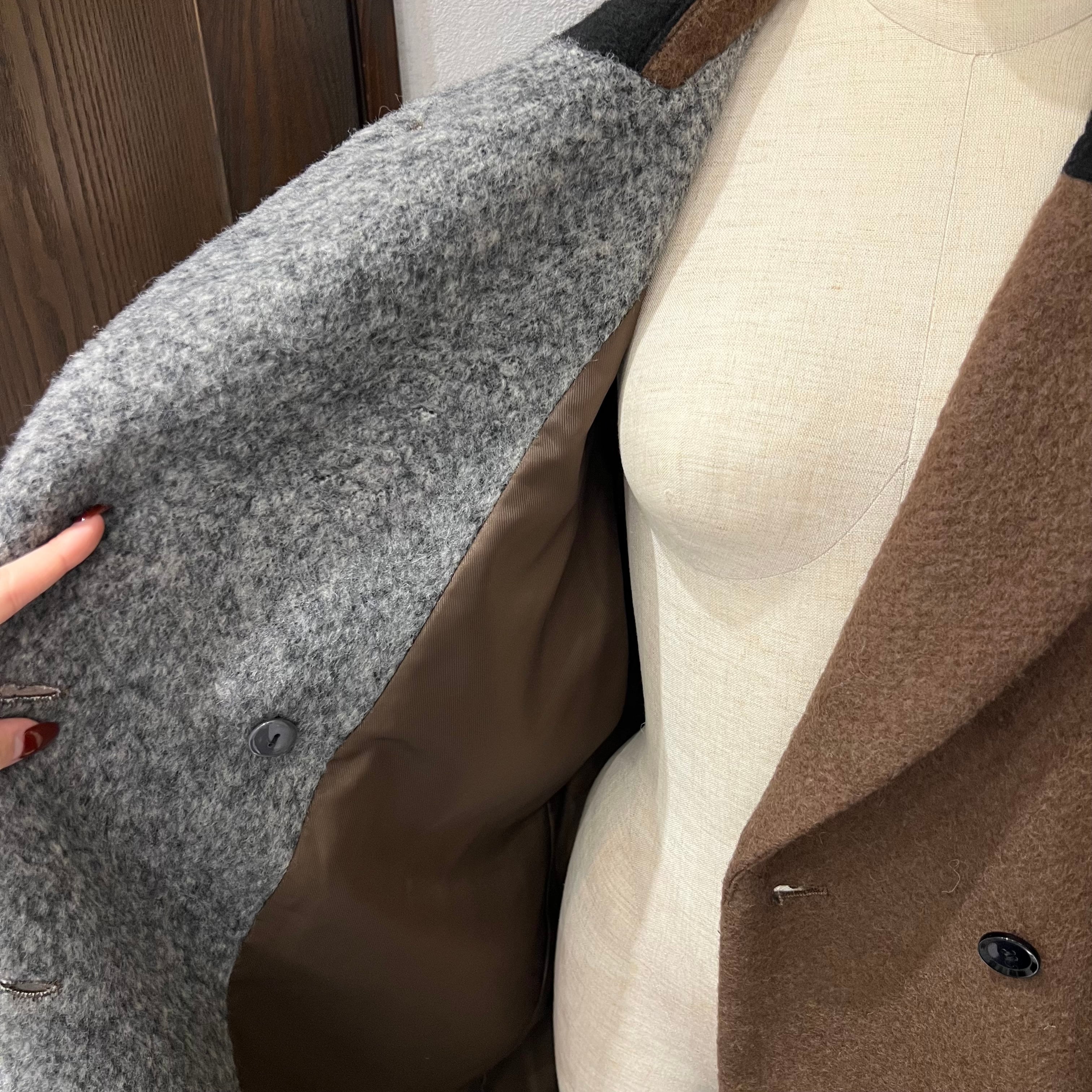 毛足あるウールシャギー素材を大胆に配色使いしたメンズライクなコート。
