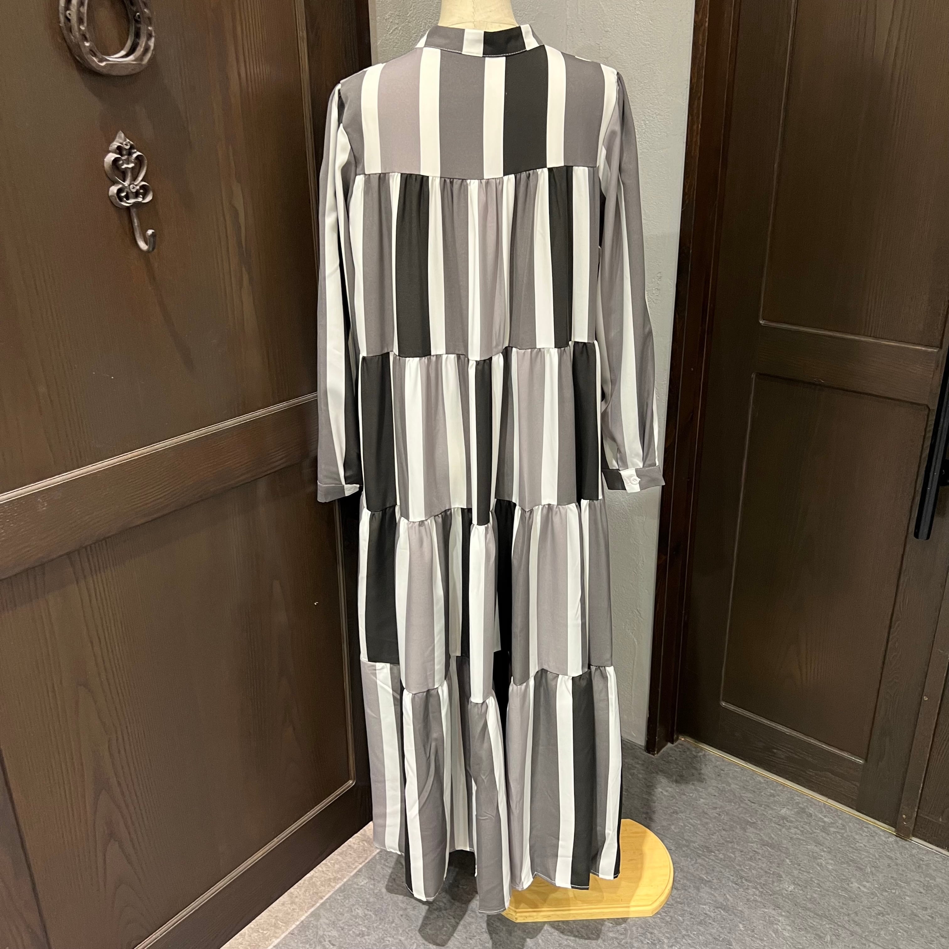 縦ラインを強調するストライプ柄を、全部で6色使った他にはないデザインワンピース。
