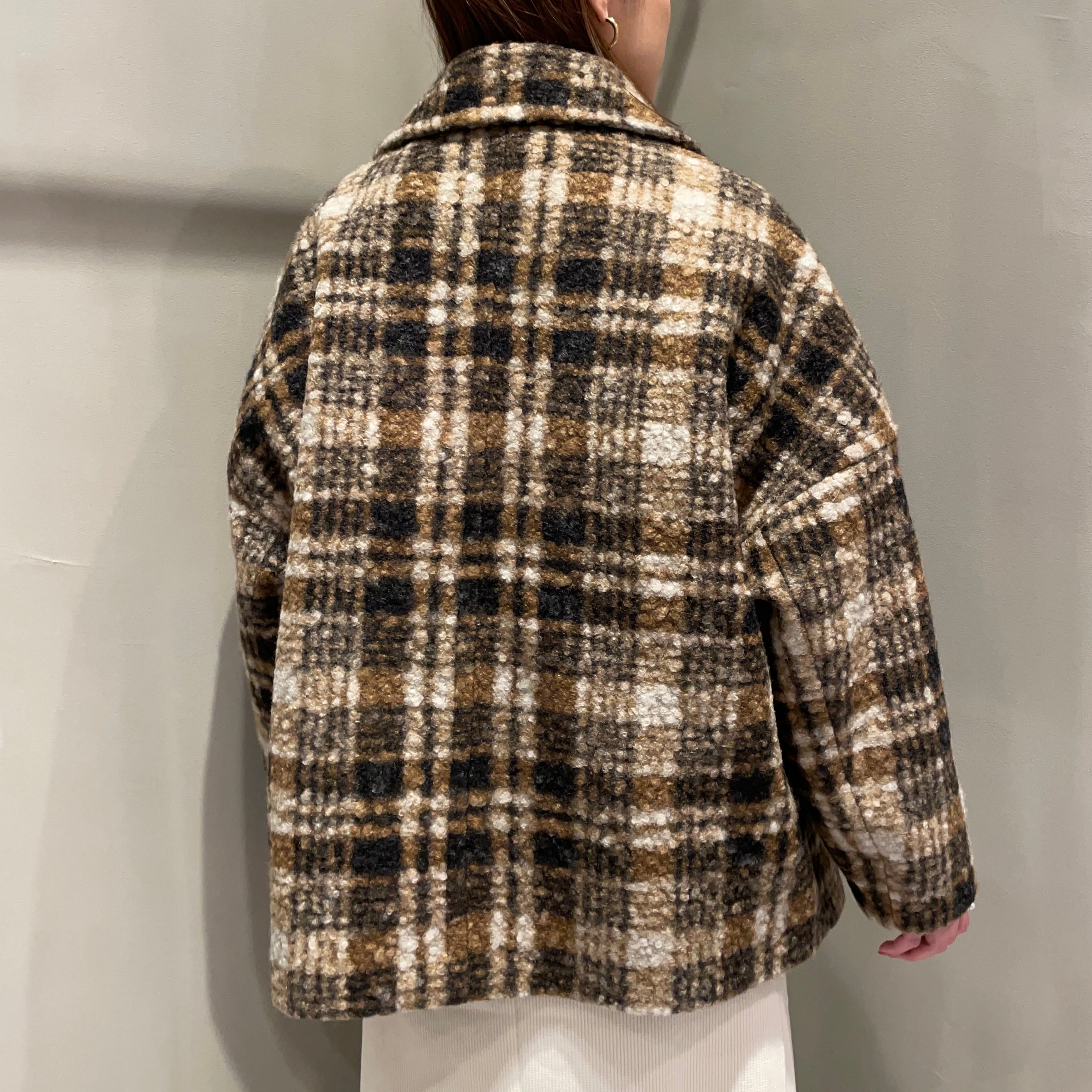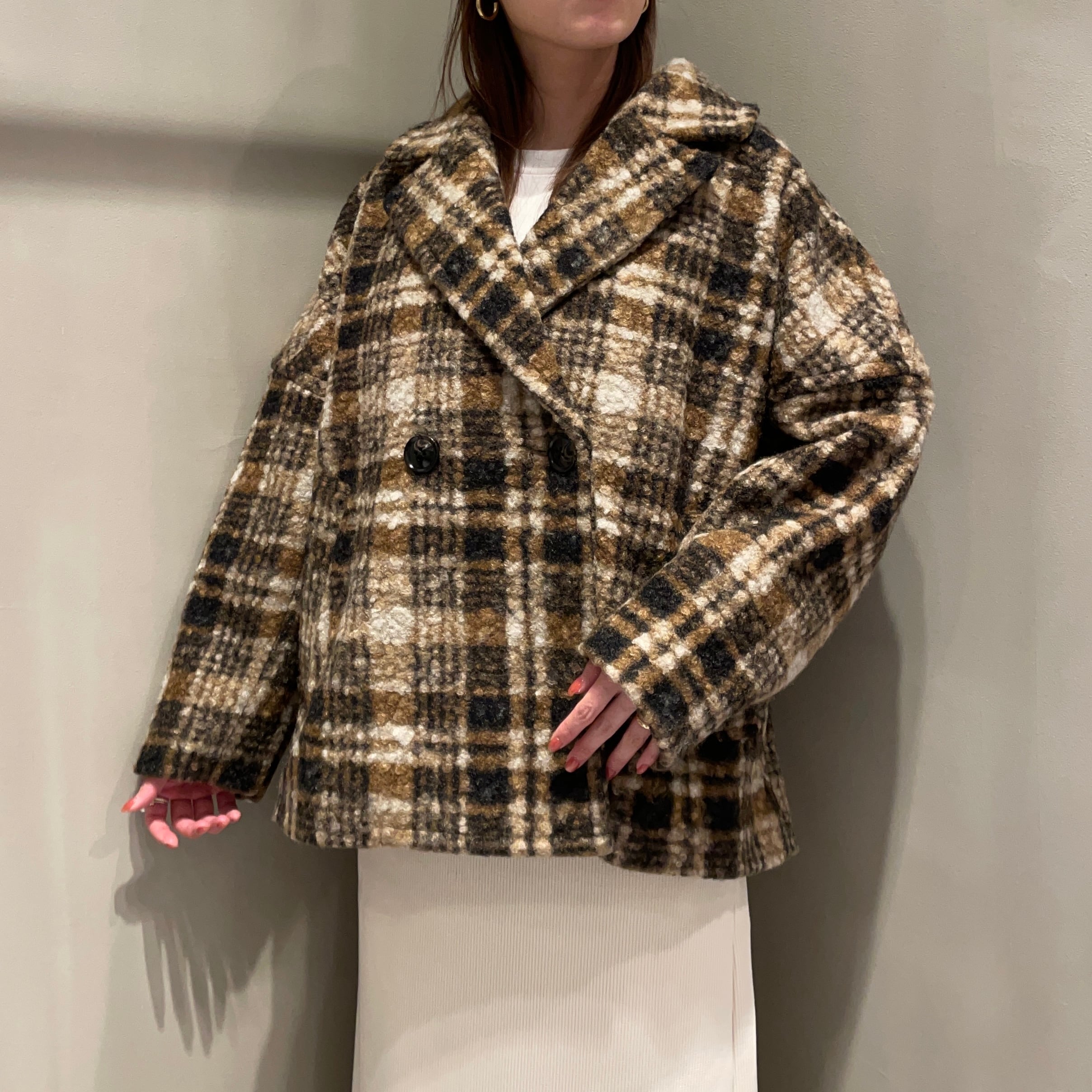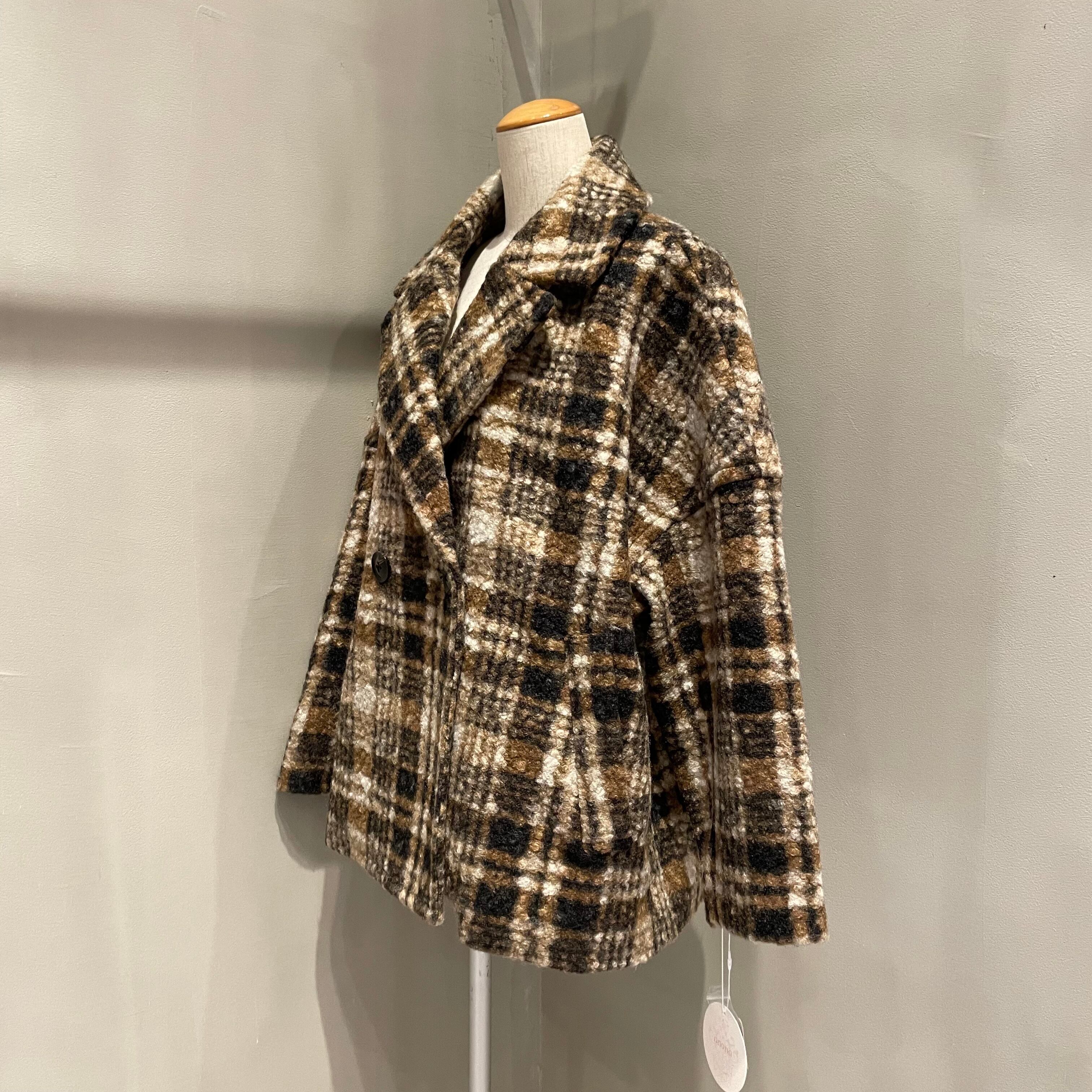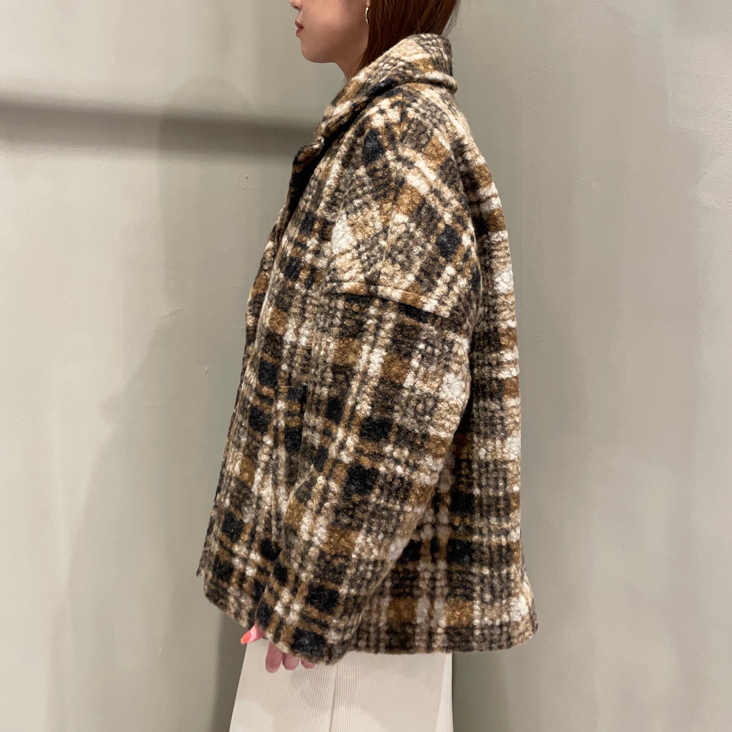 表面に凹凸感のあるブークレ生地を使用した温もりあるクラシカルなチェック柄コート。