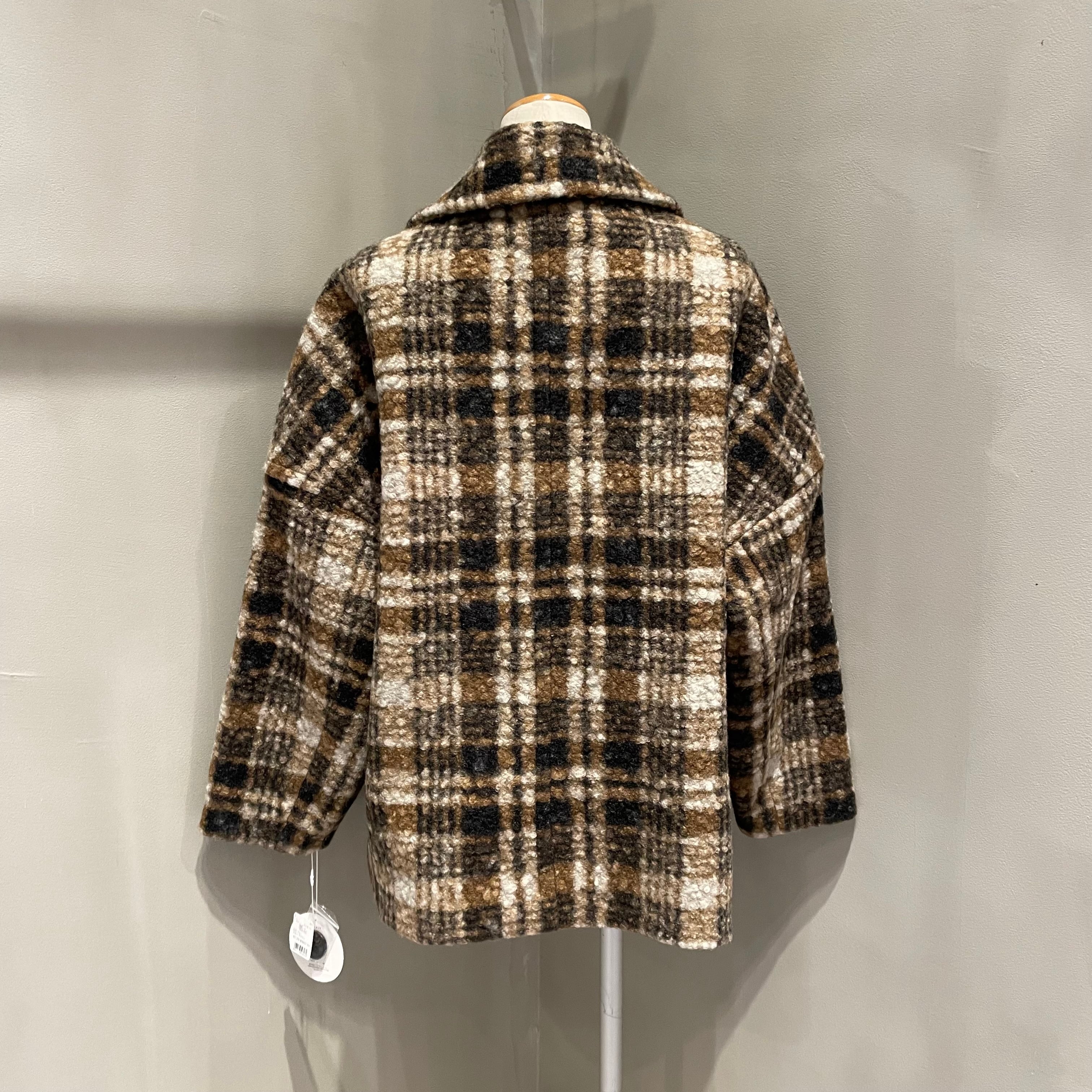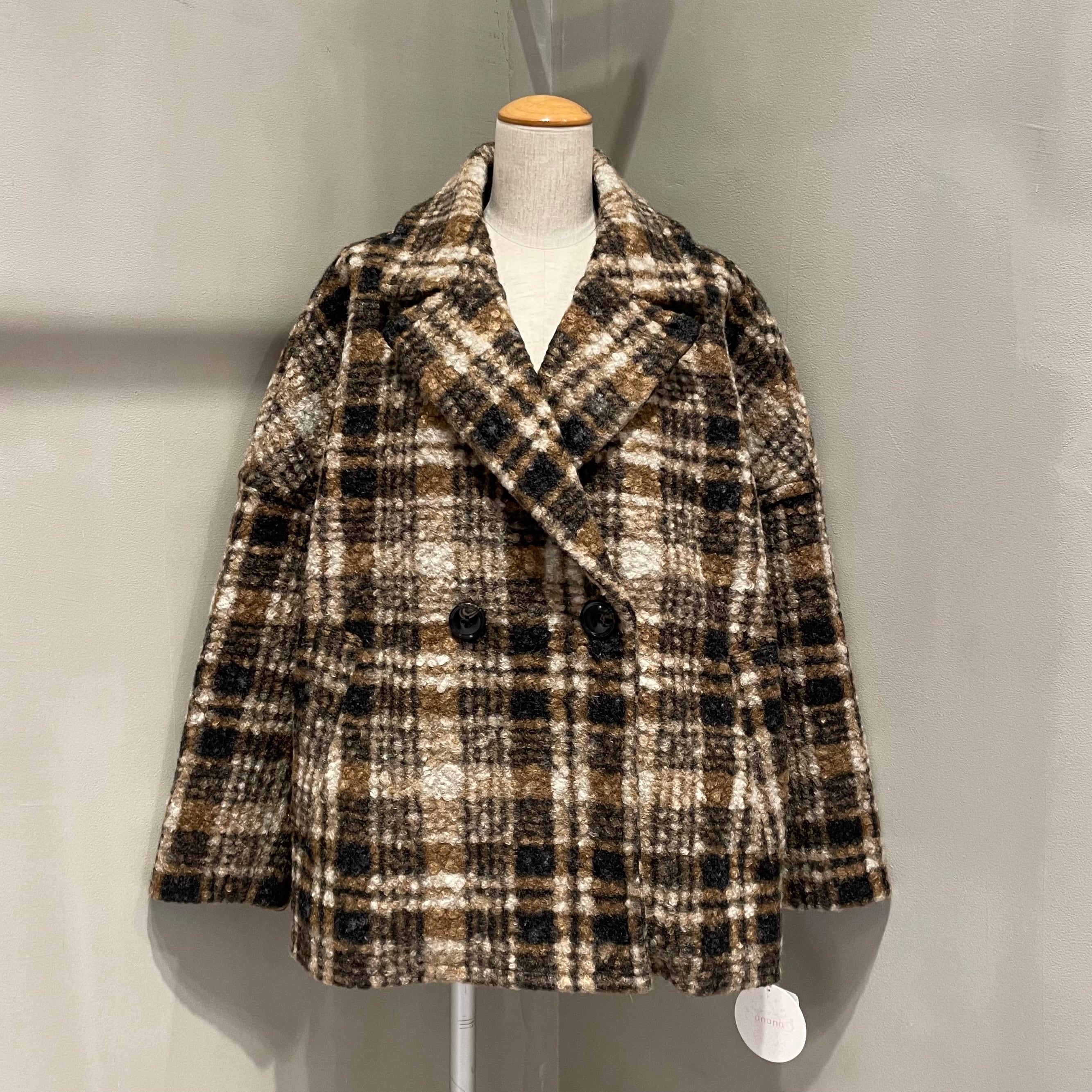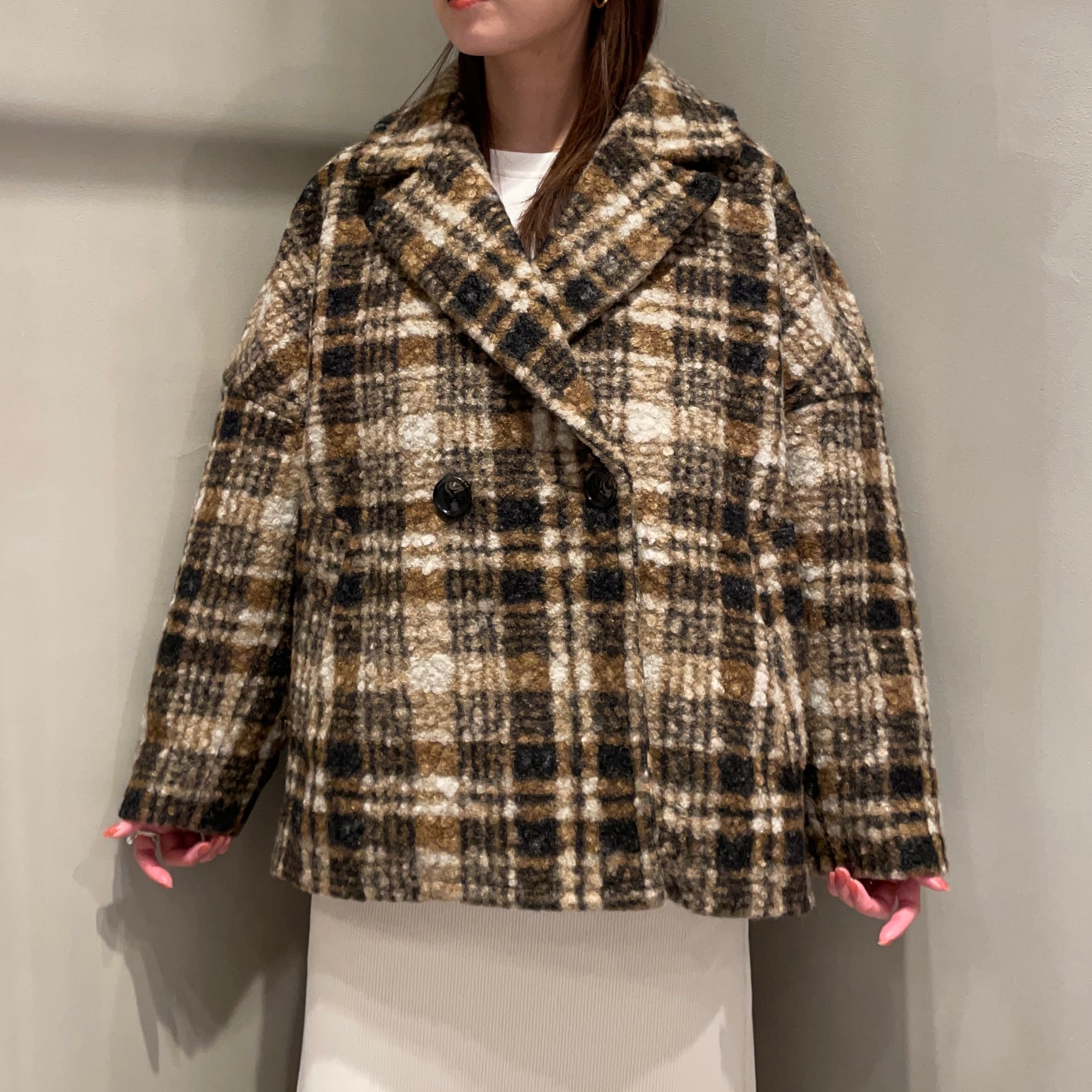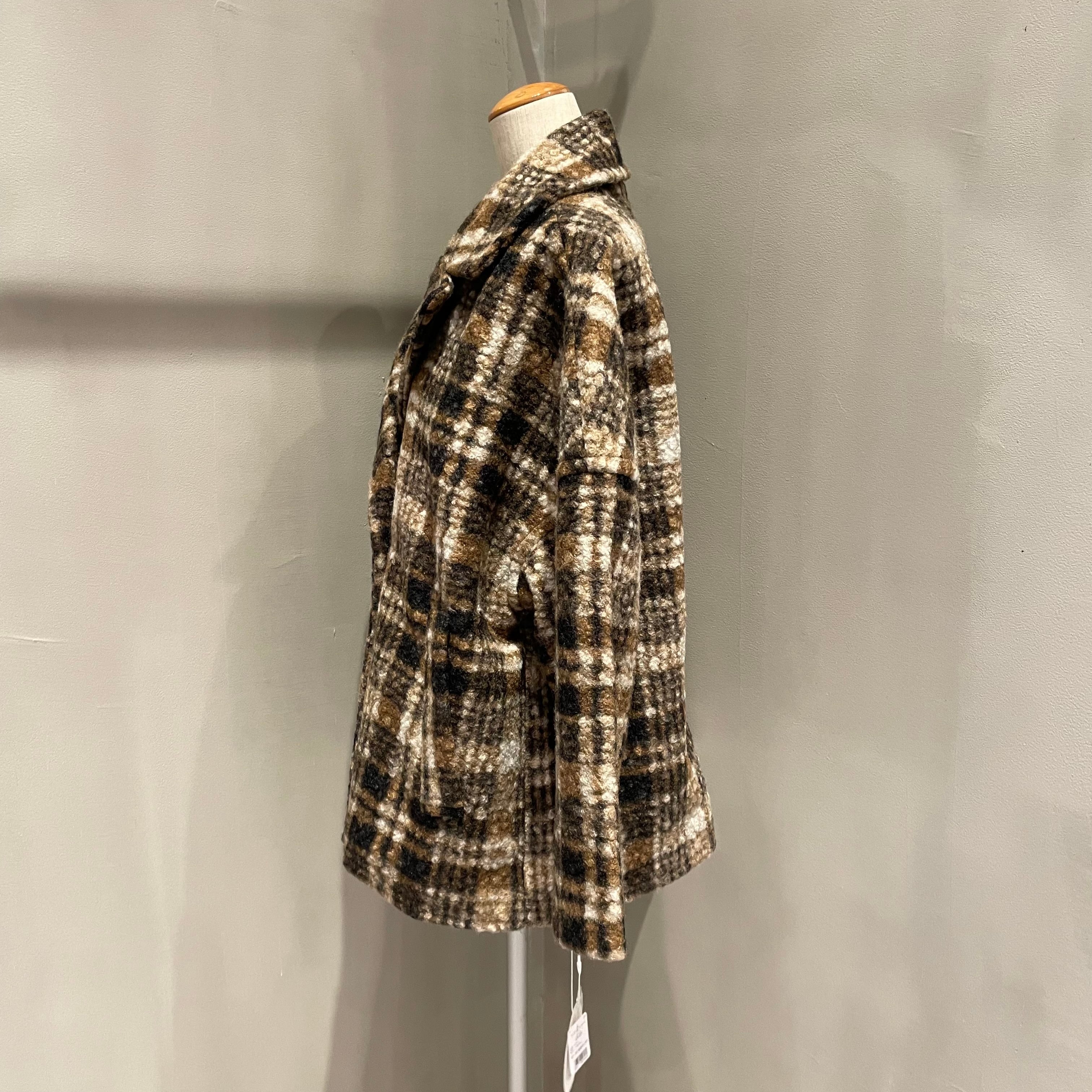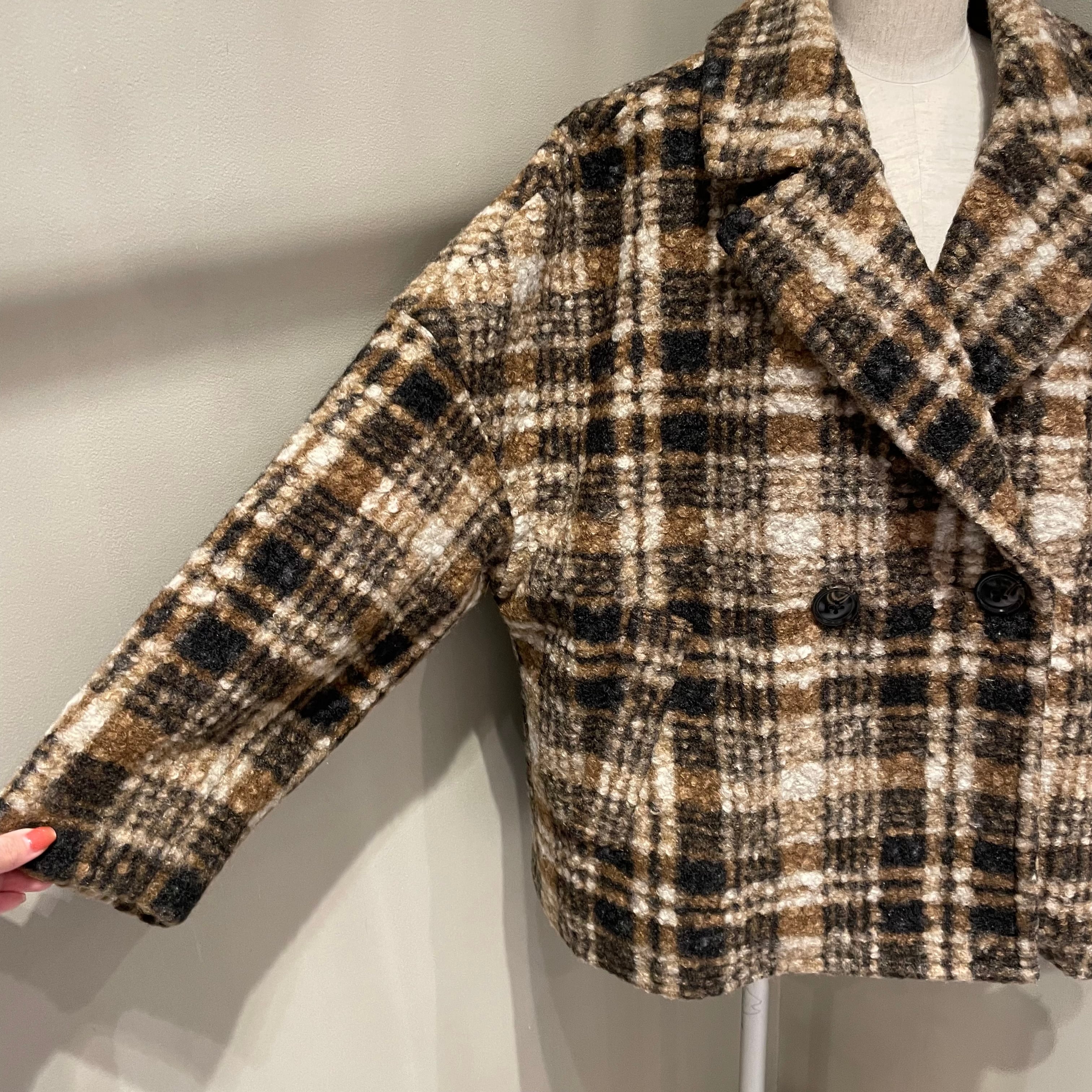 表面に凹凸感のあるブークレ生地を使用した温もりあるクラシカルなチェック柄コート。