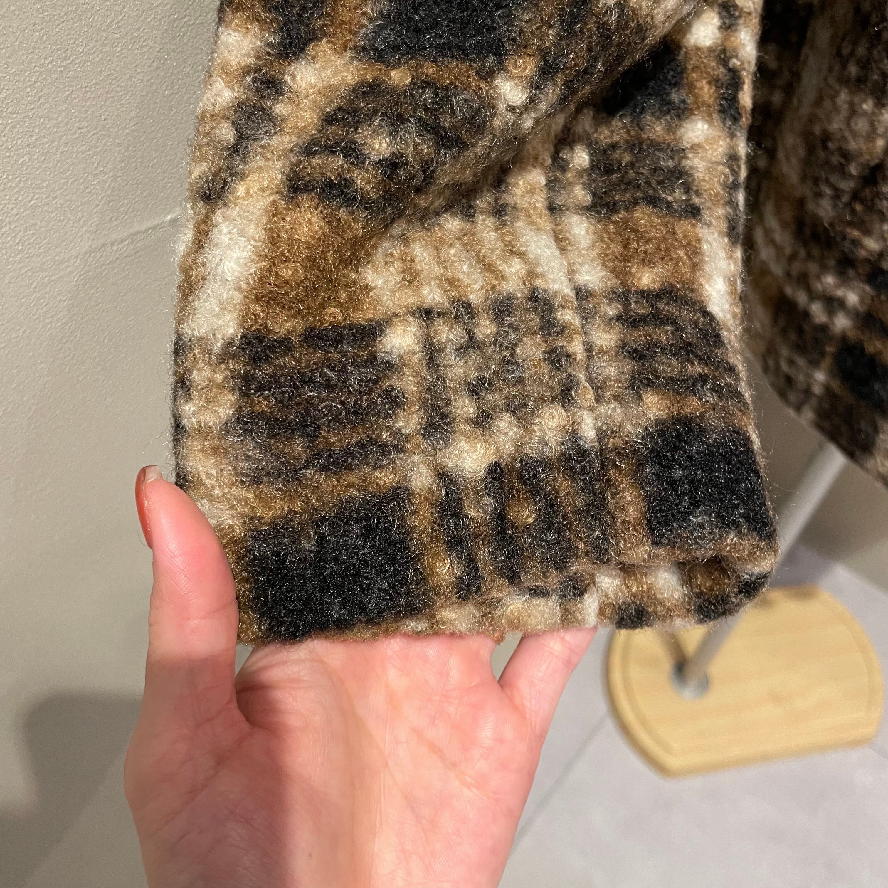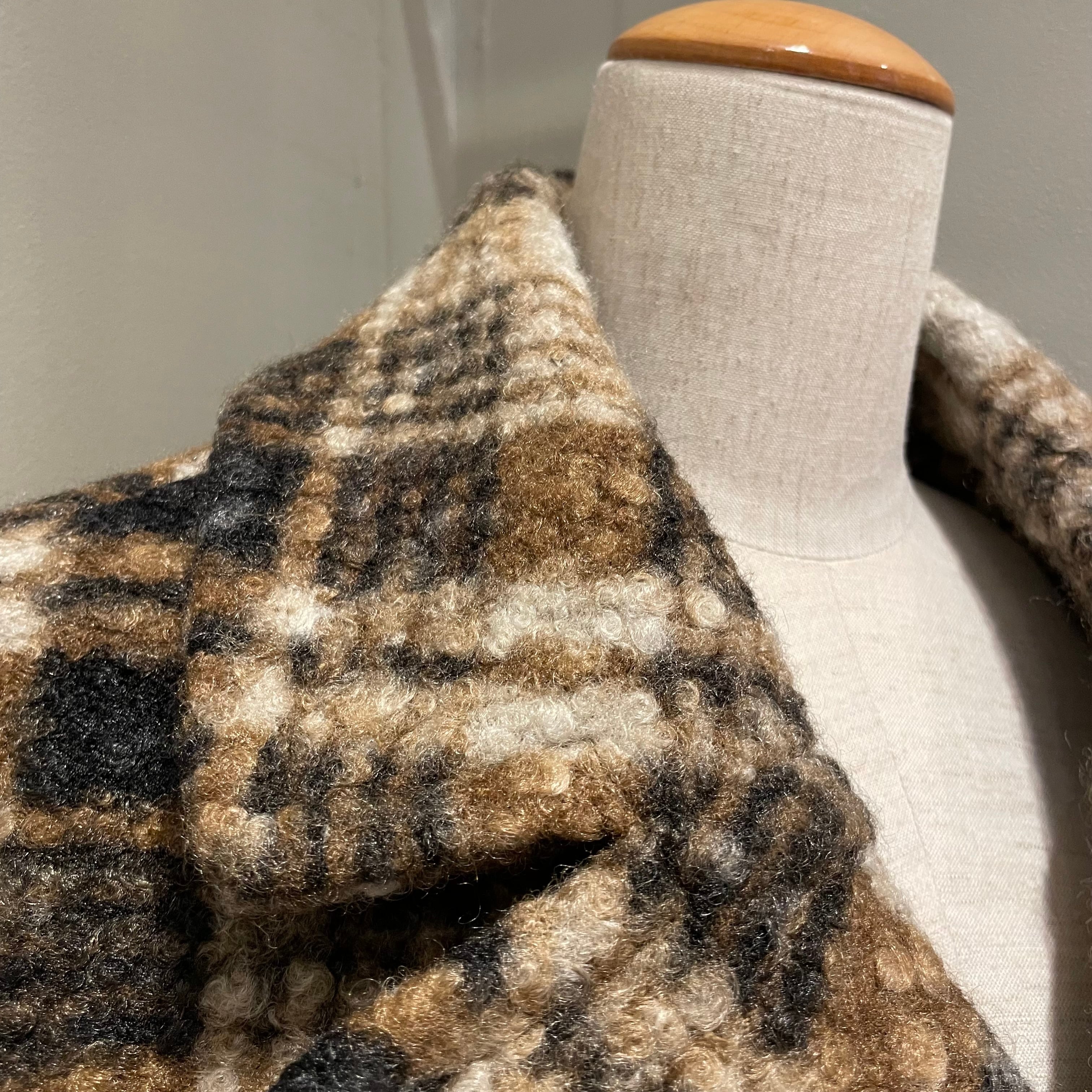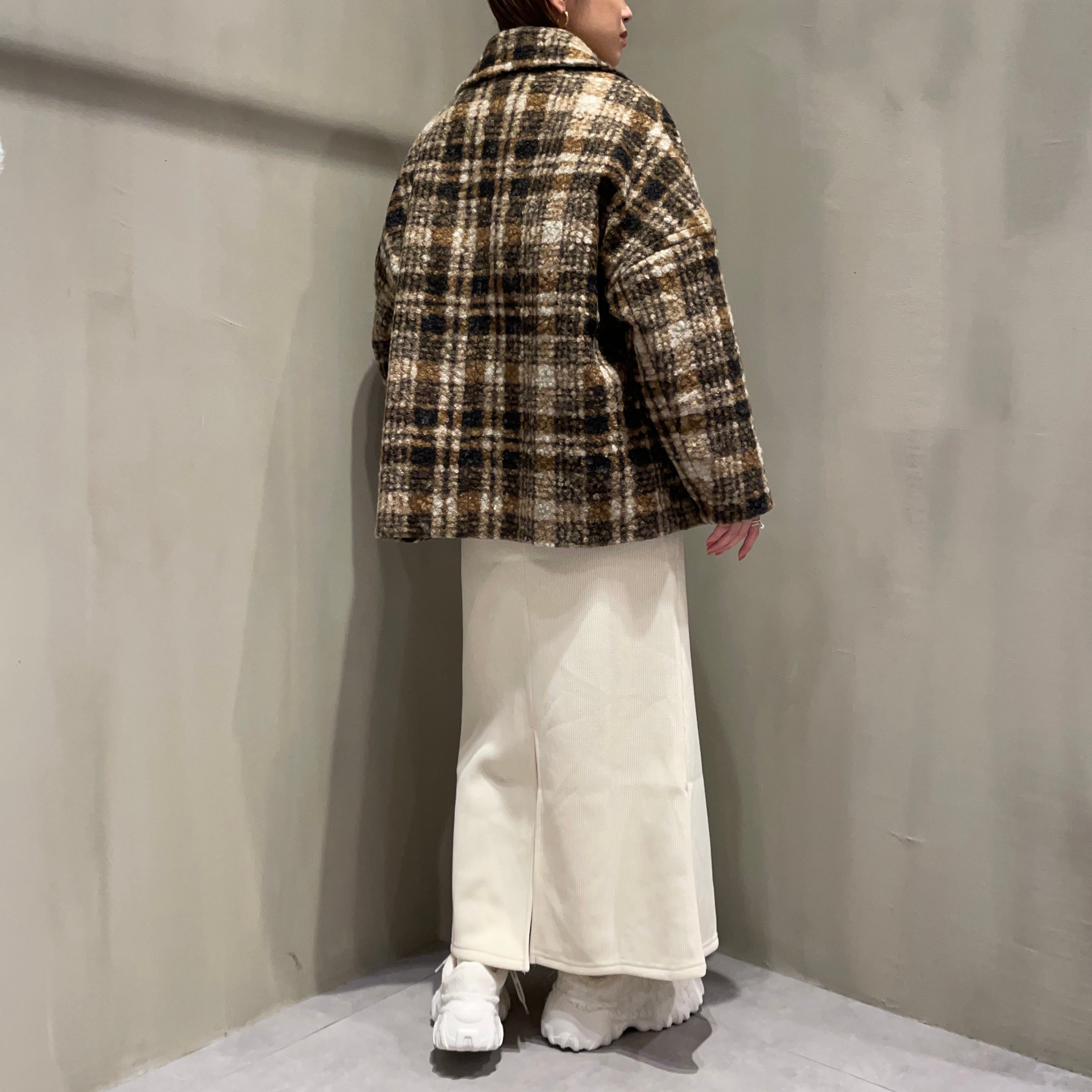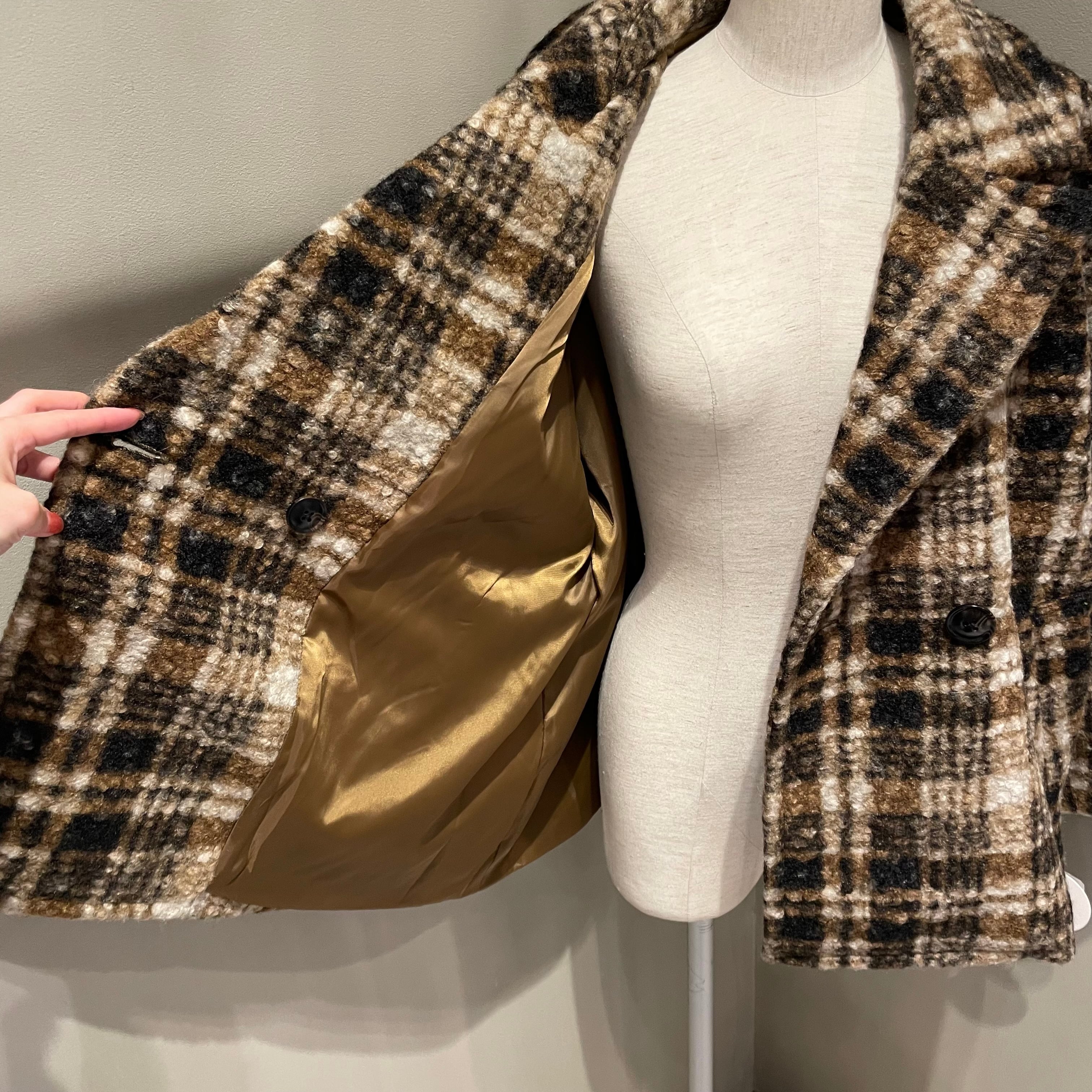 表面に凹凸感のあるブークレ生地を使用した温もりあるクラシカルなチェック柄コート。