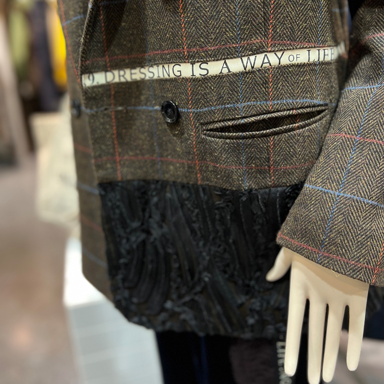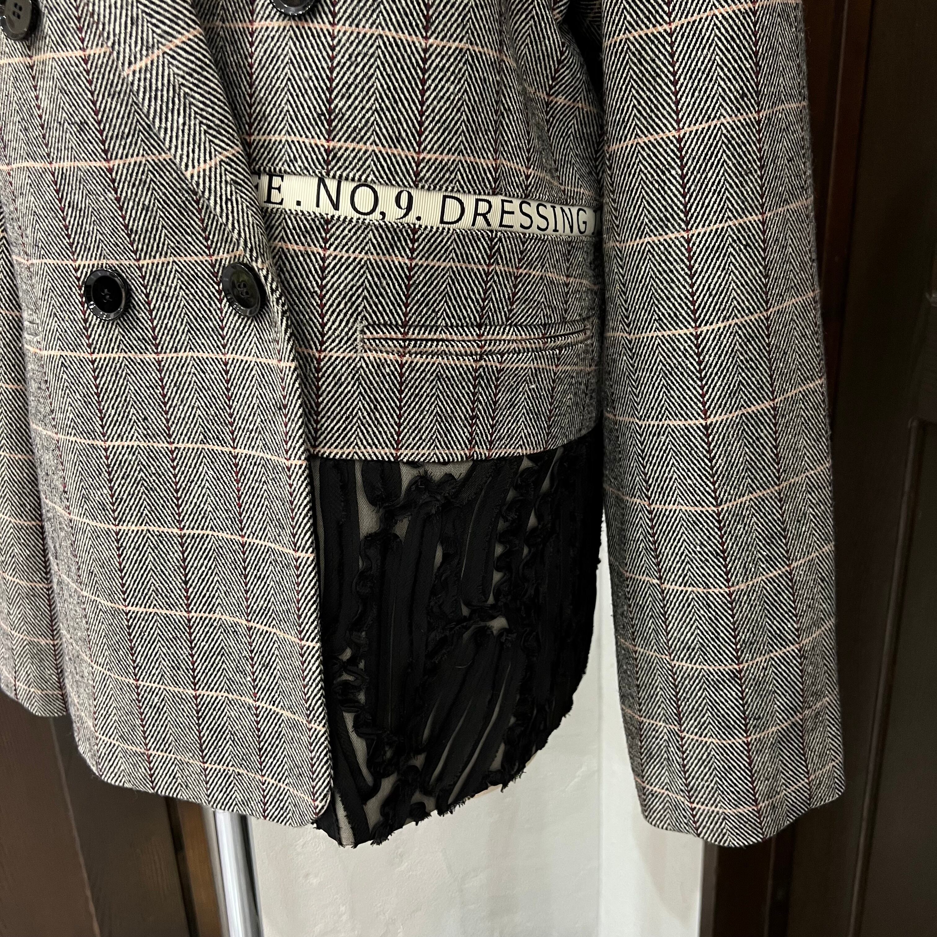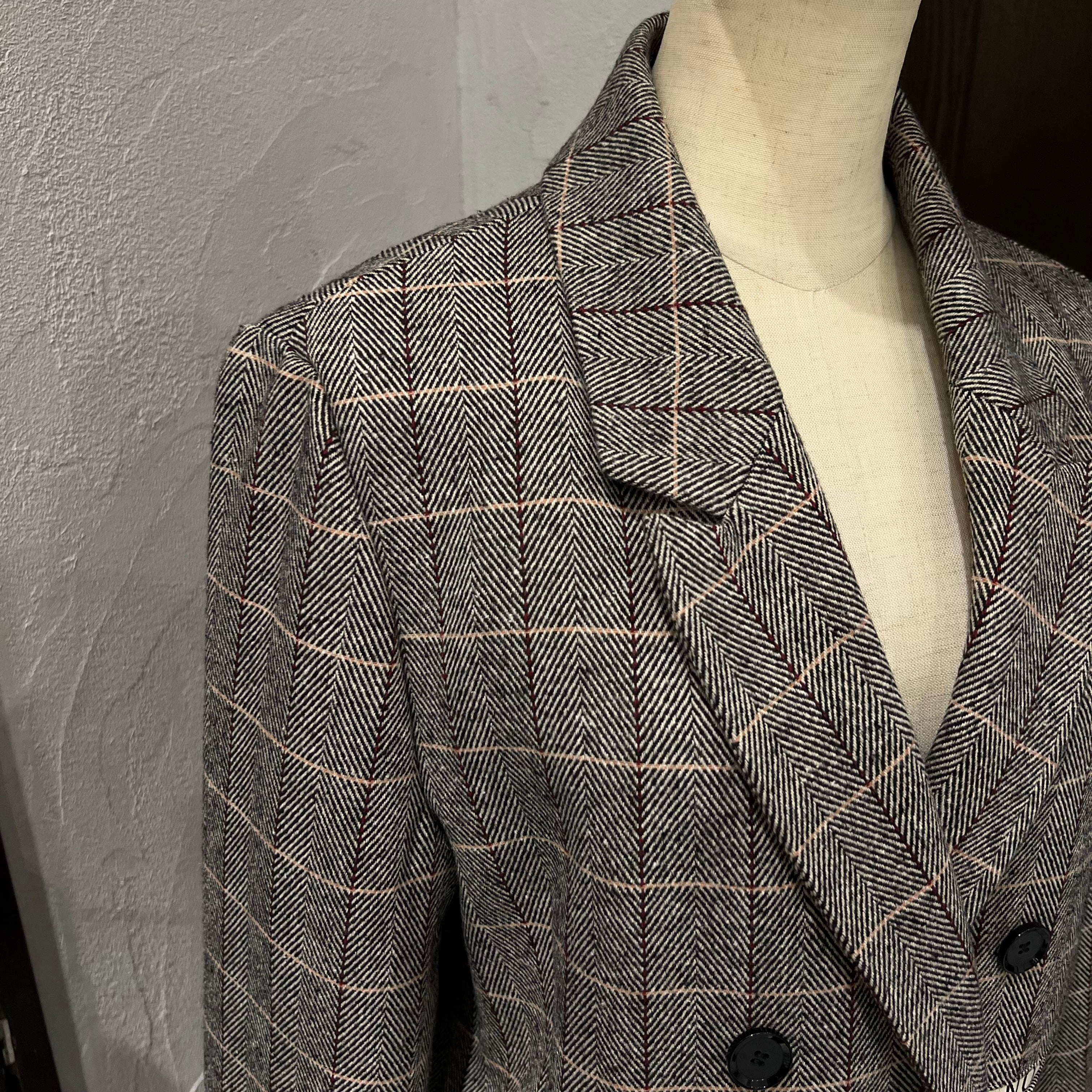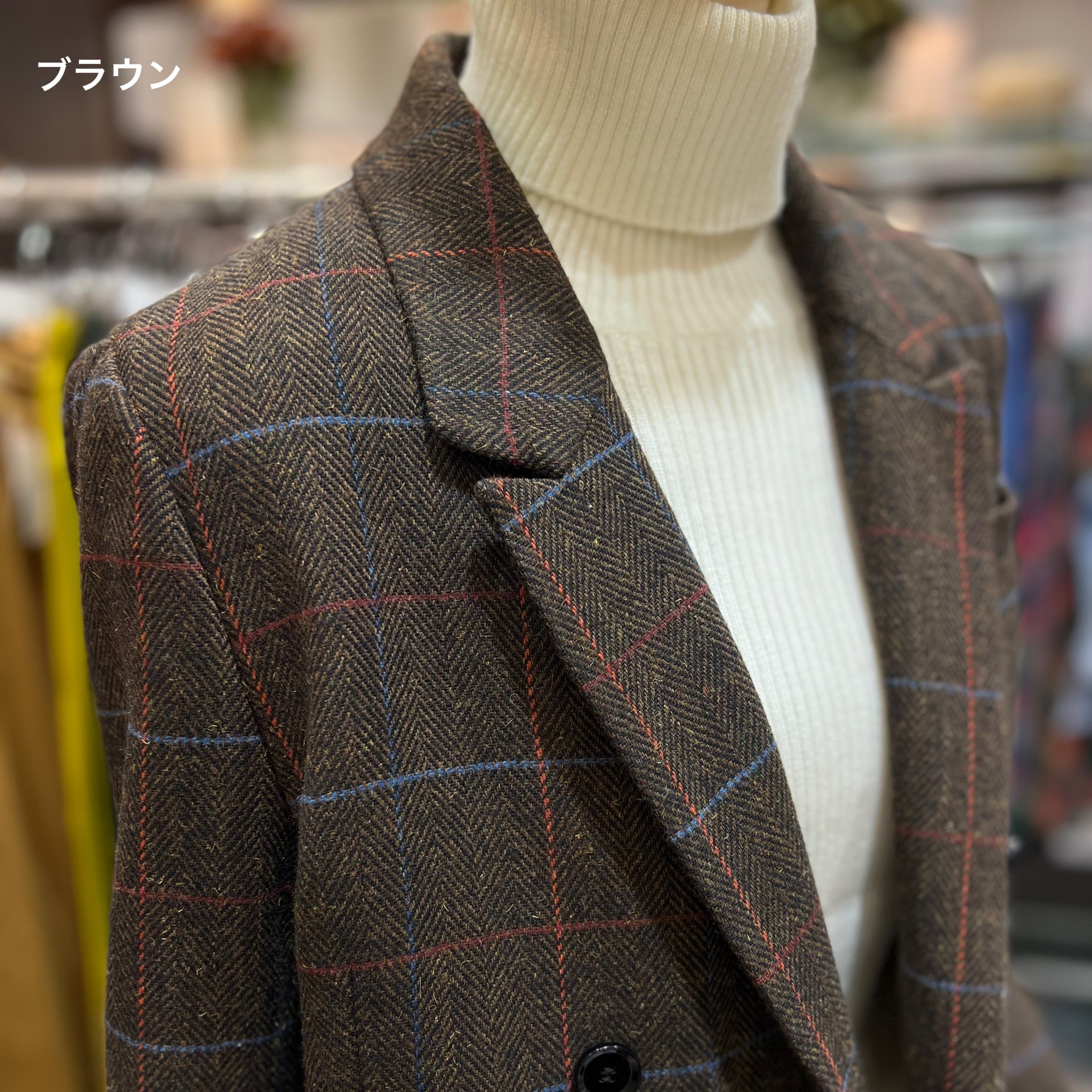 ブリティッシュ顔のチェック素材をロゴテープやテープ刺繍生地で女性らしくデザインしたエイミーらしいジャケット。