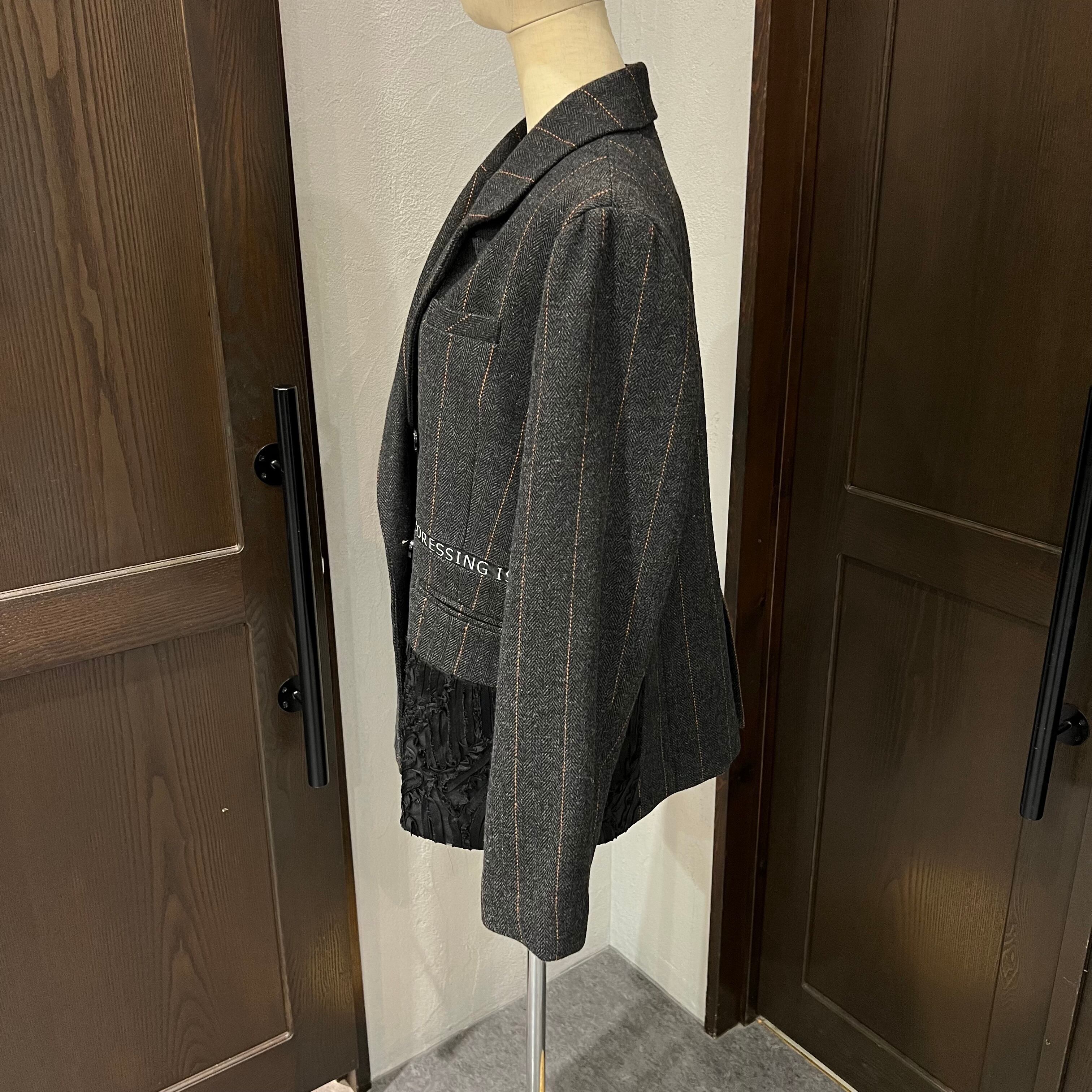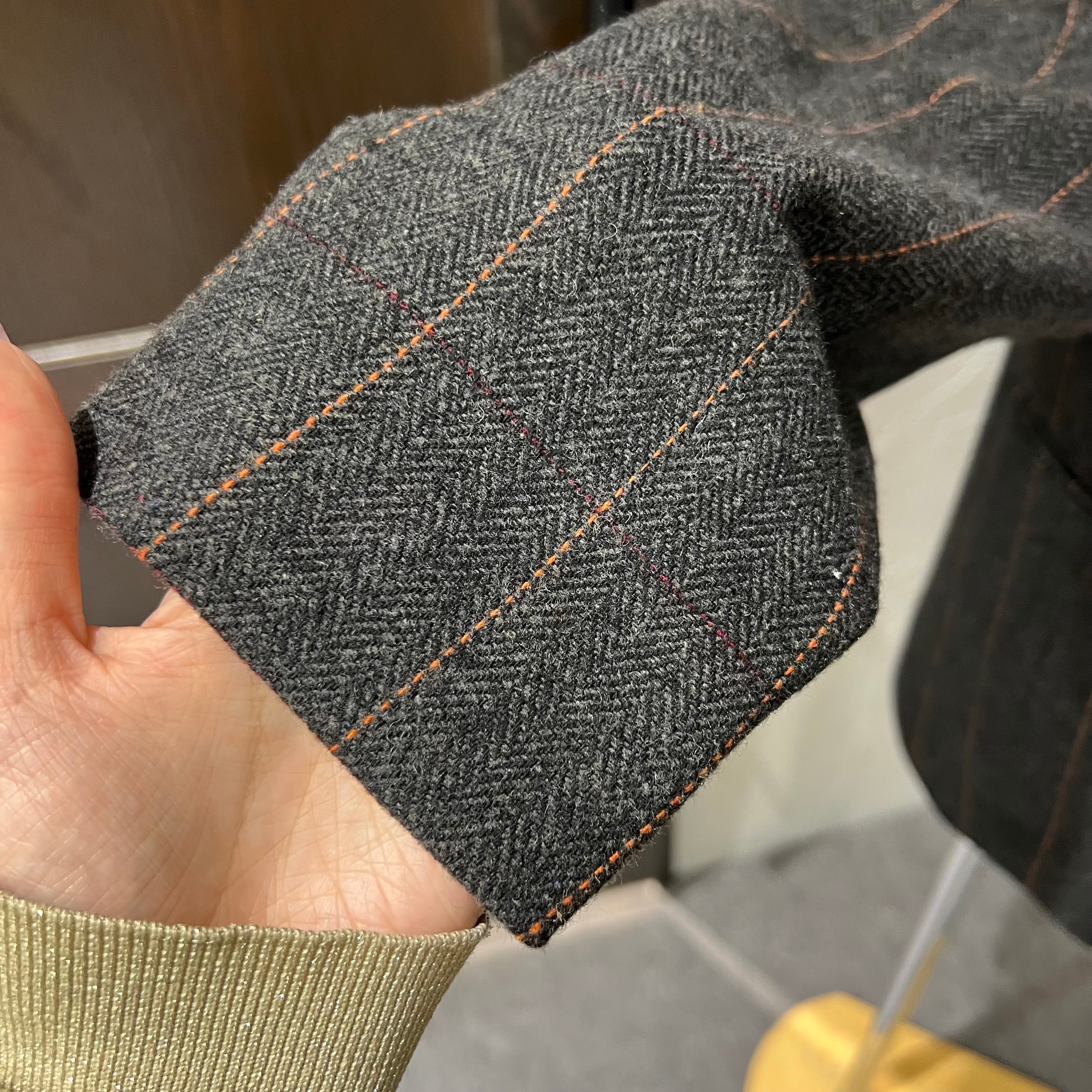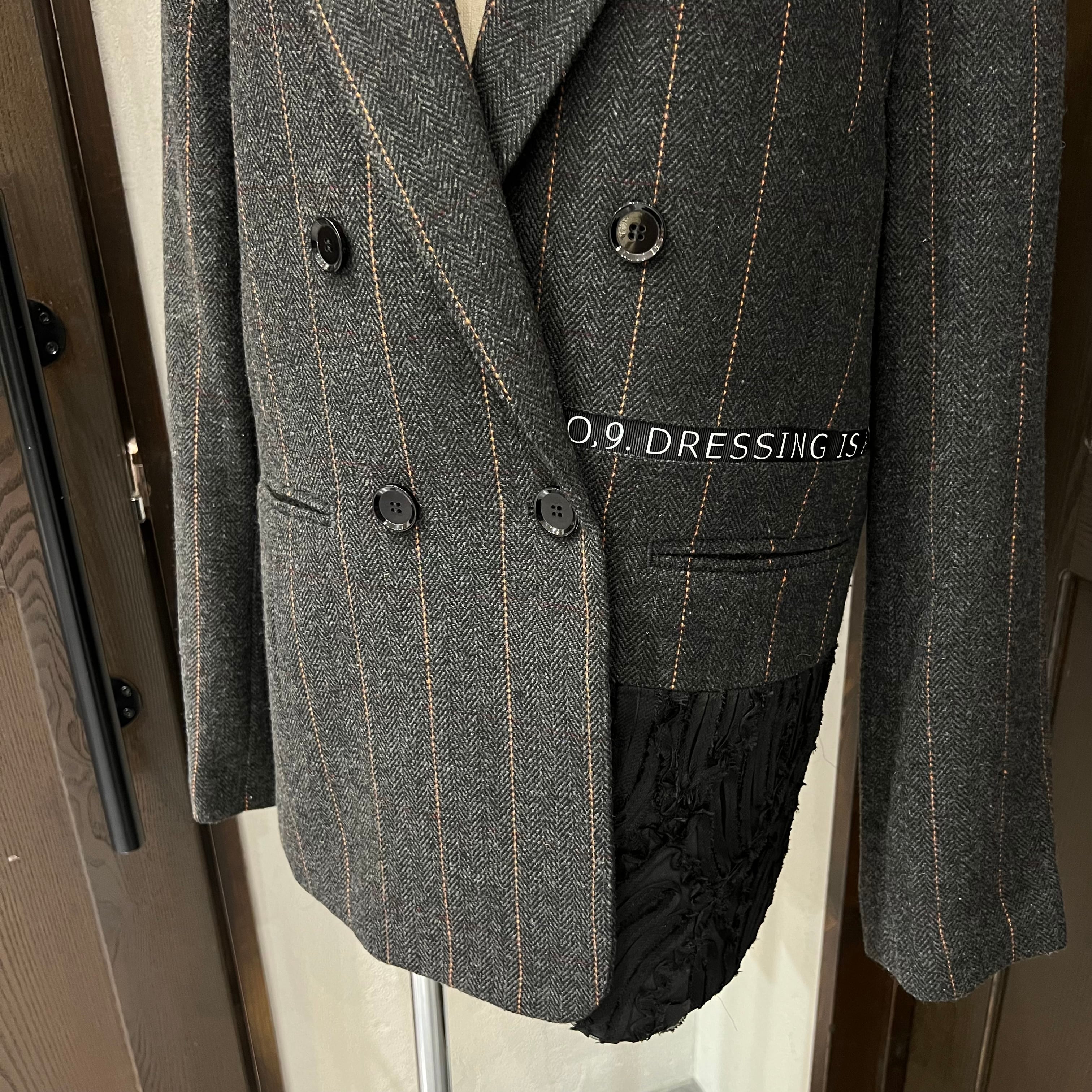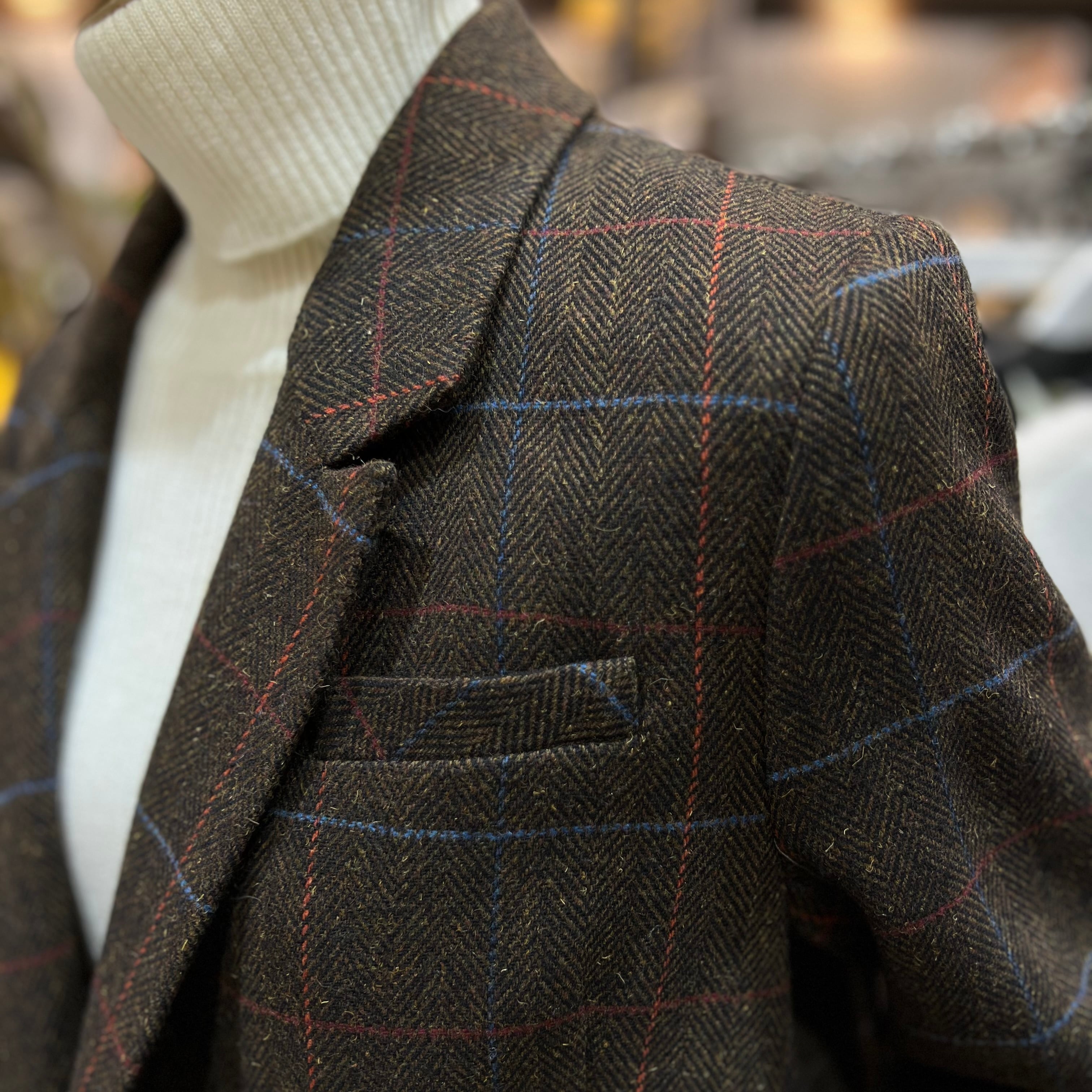 ブリティッシュ顔のチェック素材をロゴテープやテープ刺繍生地で女性らしくデザインしたエイミーらしいジャケット。