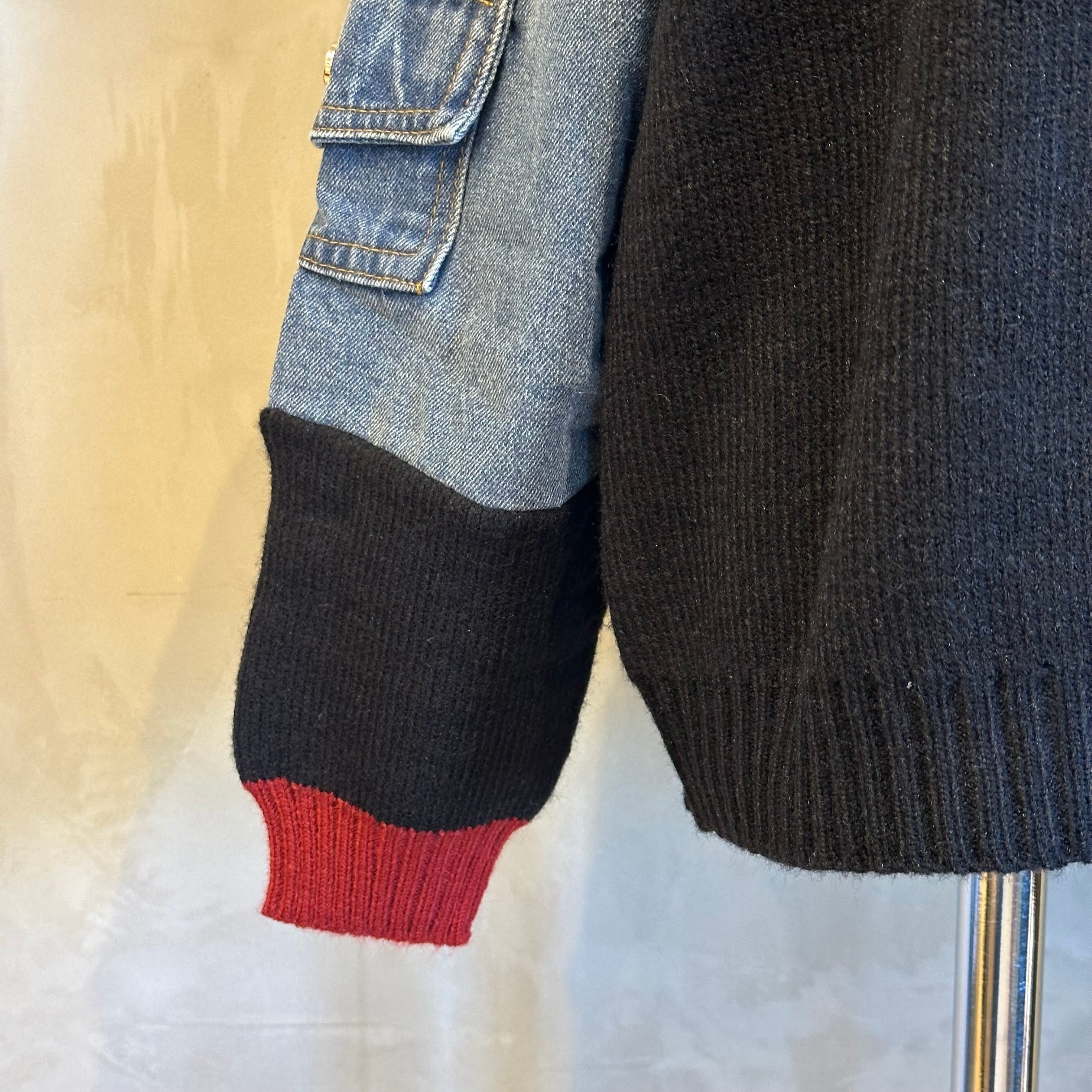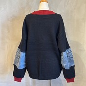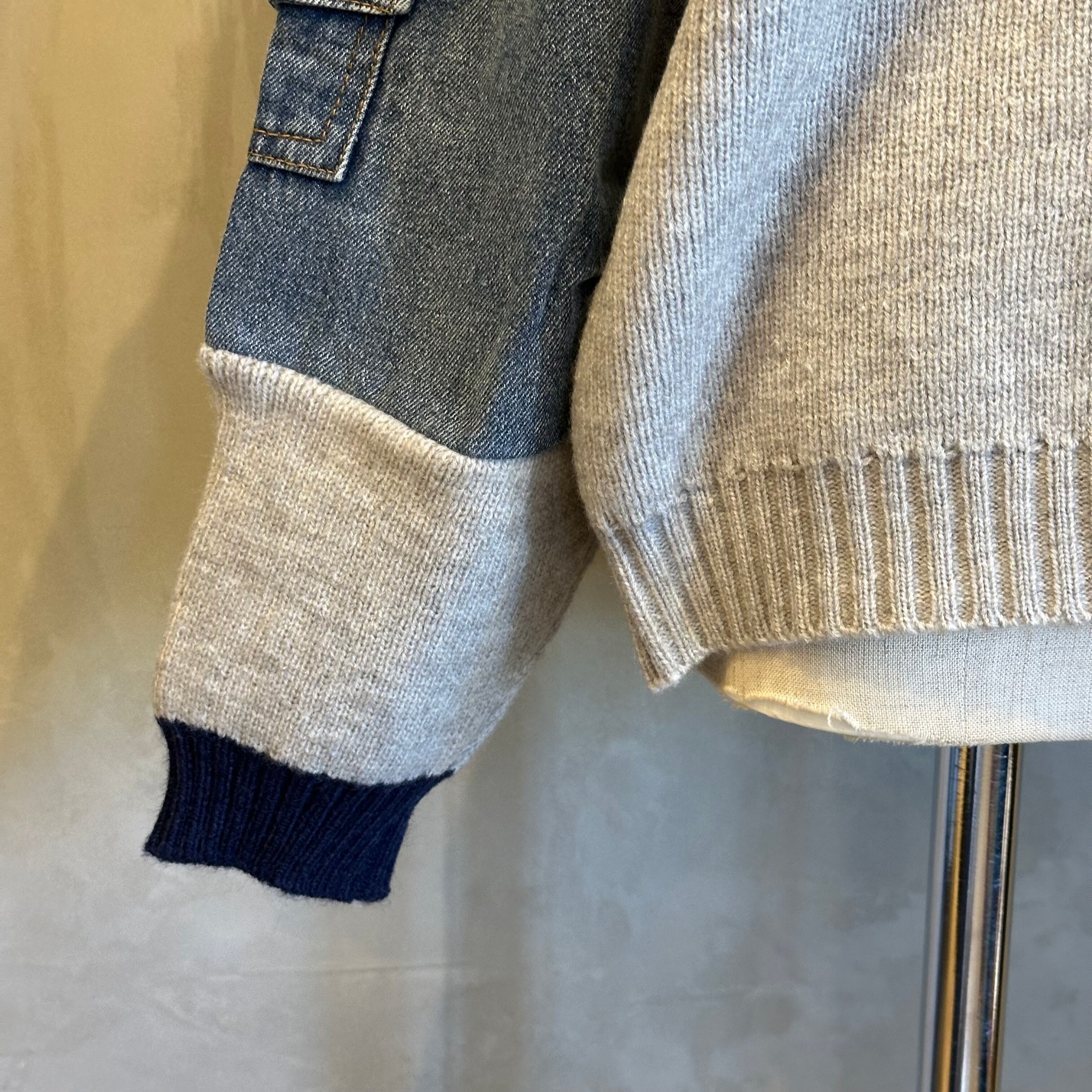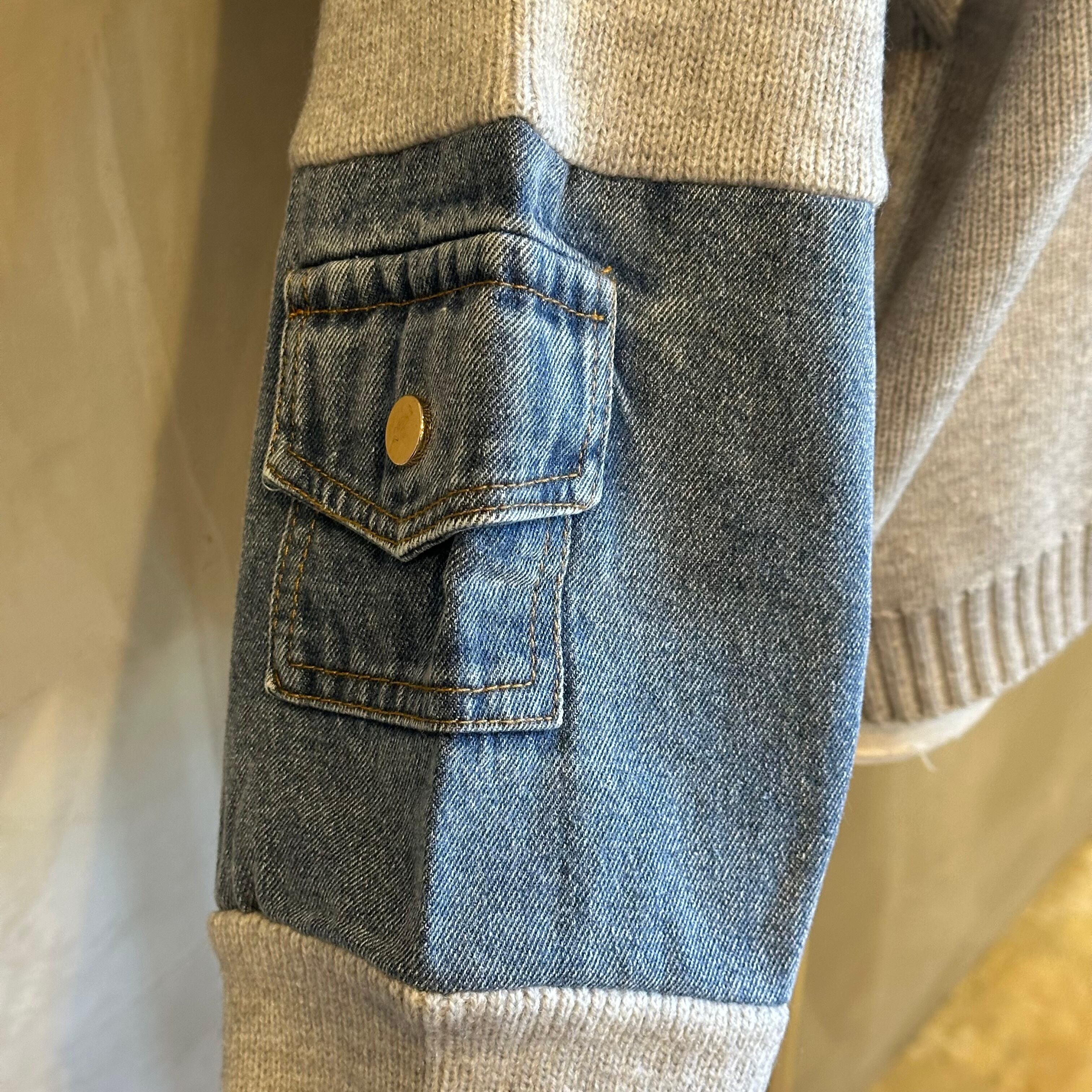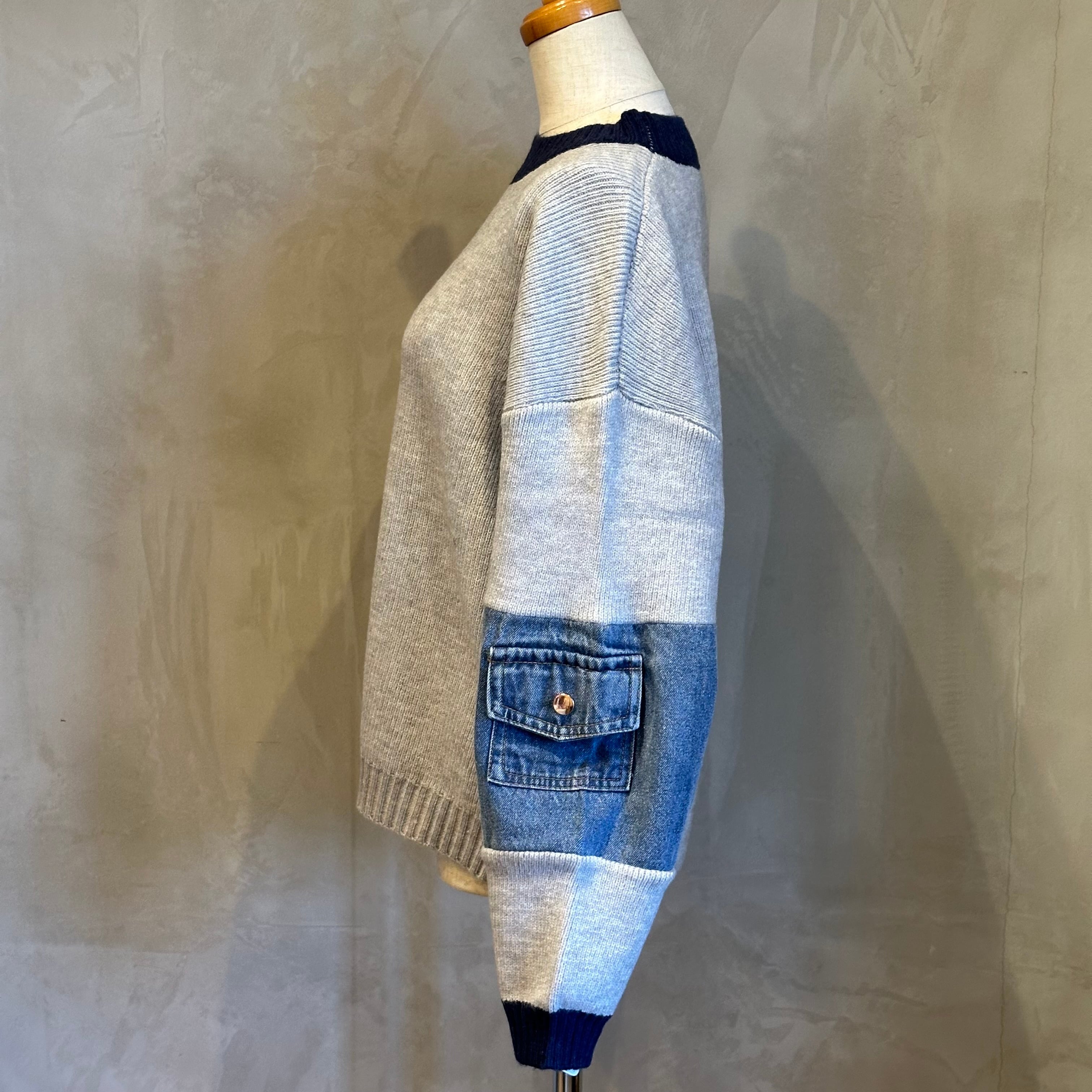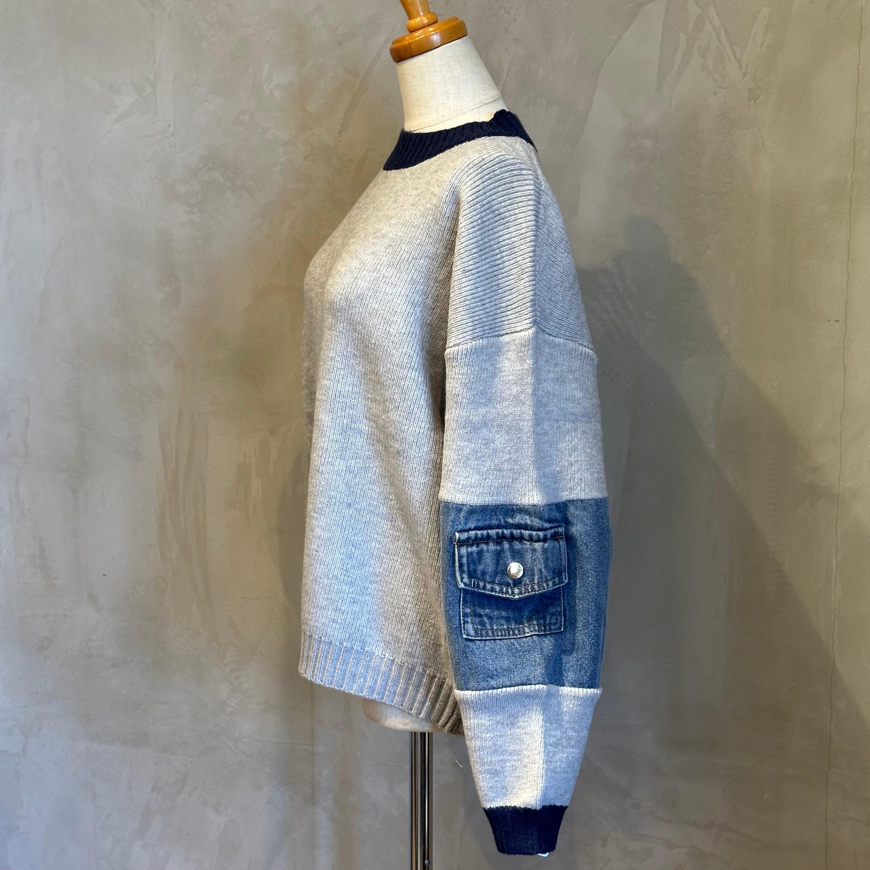 袖のデニムパーツが程よいアクセントになり、シンプルなボトムでも洒落感のあるスタイリングが完成します。