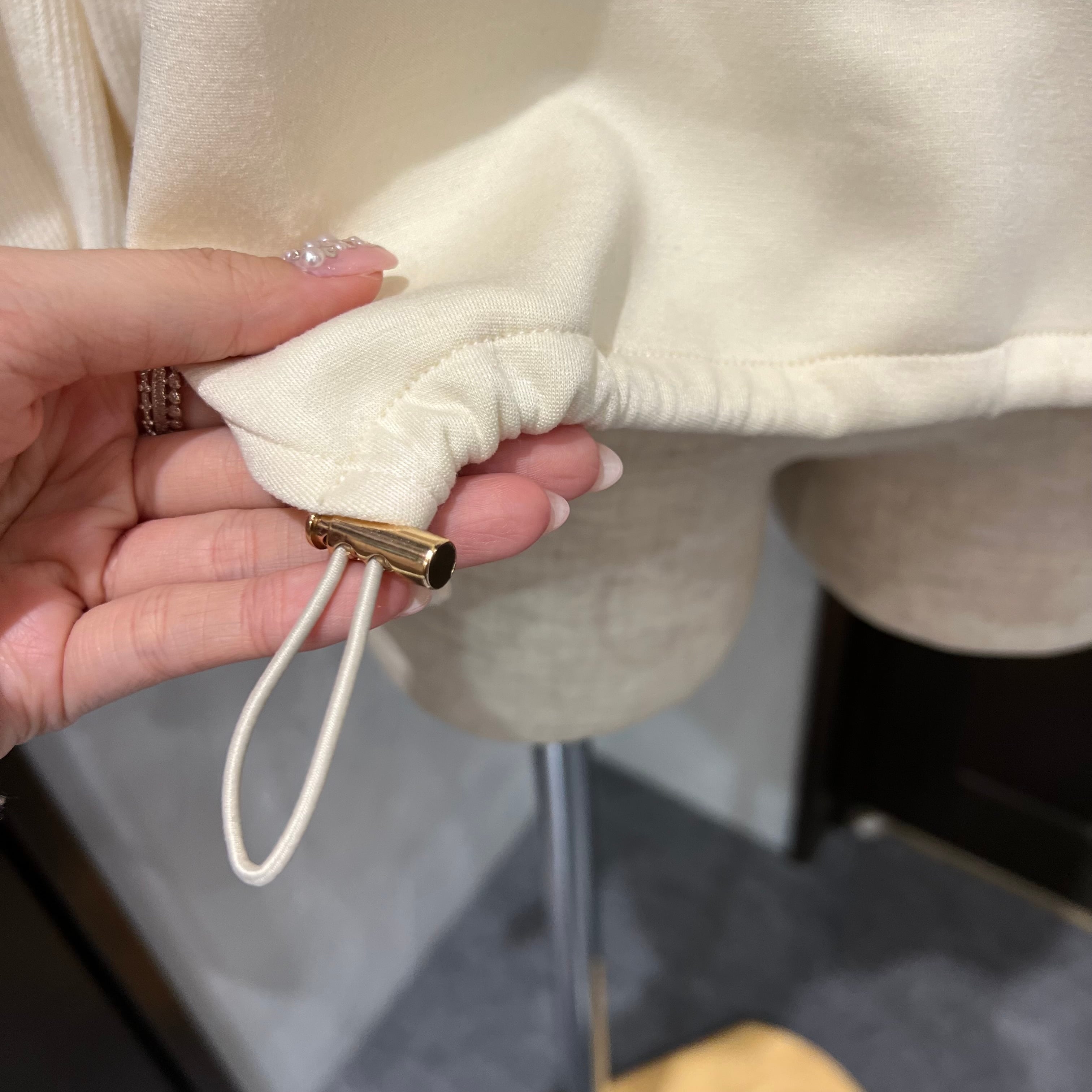 裾にはドローストリング付きで、軽く絞るとメリハリのあるラインに変化します。
