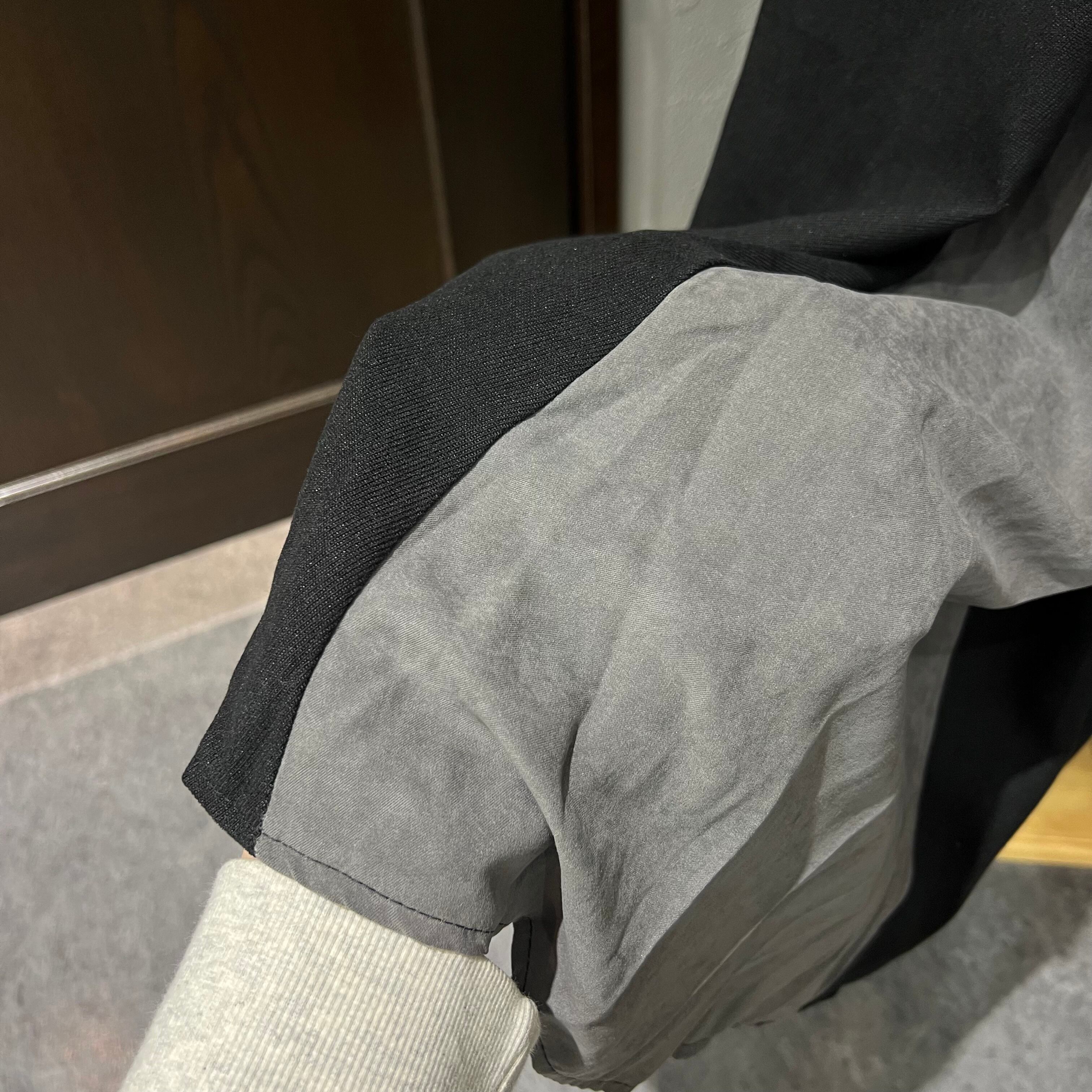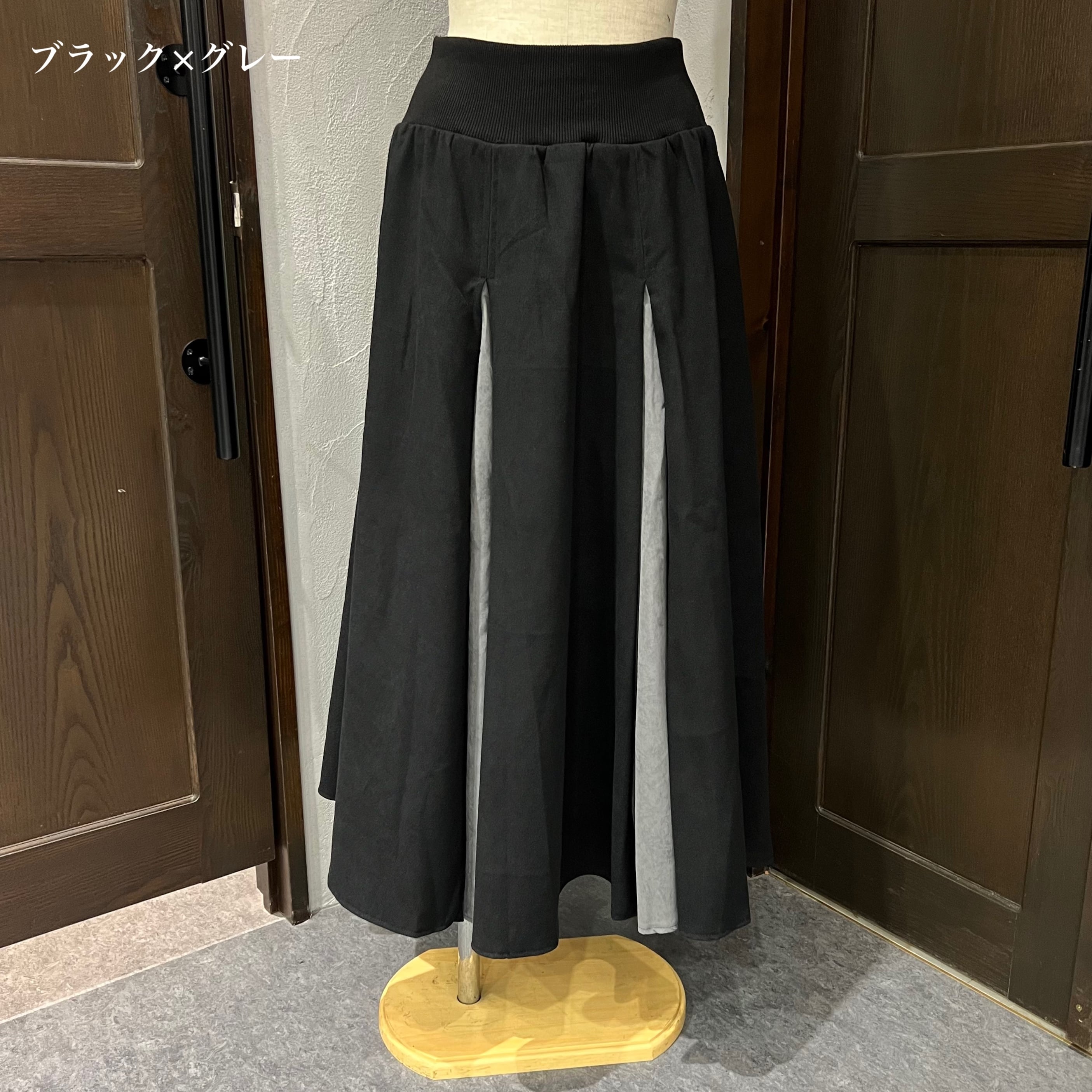 タックの奥に配した異素材の切り替えがポイントで、動きの中でさりげなく見えるコントラストが大人っぽいアクセントに。