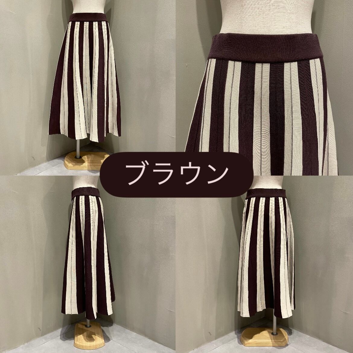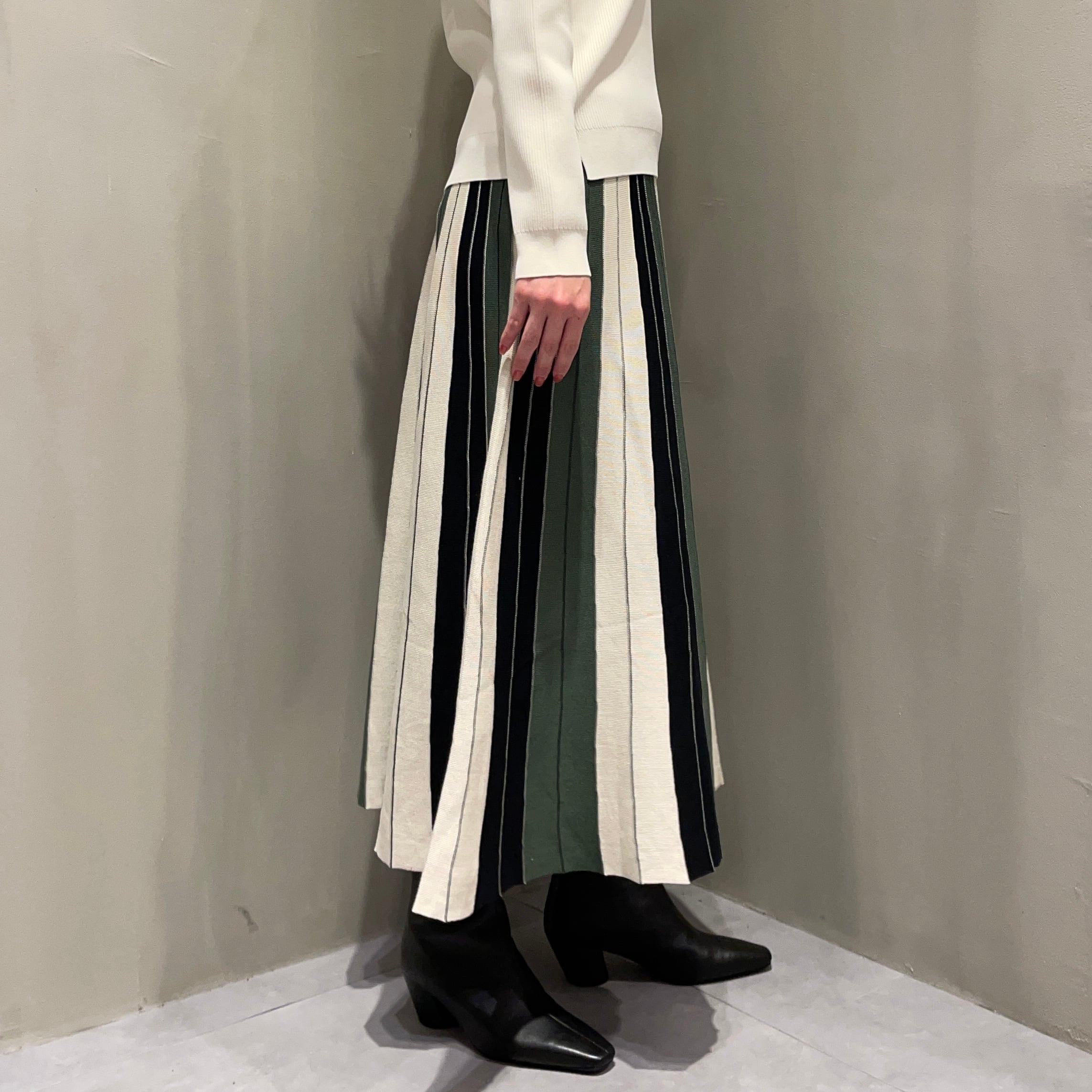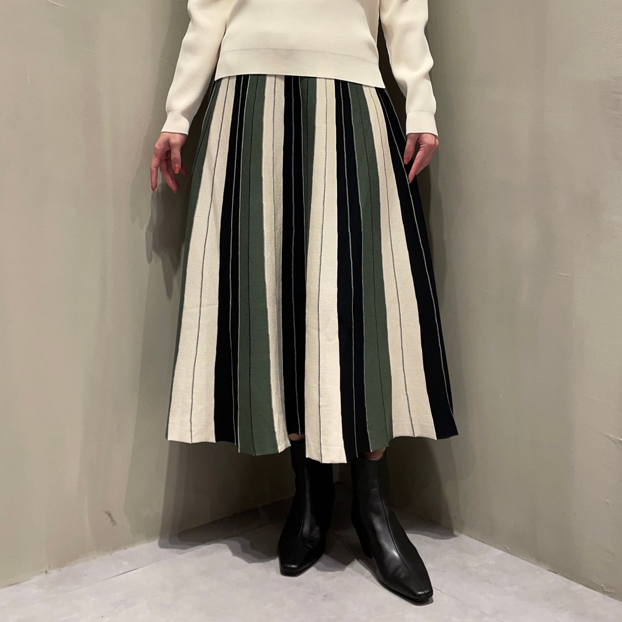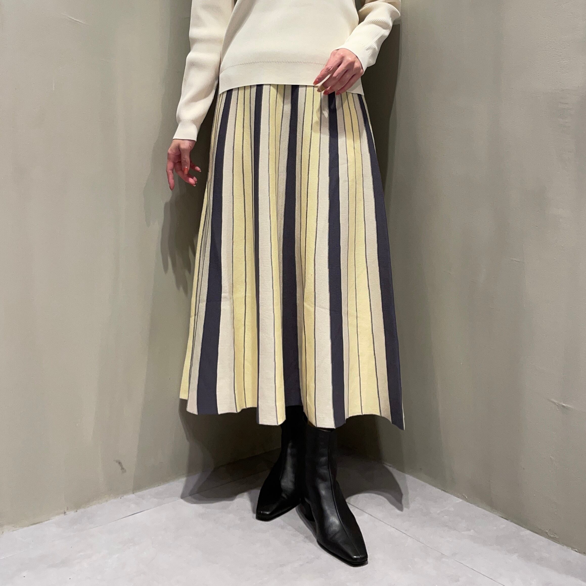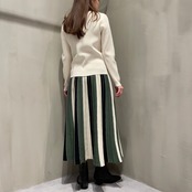 プリーツのように配色された縦ラインに、マルチカラーのストライプ柄を配色したおしゃれ見えするニットスカート。