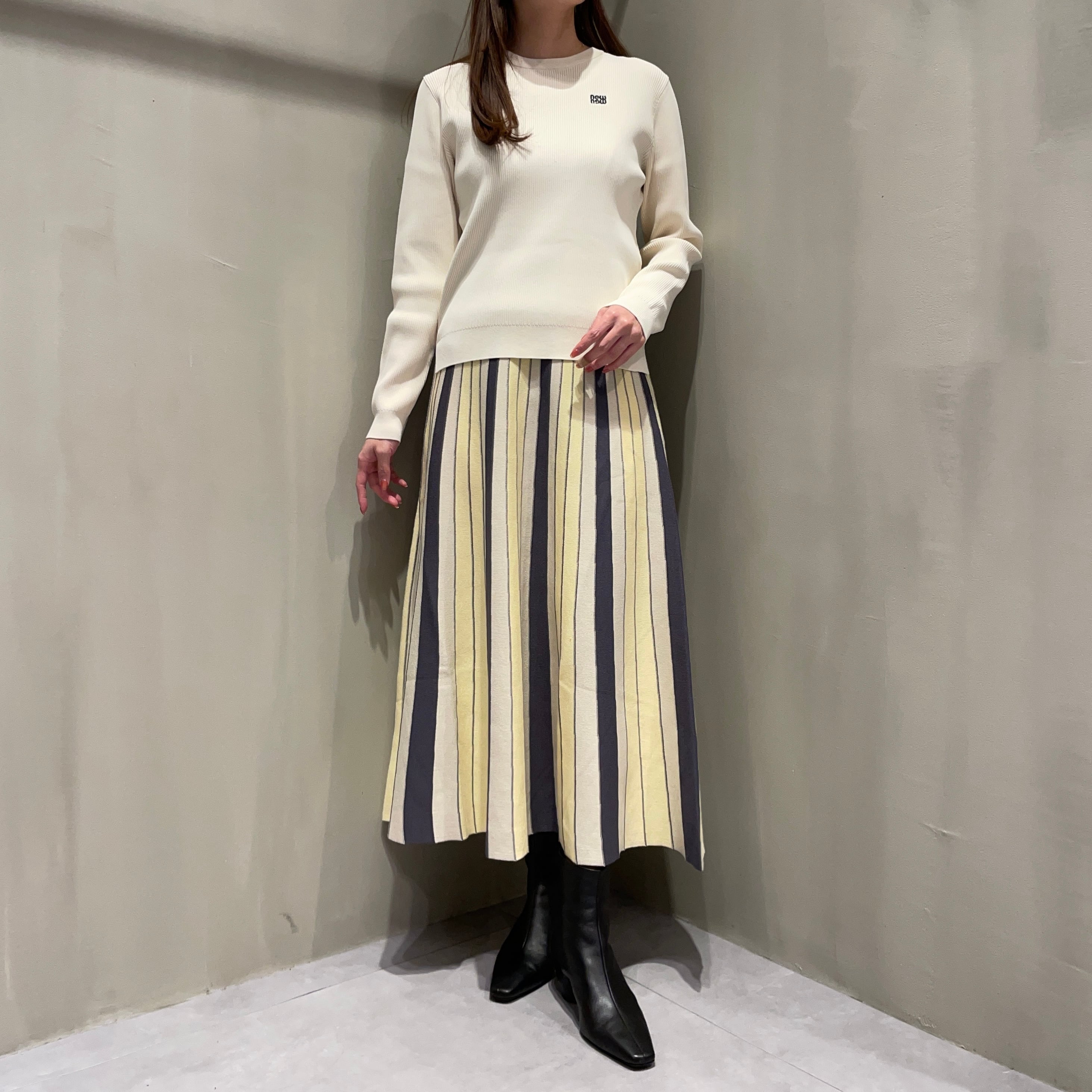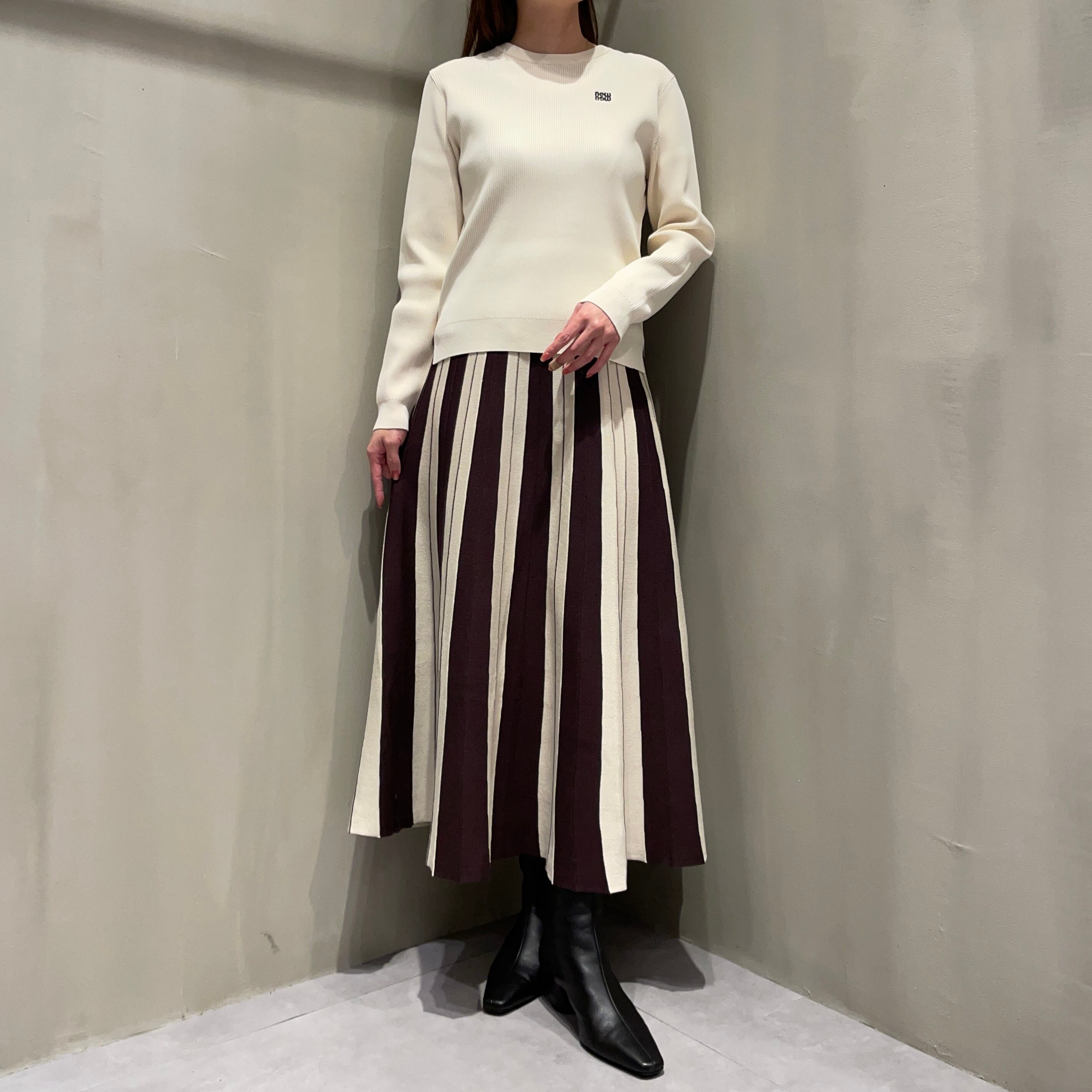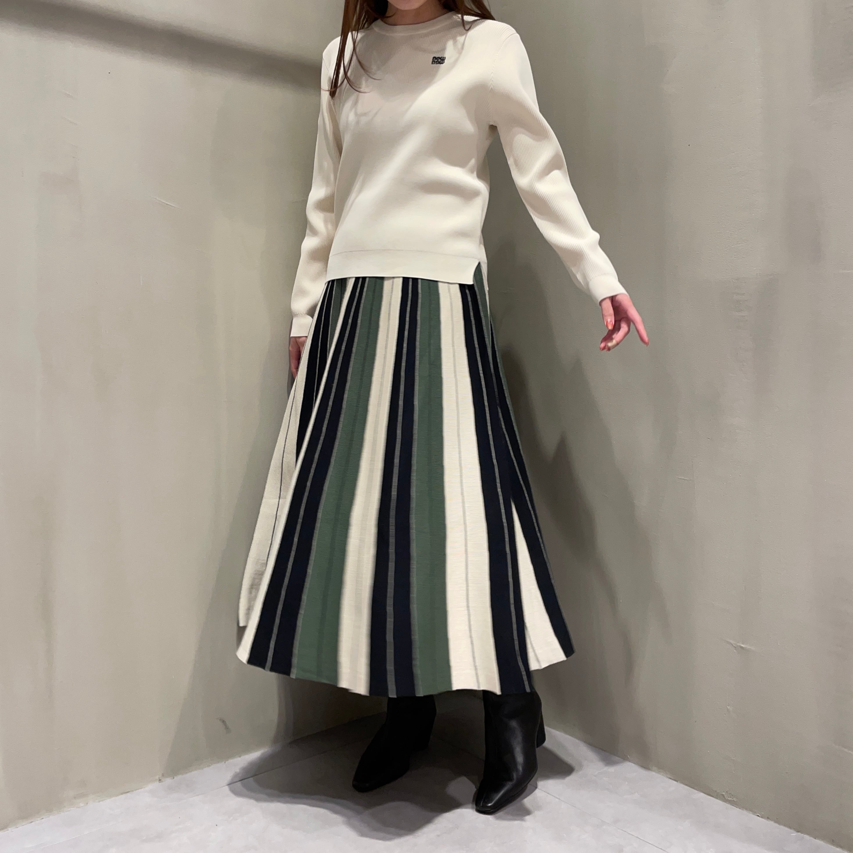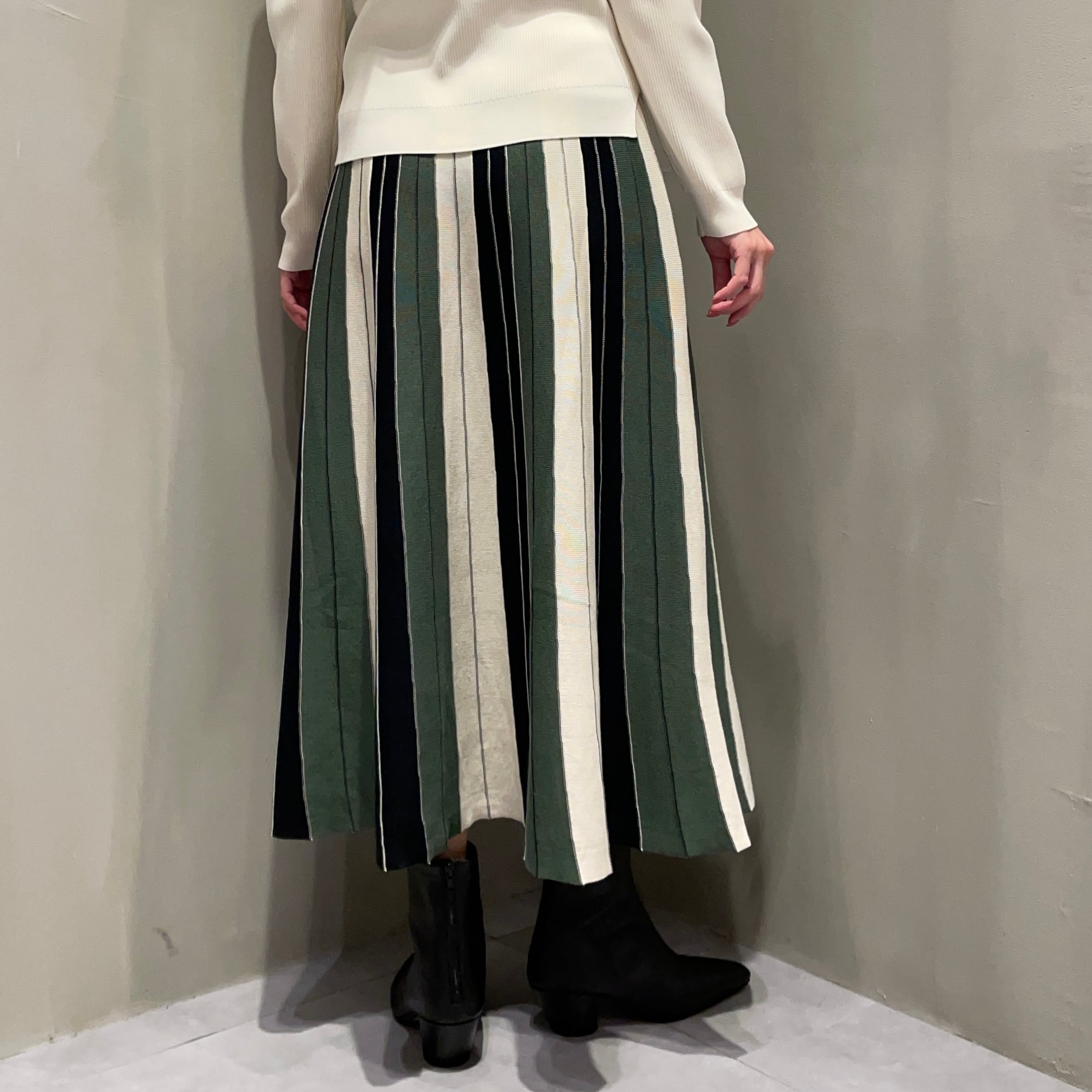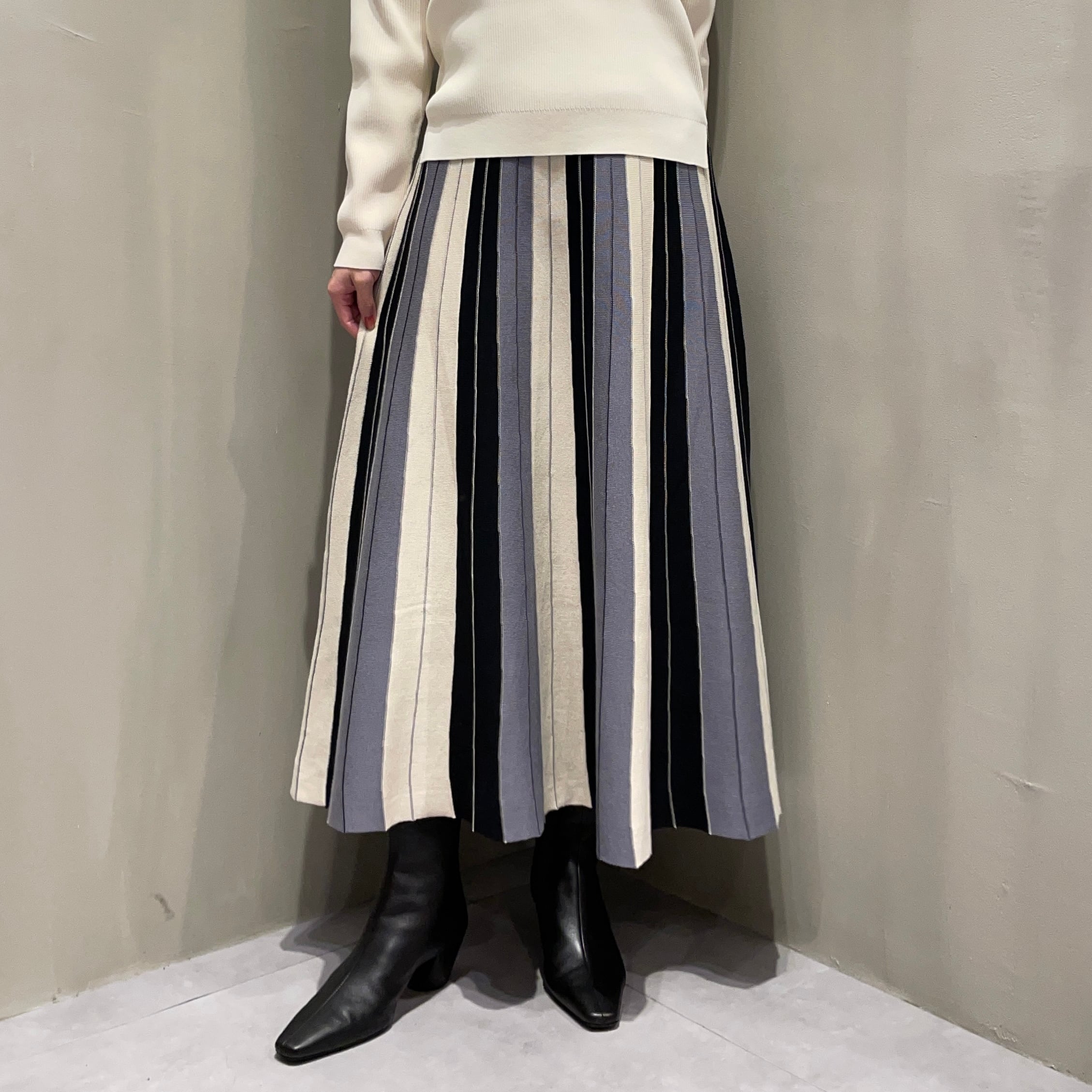 プリーツのように配色された縦ラインに、マルチカラーのストライプ柄を配色したおしゃれ見えするニットスカート。