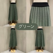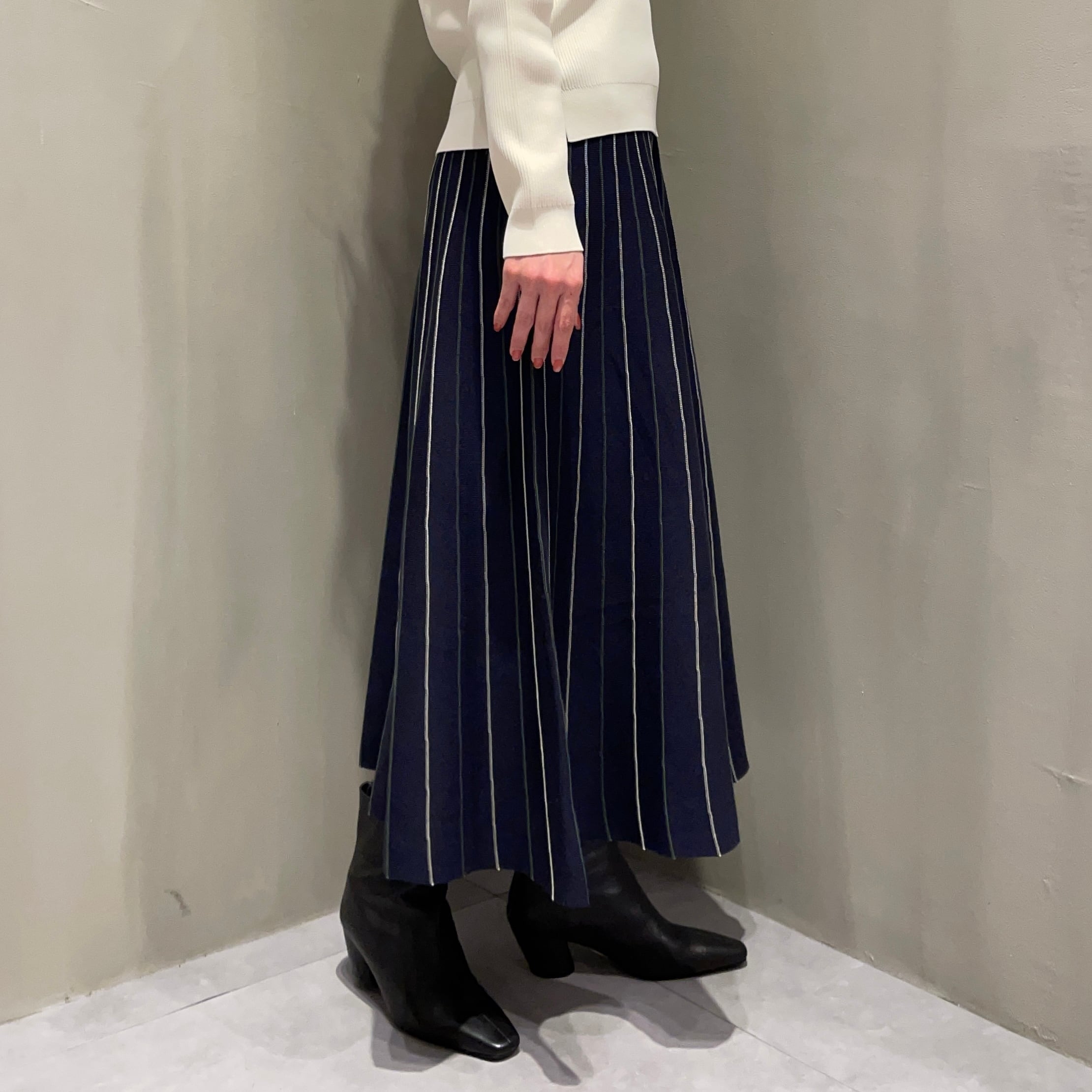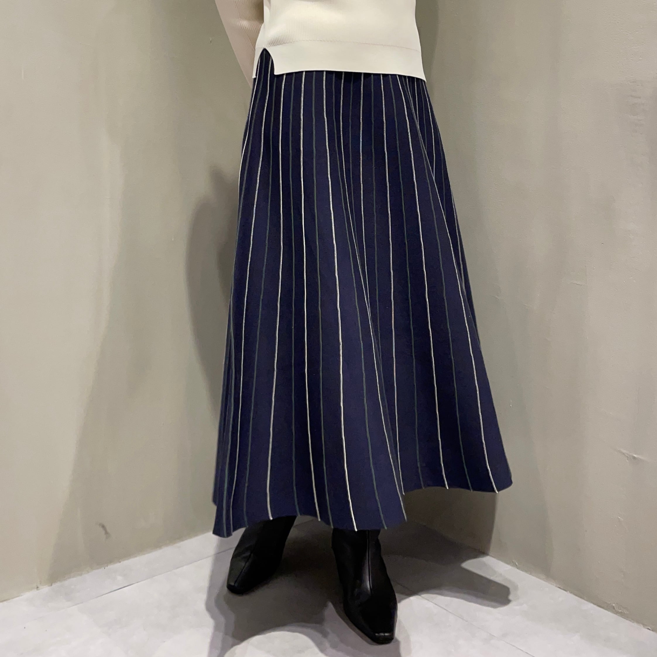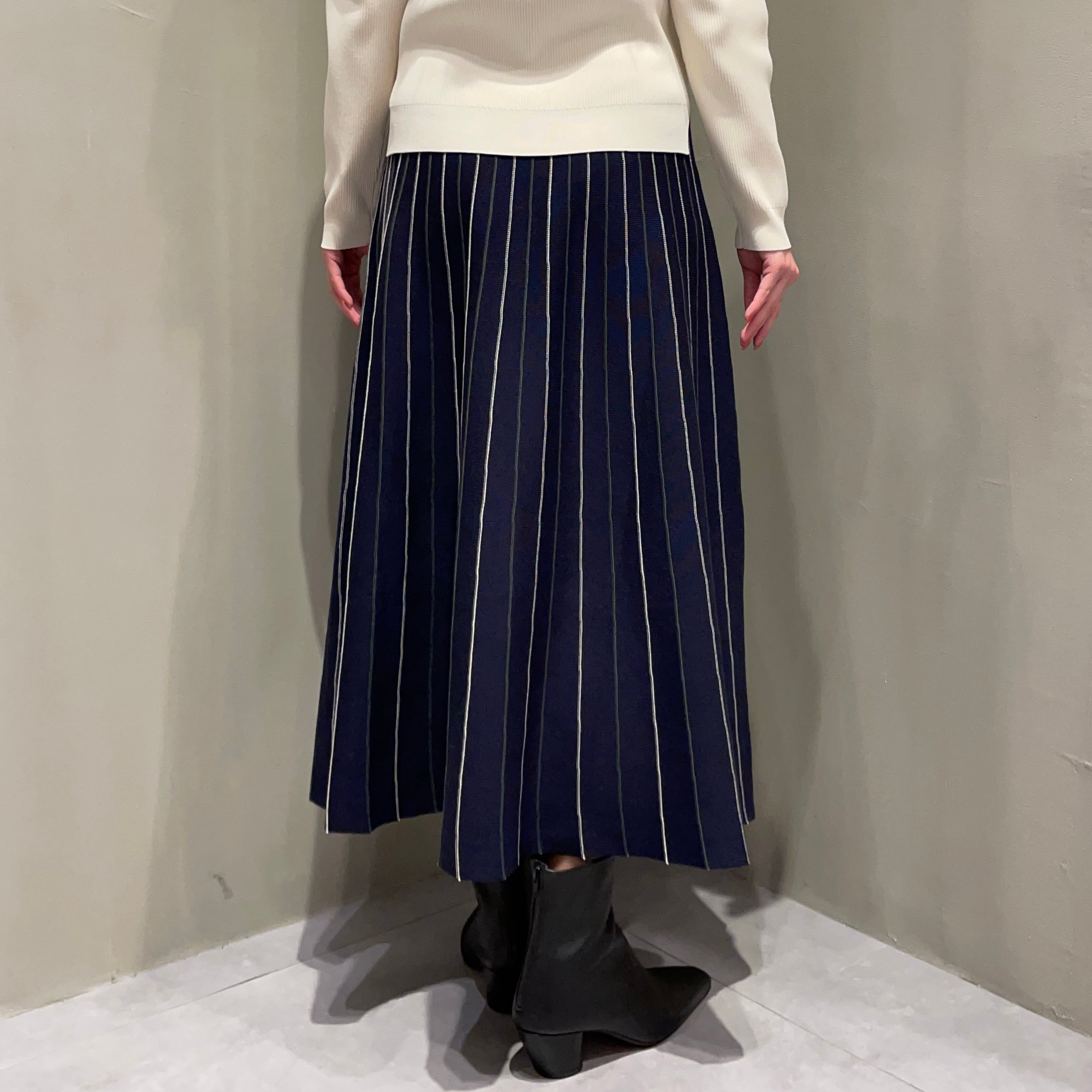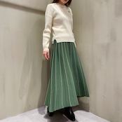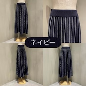 プリーツのように配色された縦ラインに、マルチカラーのストライプ柄を配色したおしゃれ見えするニットスカート。