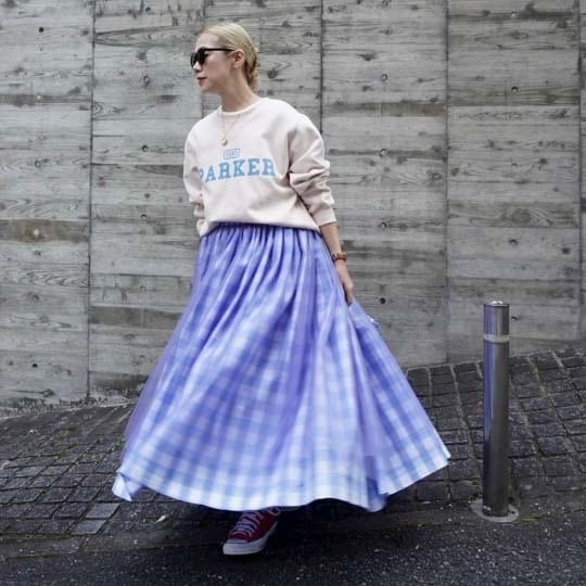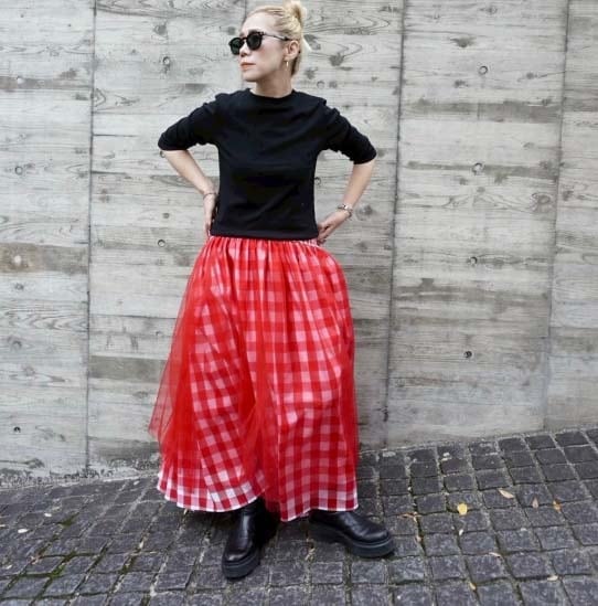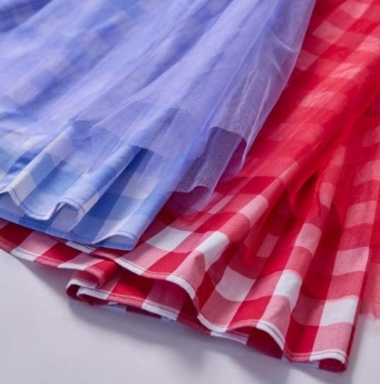 【デザインの特徴:デザイナー 奥村展子】 後ろで紐で結ぶタイプのドレスです。スカートに共紐が付いていて、後ろで調整して結び、長さの調節をします。ウエスト(胸あて)部分は胸に移動させることもできてスカートの丈を変えることが出来るようにしました。大きいギンガムチェックと小さいギンガムチェックのパーツ分けで変化をつけ、上から柔らかめのチュールを2枚重ねて揺れるニュアンスを作ってみました。胸当て部分はカーブしていて少し個性的にしてみました。とても個性的なデザインですが、ボトムなので(顔から離れているので)着やすいのではないかと思います。 スカートのたっぷりしたボリュームがとても個性的です。ギャザーはかなりたくさん入っているため、シルエットが大きく変わらない程度に少し調整して減らす予定です。チュールが重なっているニュアンスもとてもオリジナリティがあり、あまりないデザインだと思い、気に入っています。 正しいサンプルはレッドです。ウエスト(胸上)はシャーリングゴムになっていて伸び縮みが大きく、38サイズは大きめです。36はウエストが5cm小さくなり、スカート丈も5cm短くなります。吊り紐を使わずウエストで留める場合は私の場合は36サイズですが、紐の調節が出来て、ウエストに下げても使えるのでサイズは38サイズにしようかなと考えています。細い方は36サイズがお勧めです。 私はカラーを悩み中ですが、とてもオリジナリティのあるデザインなので、押さえておきたいなと思っています。ギンガムチェックのお洋服はあまり探せないので、お好きな方はぜひにご検討ください。とても自信作です。