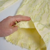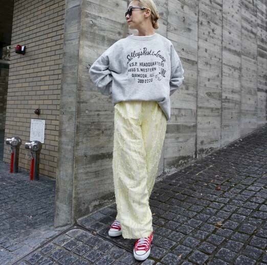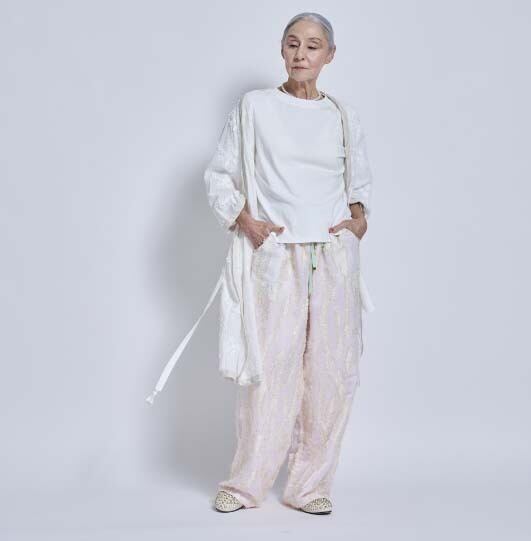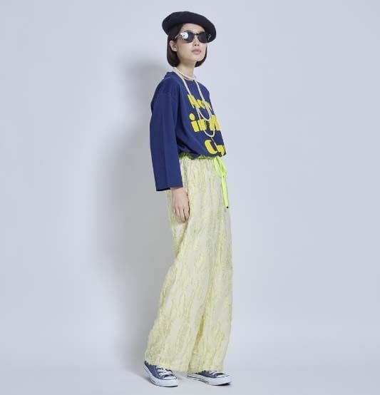 【デザインの特徴:デザイナー 奥村展子】 毎年、イージタイプのゴム入りパンツは体型を選ばないので、かなりの生産数でヒットしている人気アイテムです。 今回は薄い蛍光のようなジャガード織の雰囲気あるカットジャガード素材。織りで目を飛ばして、糸を出し、出た糸をカットしてリーフ柄を表現しているテキスタイルを使いました。 違和感のある糸の出方がとても可愛かったのでストレートのイージーパンツを作ってみました。ストンと落ちるオーバーサイズでウエストはゴム+ドローストリングの紐で締めることができます。細い方にもドローストリングの紐が付いているので、サイズ調節が可能で色々な体型の方に幅広くジャストフィットします。特にサイズを気にされるグラマラスな体型の方にはとても向いています。 着丈はやや長め。38サイズは36サイズと比べると丈は3cm長くなります。ウエストは蛍光イエローのベルトにしていてポイントになるカラーリングにしました。 バターイエローカラーは今とても気になるカラーです。アイテムに真っ黄色は抵抗があっても薄いイエローはポイントになって素敵かなと感じました。 イージーパンツがお好きな方はぜひチャレンジしてみてほしい素敵な素材です。