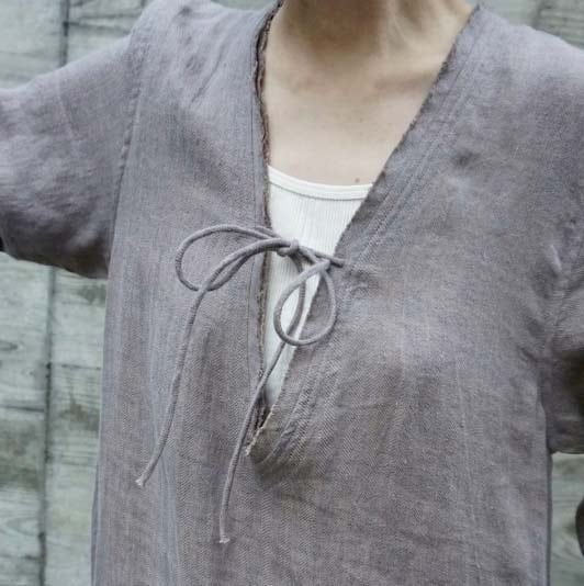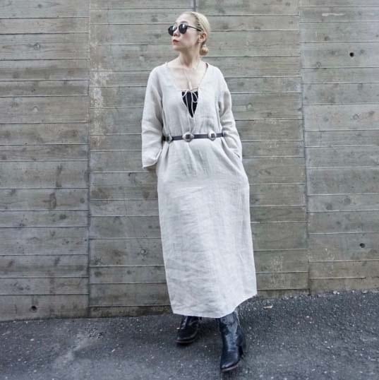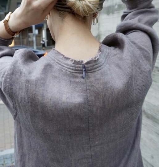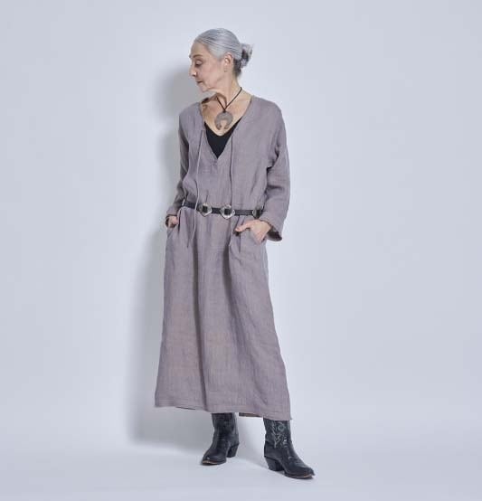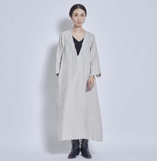 サンプルはありませんが、#NAVYもおススメです (インディゴ染めのような色目です) 【デザインの特徴:デザイナー 奥村展子】 リネンジャケットと同じ素材でセットアップにできるドレスです。長袖ですが、真夏の暑い日にも涼しく着ることの出来るリネンのドレスは、本当にあると便利です。最近は真夏日が長く、秋になるまでとにかく暑い日が続きます。そんな時にウエストの締め付けがなく、涼しく着ることができる真夏のお役立ちアイテム。切りっぱなしに見えるように工夫を凝らして、縫製工程を考えています。袖口や裾、ネック周りに同色のステッチワークが施されており気品があり、とても気に入っています。Vネックの開きはかなり広めです。キャミソールなどを着て合わせてください。Vの開き部分についた丸紐も作ってもらいました。細くて丸い共紐も魅力の一つです。この部分もこだわりを持ってデザインをしてみました。 見た目よりもゆったりしていてストンと落ちるIラインです。身頃のサイズは106cm程度あります。私のデザインする真夏のワンピースは常にたっぷり、ゆったりを特徴としていましたが、今回は大人が着てかっこいい雰囲気になるIラインのシルエットにチャレンジしてみました。後ろ中央にスリットありで、足さばきもしやすく動きやすいスカートにしました。ゆったりめを好むグラマラスな体型を自負しているというスタッフにも良いバランスで着用できると試着の感想をもらいました。 リネンのお洋服は、素朴感が出るので、シルバーのアクセサリーなどと合わせてみると、非常に雰囲気良くまとまりました。夏にノースリーブに抵抗のある方(私です)、でも涼しく過ごしたい方、また真夏は暑さ対策に講じてしまい、おしゃれからも縁遠くなってしまう方々も多いと思います。その点の解決策はこのドレスかなと感じました。今時期は冬に向かっているので、思い出せないですが、このデザインは真夏に行いました。いかに心地よく、日焼けせずに過ごせるのか、を考えたデザインになっています。ヘリンボーンリネンがとてもリッチな雰囲気を醸していると感じています。パープルは縦糸と横糸の色味が微妙に違う為、とても雰囲気の良い上質感も感じられるカラーです。 シューズはレザーのサンダルや、ハイテクのスニーカーなどにも合わせられました。(画像参照) 私は、アイボリーを購入予定です。本当にとても使えるので、もしリネンがお好きな方はぜひご検討ください。2万円代のプライスも魅力です。きっと後悔させないと思います。