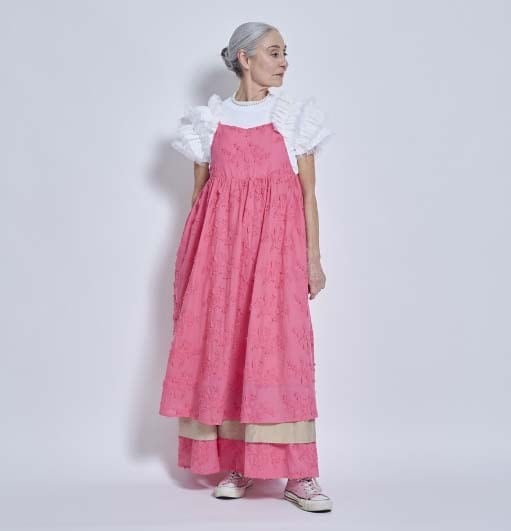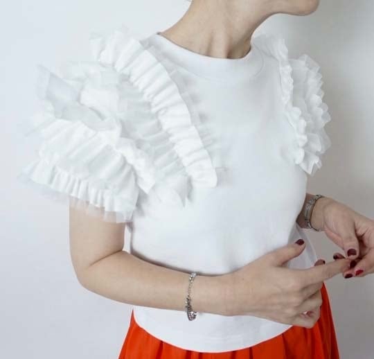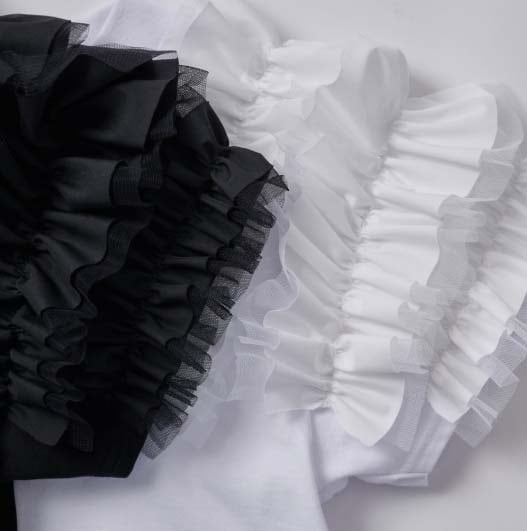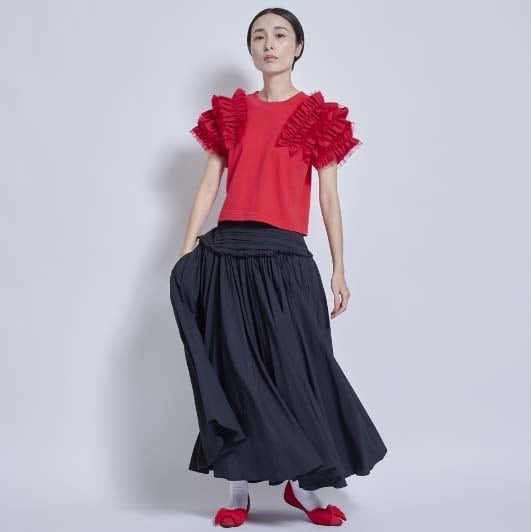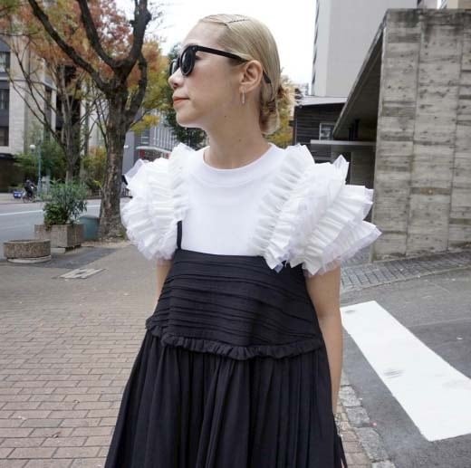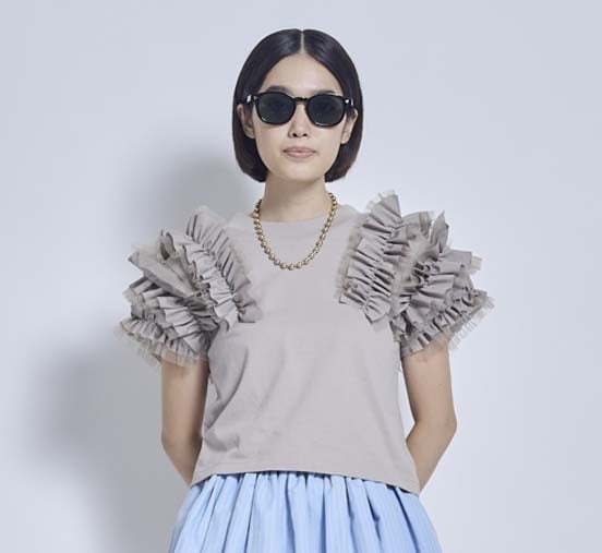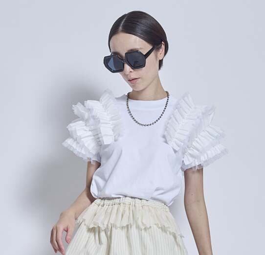 【デザインの特徴:デザイナー 奥村展子】 着丈が短めのカットソー 今回はスカートに合うカットソーが作りたくで、チャレンジした新型のカットソーです。今回、袖のフリルの付け方には非常に苦労しました。方向が定まらず、やり直しをしながら、チュールとコットンのシャツ生地をミックスさせてボリュームフリルを付けてみました。ストラップタイプのスカートやドレスのインナーに、タンクトップやノースリーブではなく袖があるものが作りたいなとも思いました。モデルのルックにもあるように、肩紐のあるドレスに、フリル部分にピッタリと肩紐のバランスが合うよう付けてみました。Tシャツで涼しくて着心地が良い。着丈は折り返す必要がないので、トップスを短めにしたい日にピッタリ。他にはないデザインかなと思います。 着丈は短いように見えますがウエストよりも下になります。短すぎることはなく、スカート派の方に非常に向いています。また着丈が長いトップスはパンツに入れるのはごわつきが出てしまうのが悩みでした。今回短くすることで、足が長くみえ、ボトムの中に入れずに着ることができるのが魅力。新しい試みです。 また袖は長くありませんが、意外にもほっそり見える効果があり、これはちょっと嬉しいなと思いました。 おすすめの黒と白。どちらもとても使いやすいカラーだと思います。紐付きのドレス(ギンガムチェック)や2WAYドレスの肩紐を出してドレスタイプにして使う日に合わせたいトップスです。着心地もとても良いです。