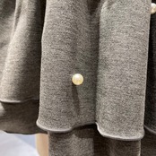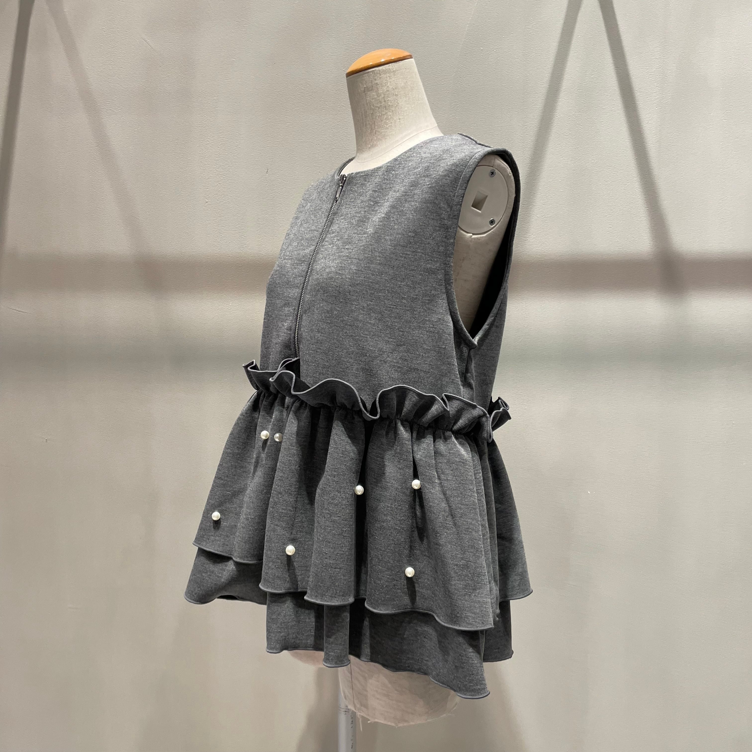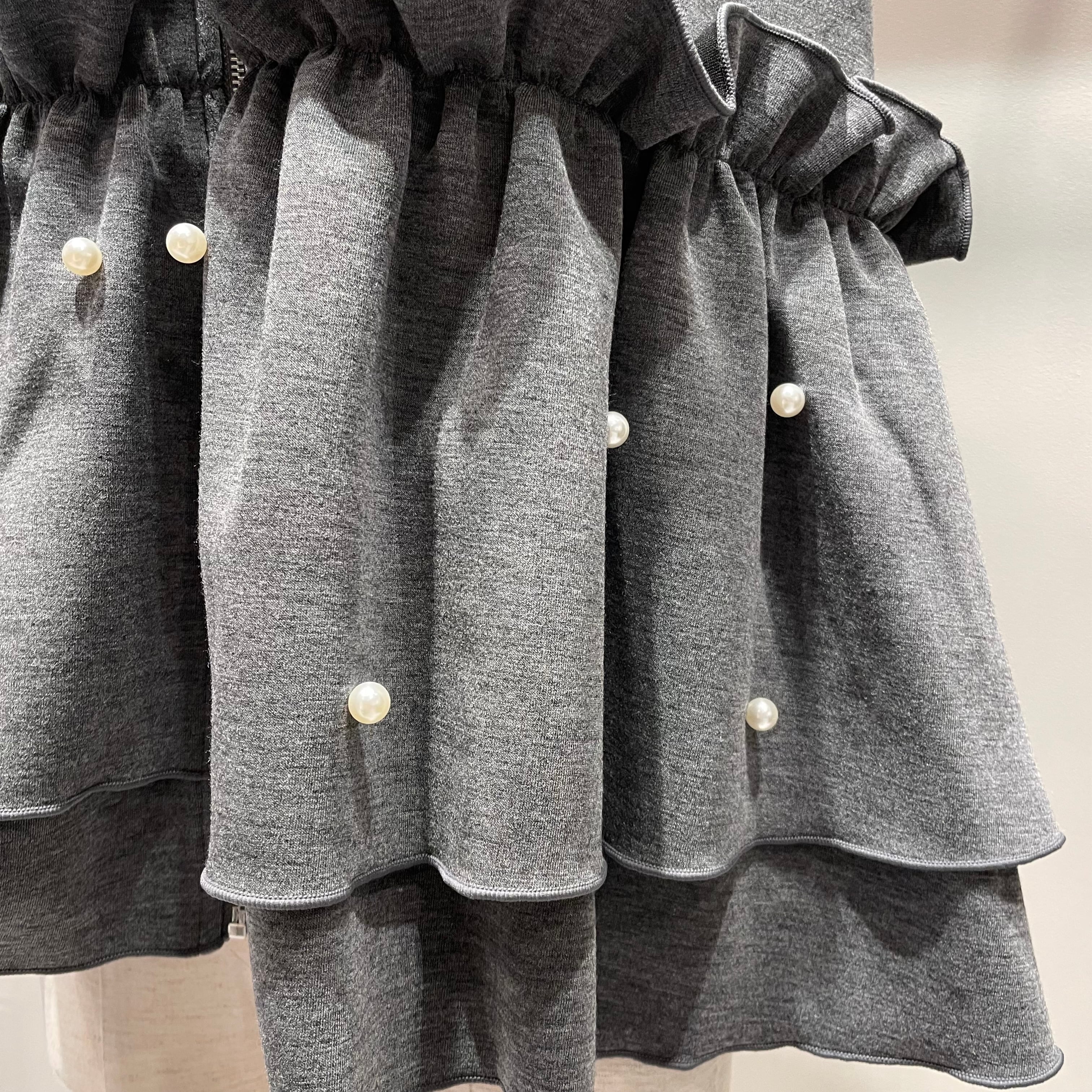 ウエスト部分で切替られペプラム風のシルエットに切替より下部分にはランダムにパールを施して1枚で着映えします。