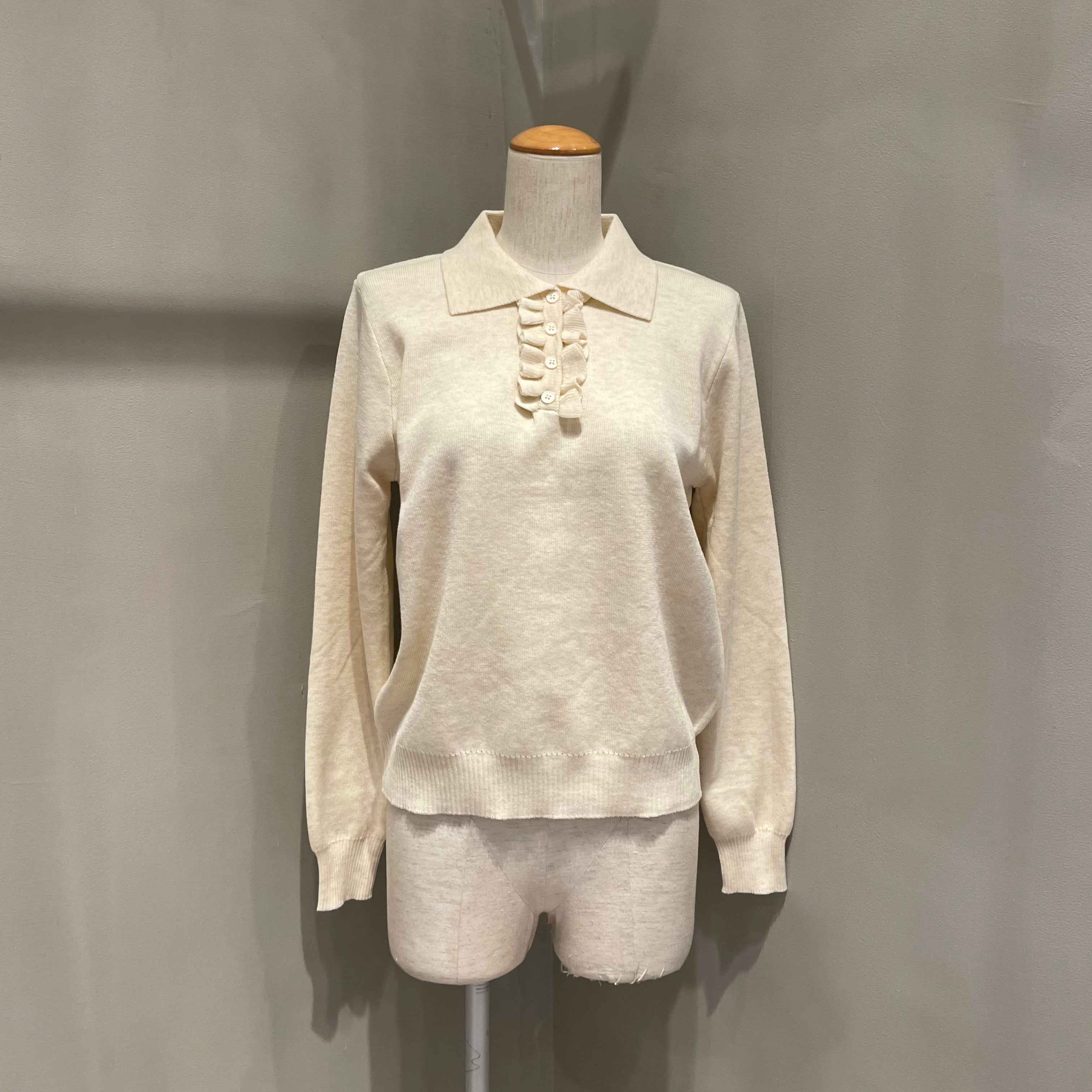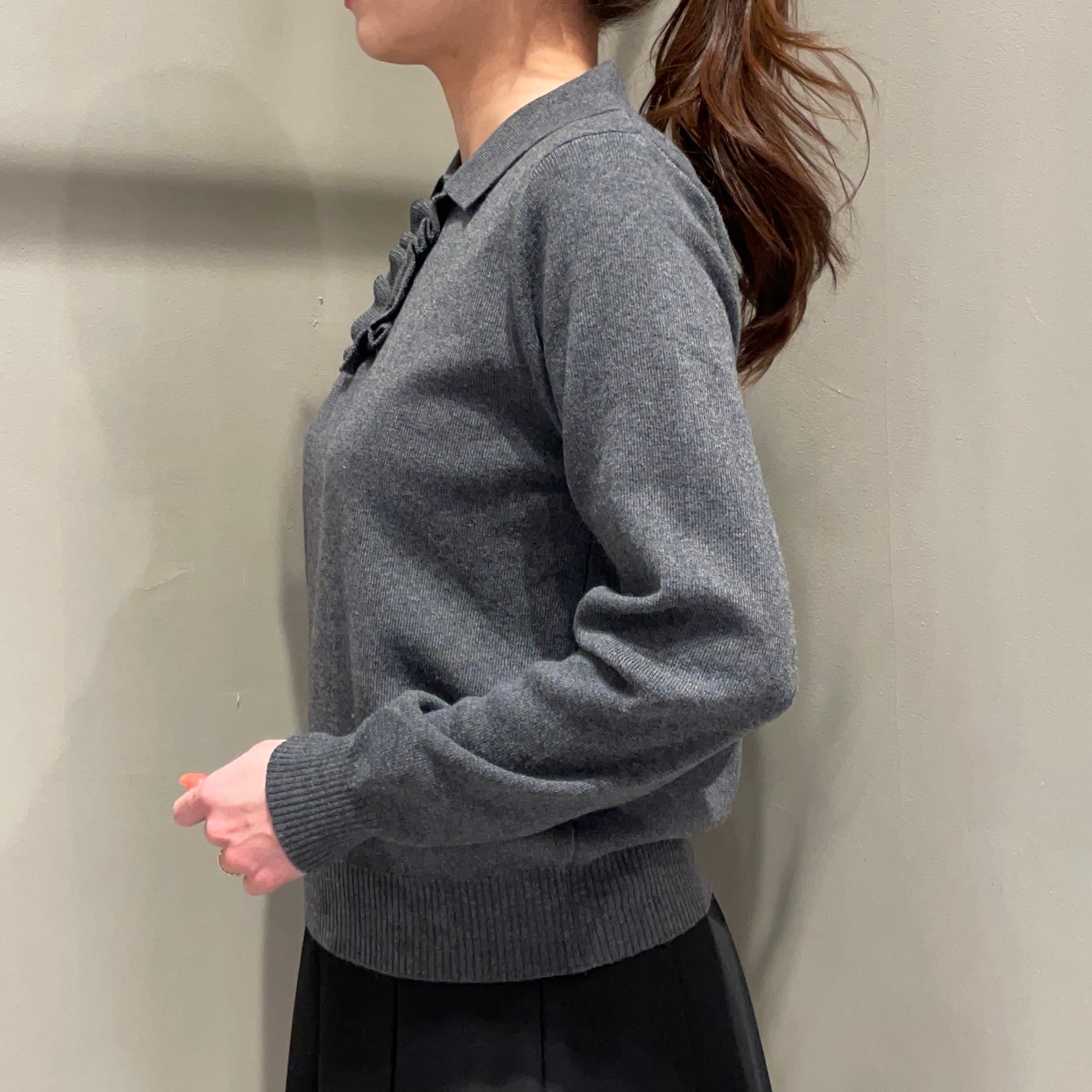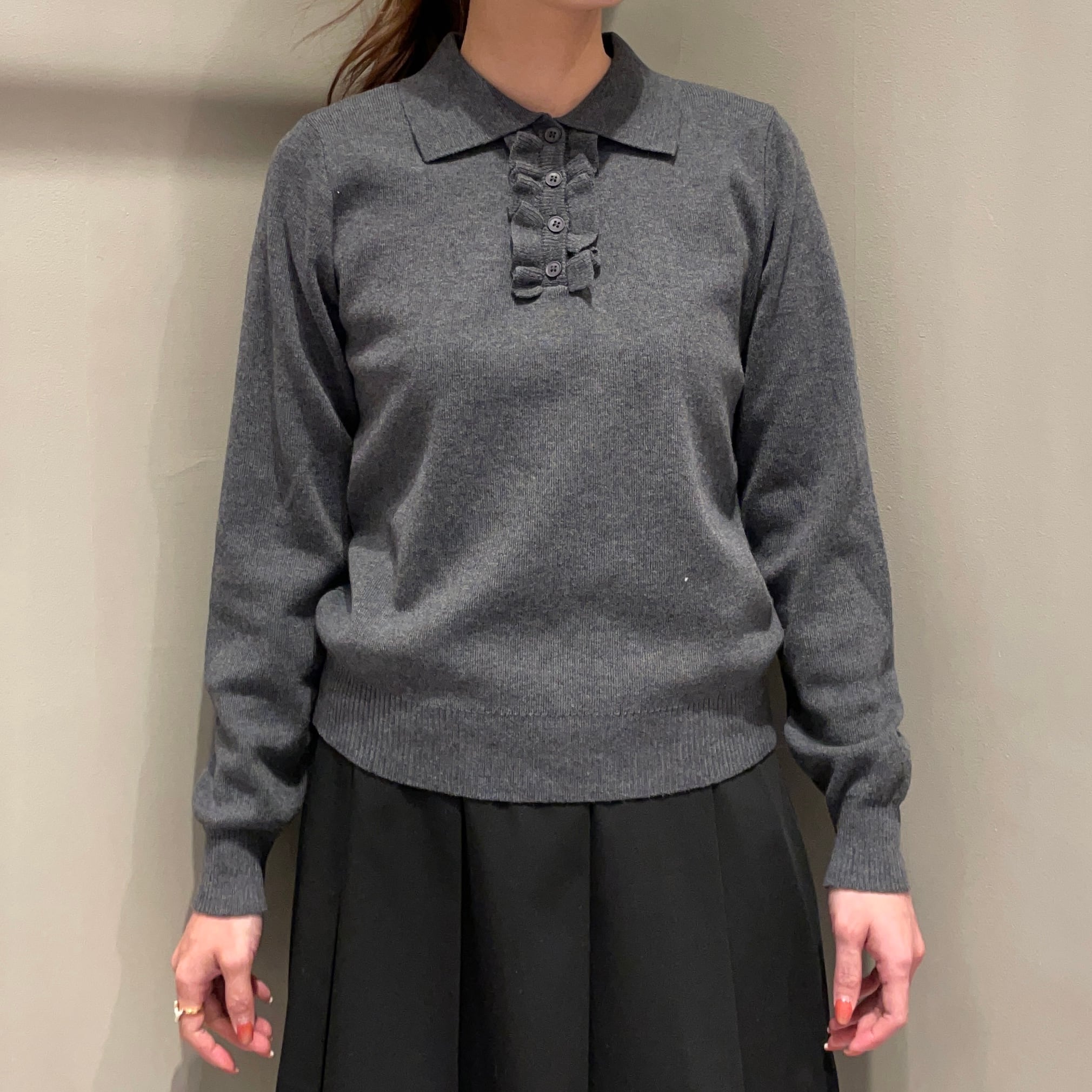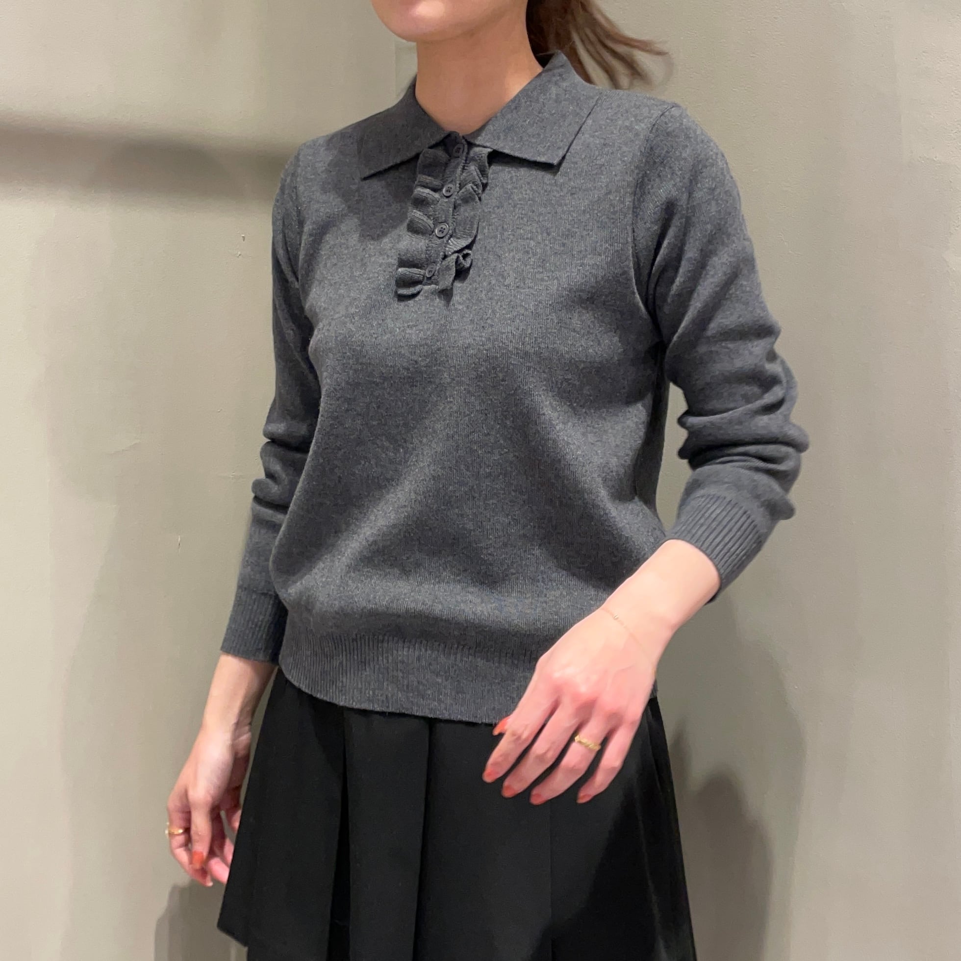 シンプルなポロニットにさりげなくガーリーさをプラスした、大人かわいい一枚です。