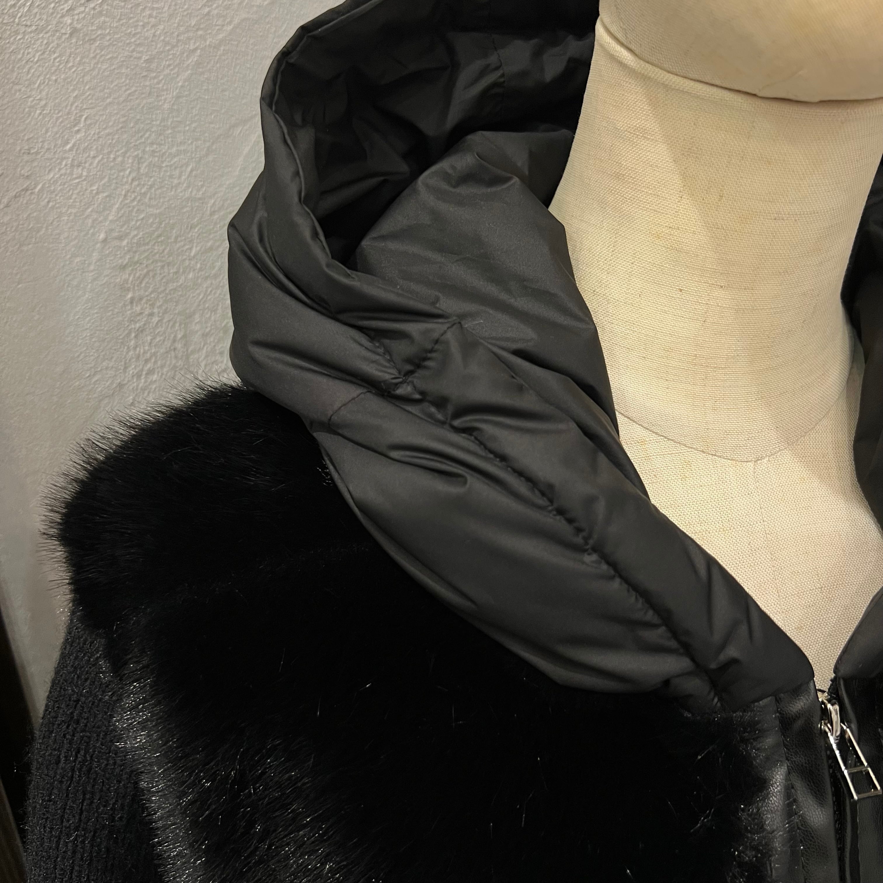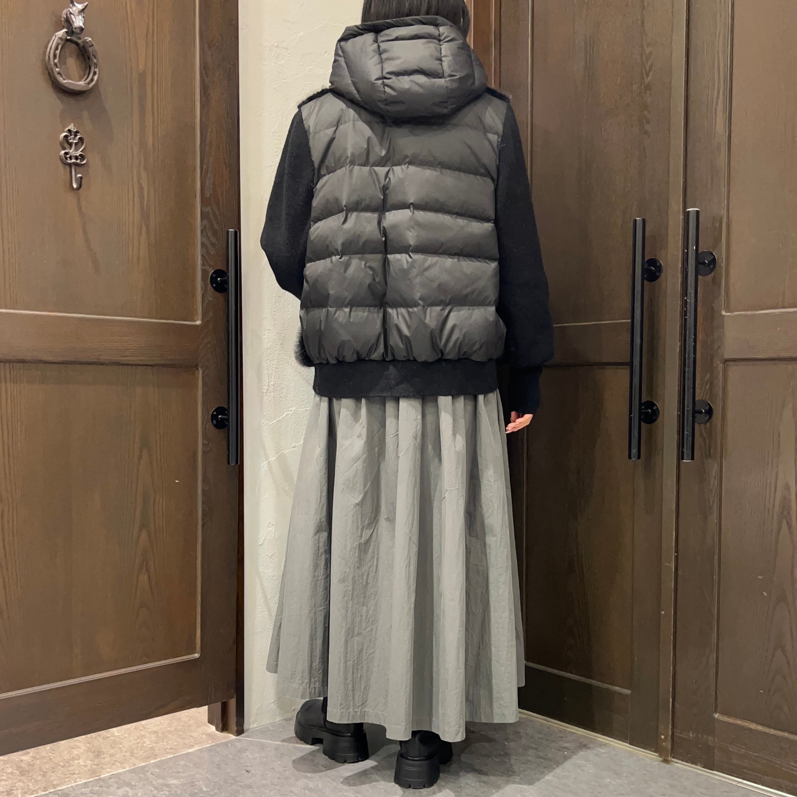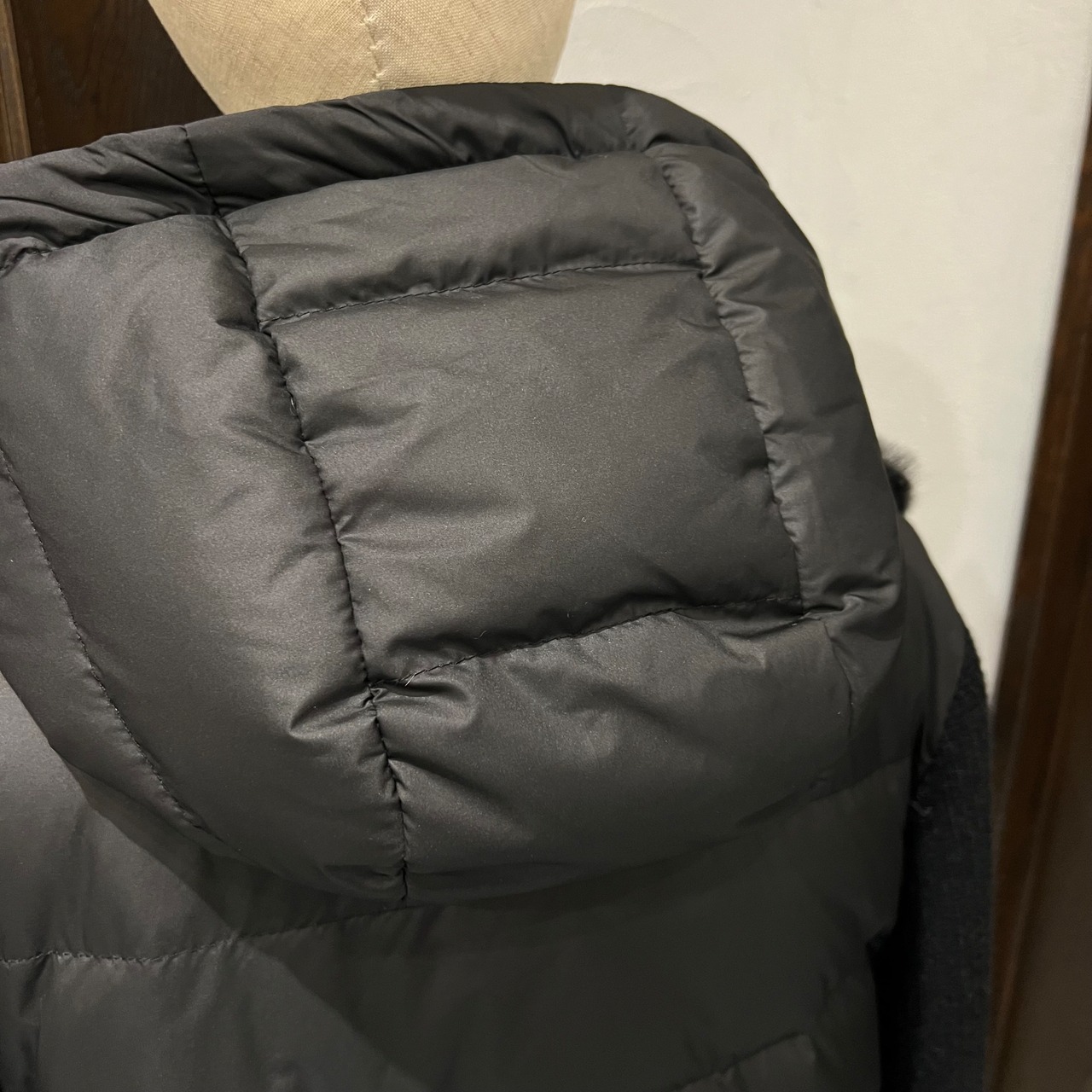 フード部分は程よい光沢のあるナイロンで、カジュアルになりすぎず大人っぽく着られるバランスがポイント。