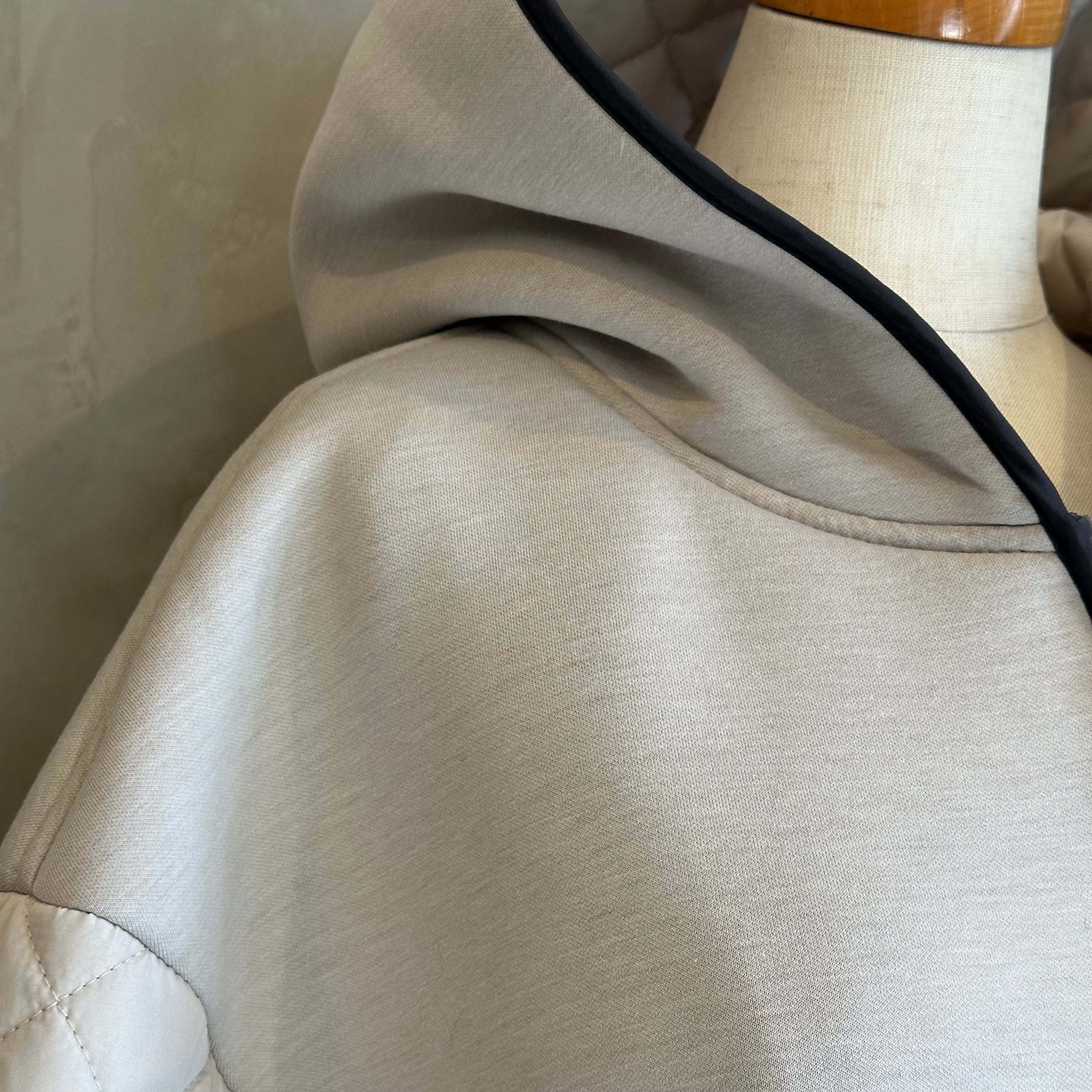同色の素材切り替えに配色パイピング、ビッグポケットが拘りのデザインです。