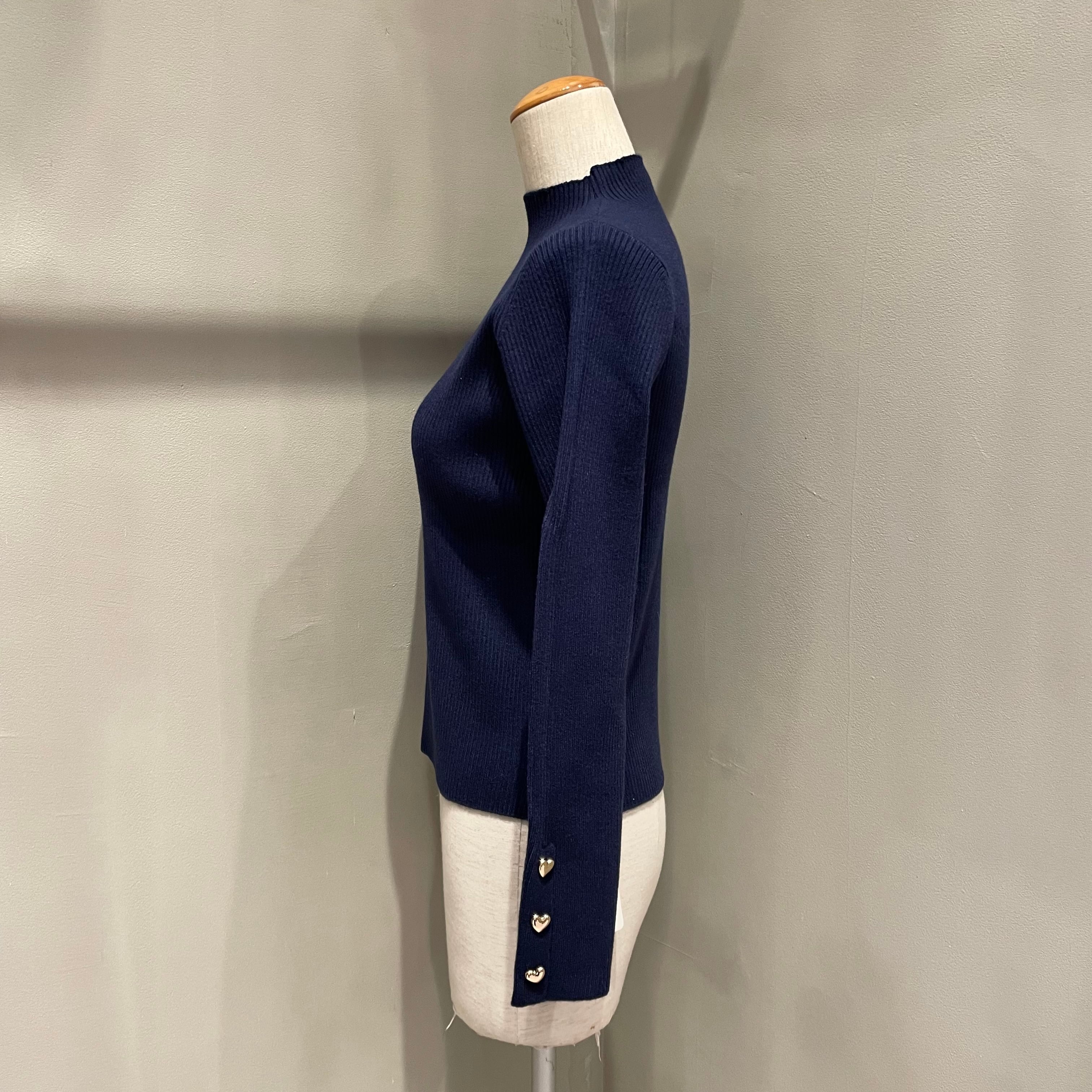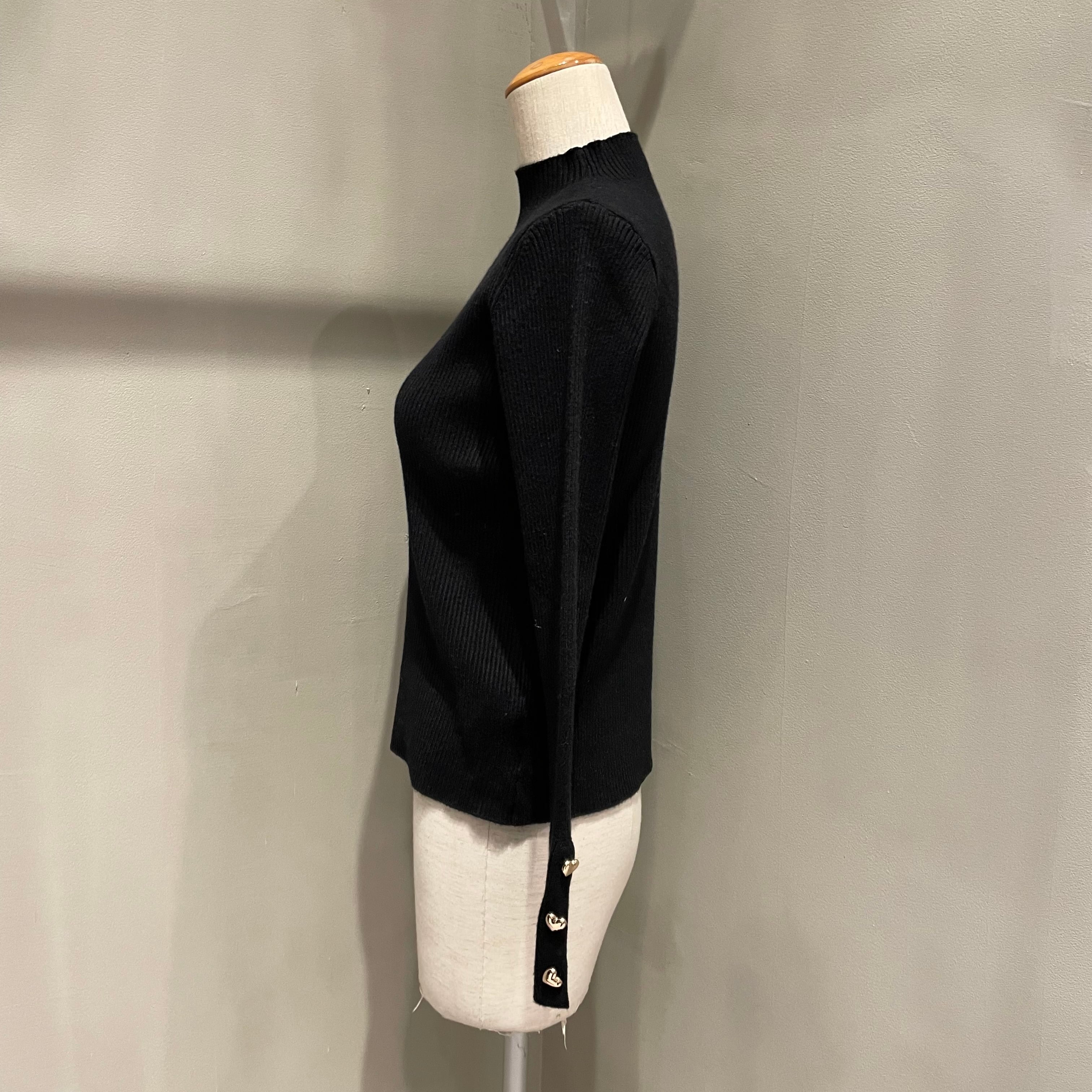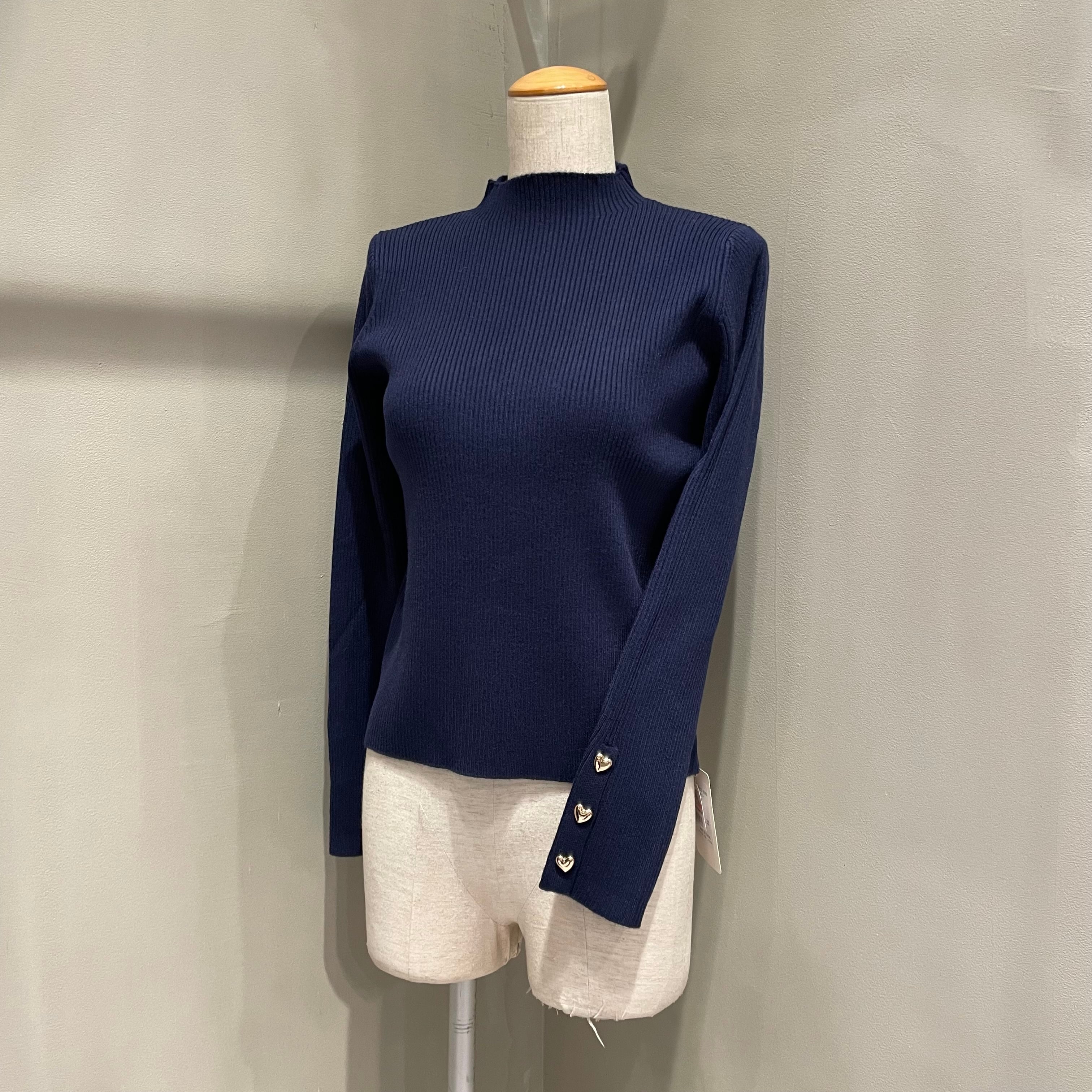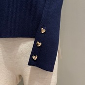袖口のハート型のゴールドボタンでキュートなアクセントを加えたハイネックニットトップス。
