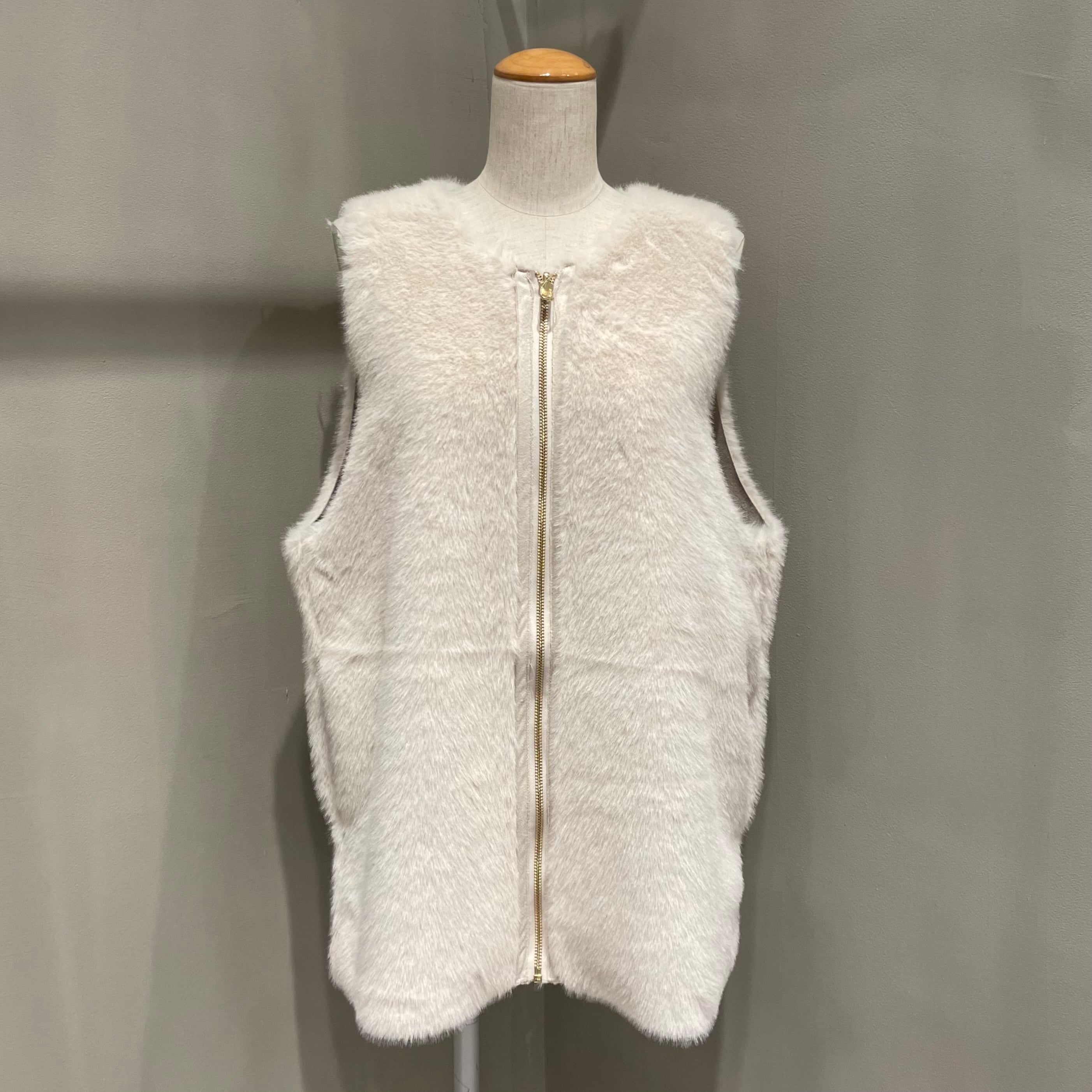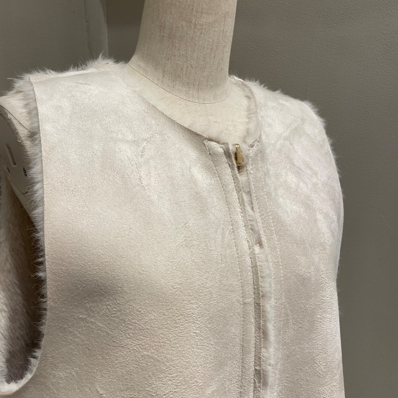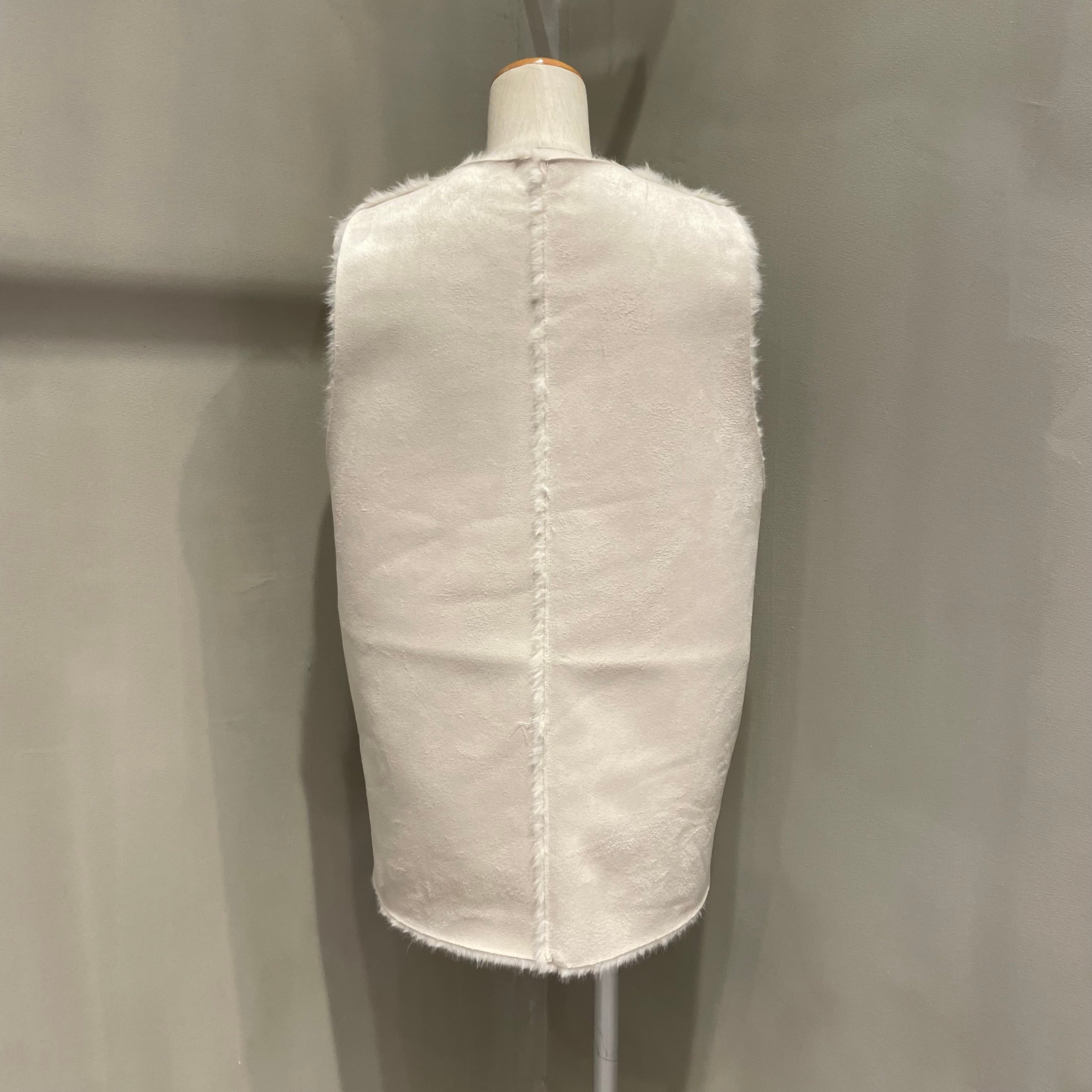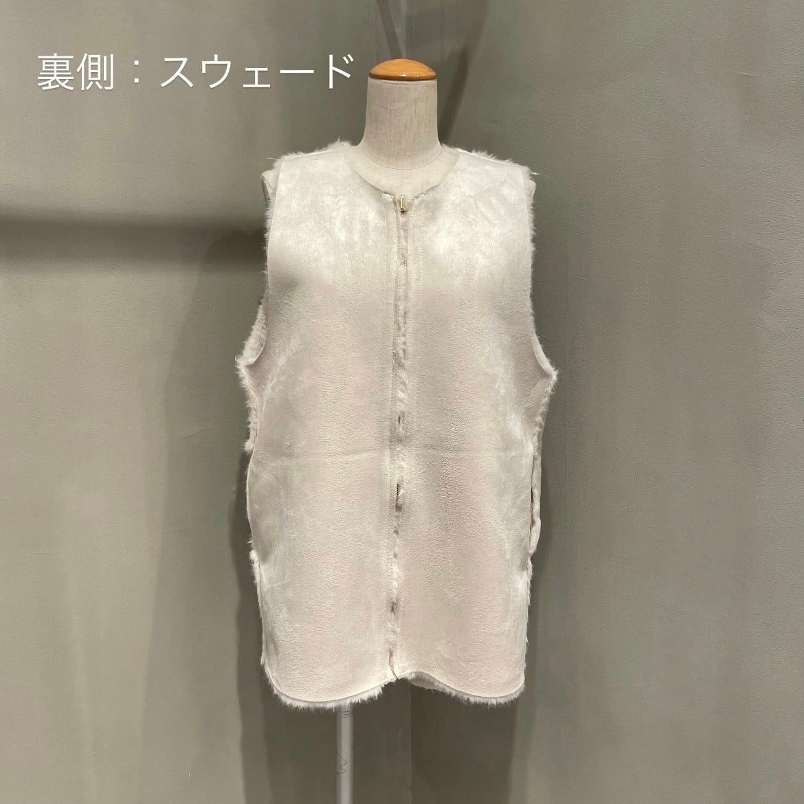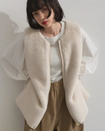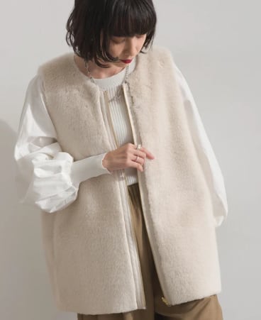 ラビット風エコファーとフェイクスエードのリバーシブル仕様で、1枚で異なる表情を楽しめるベスト
