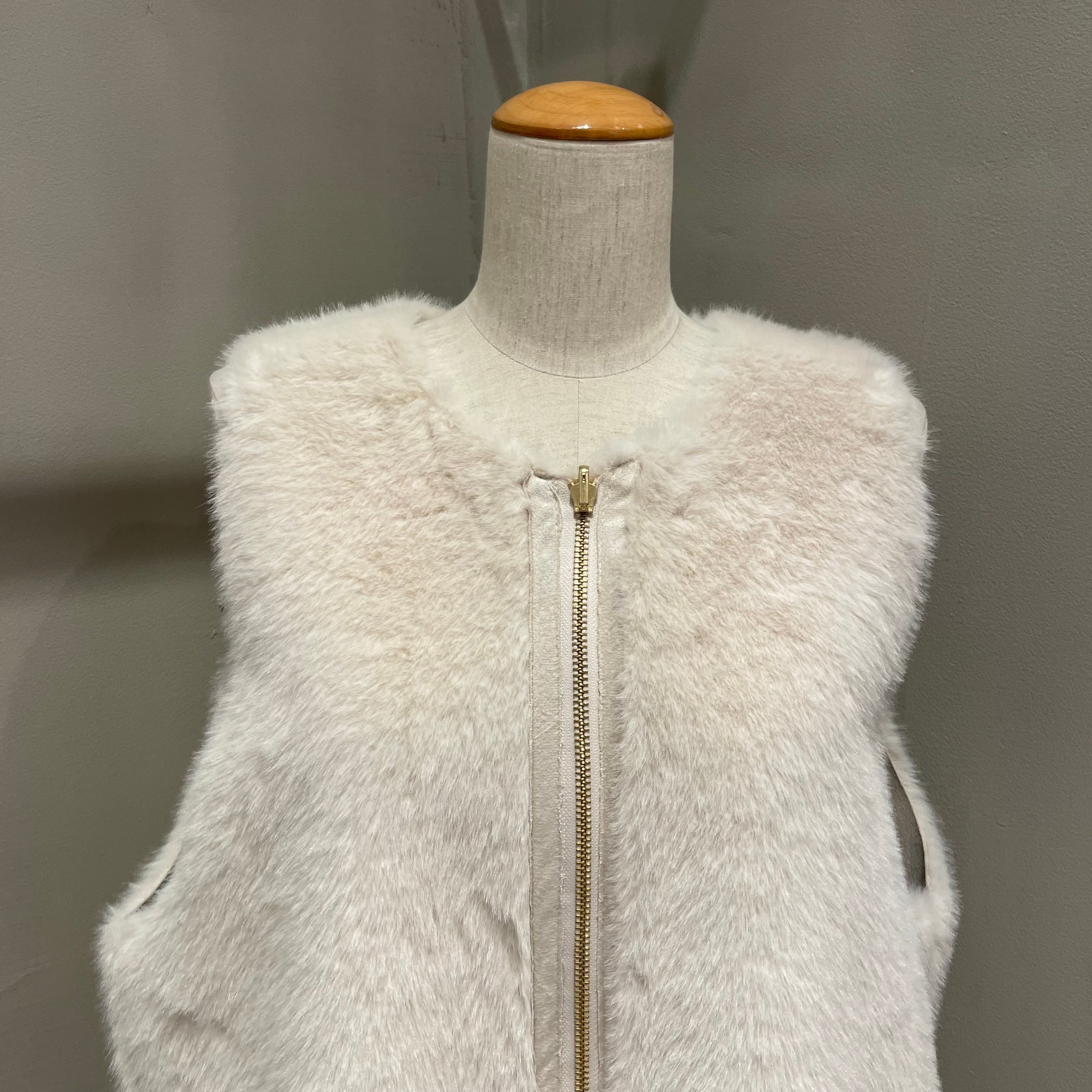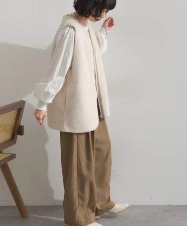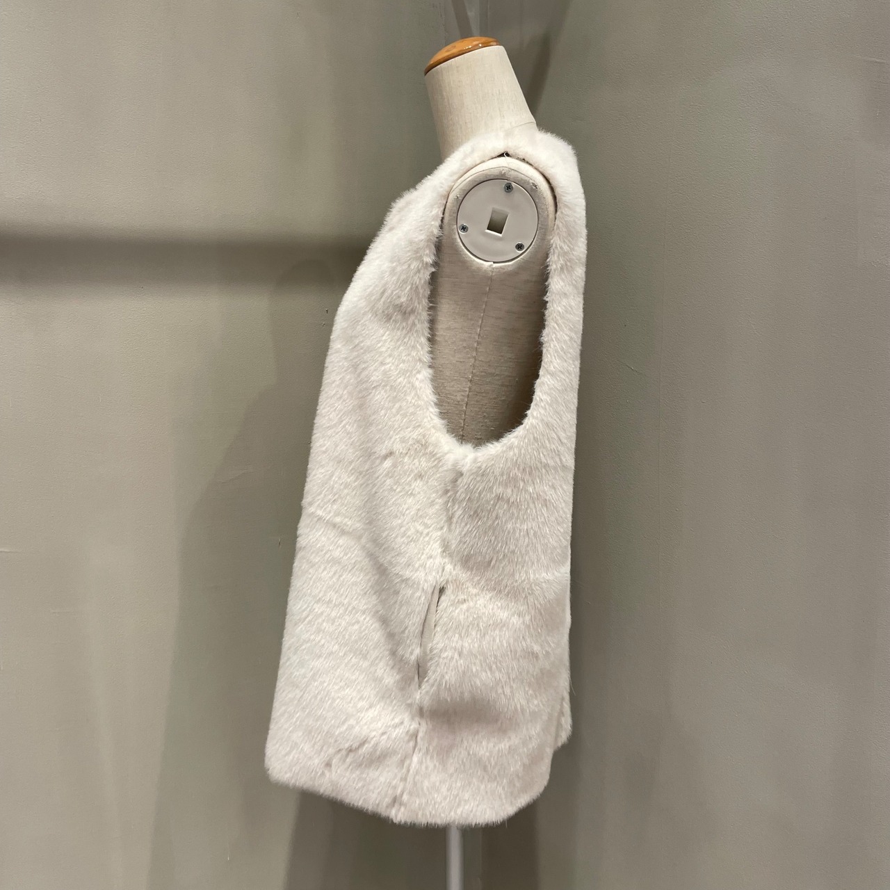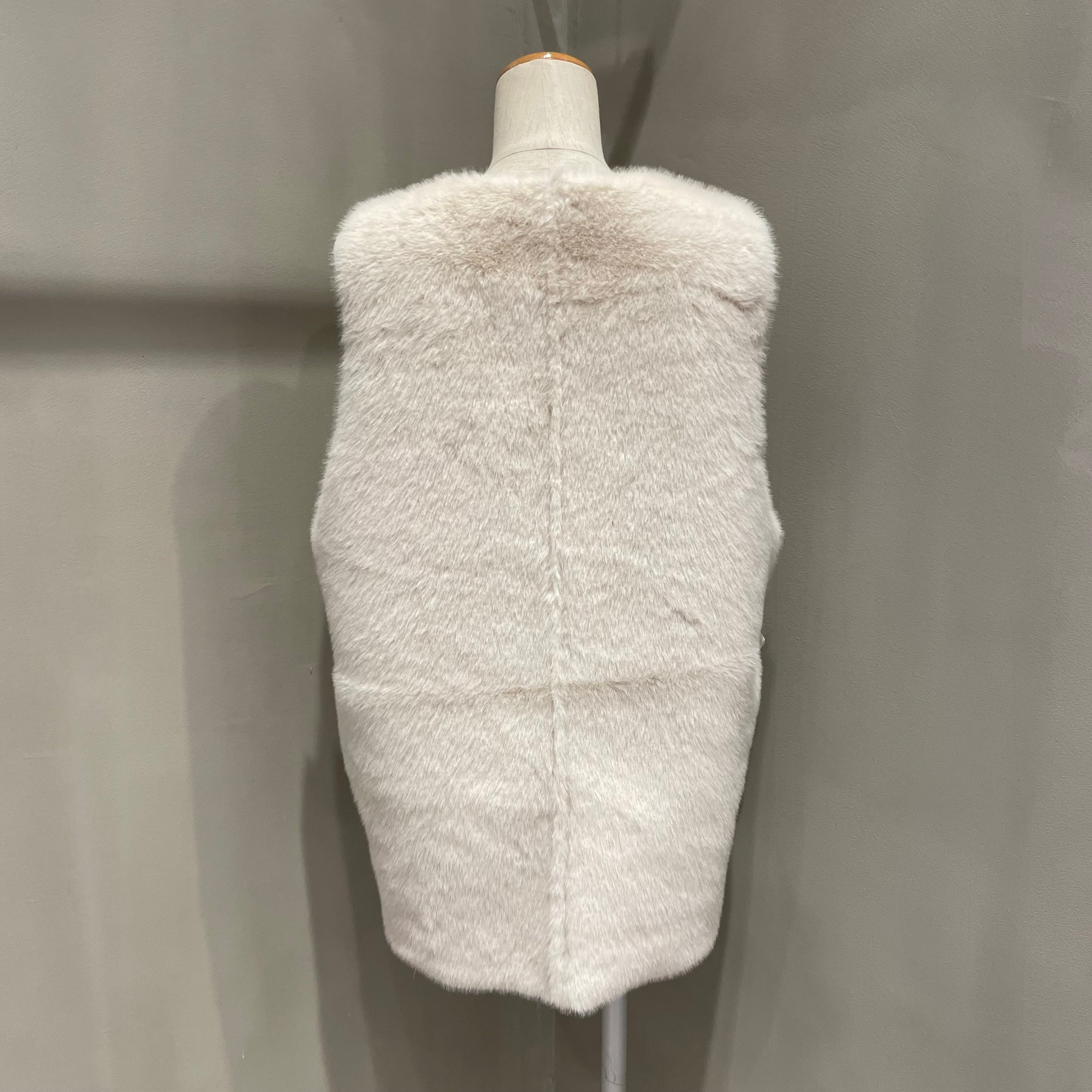 ラビット風エコファーとフェイクスエードのリバーシブル仕様で、1枚で異なる表情を楽しめるベスト
