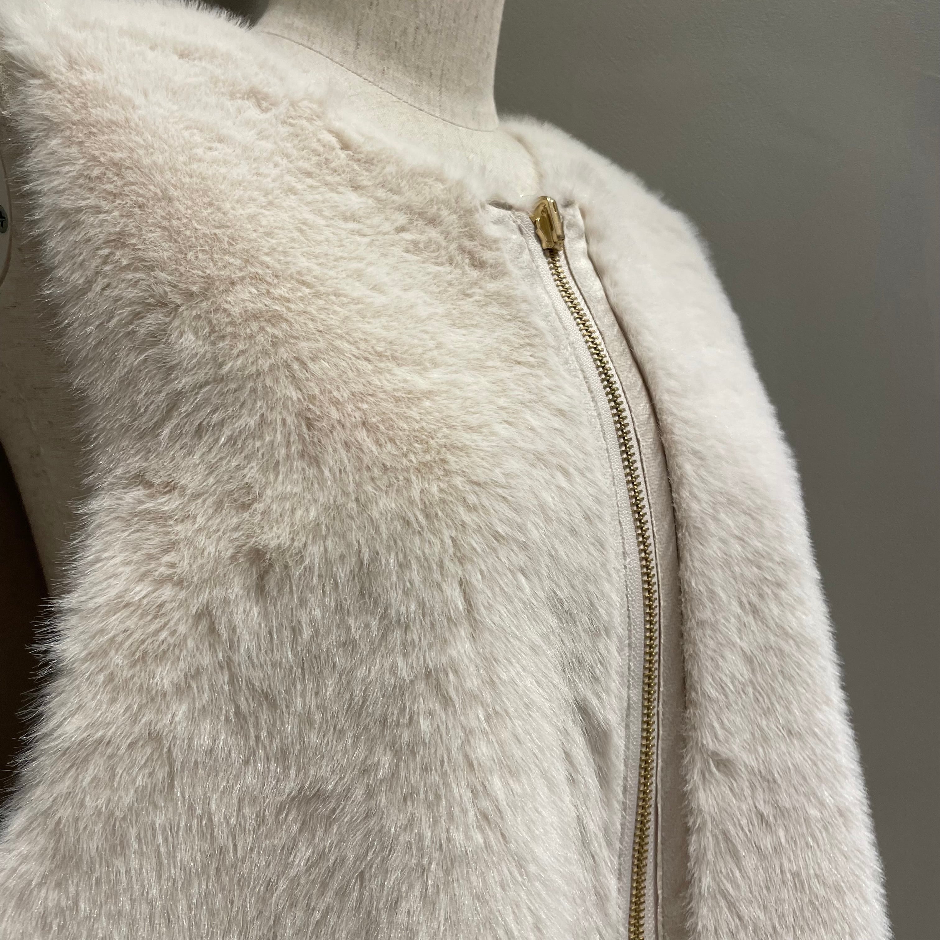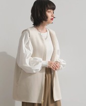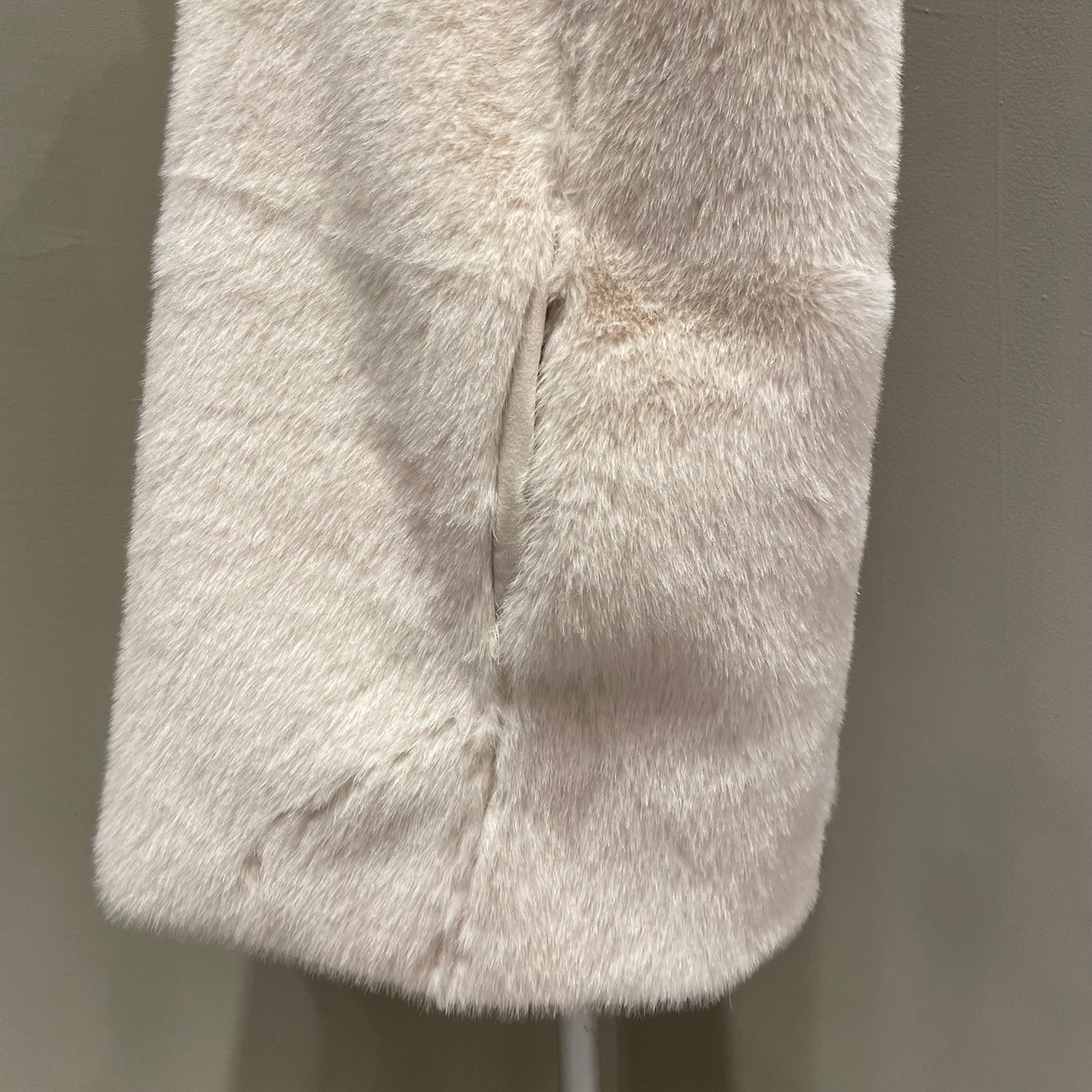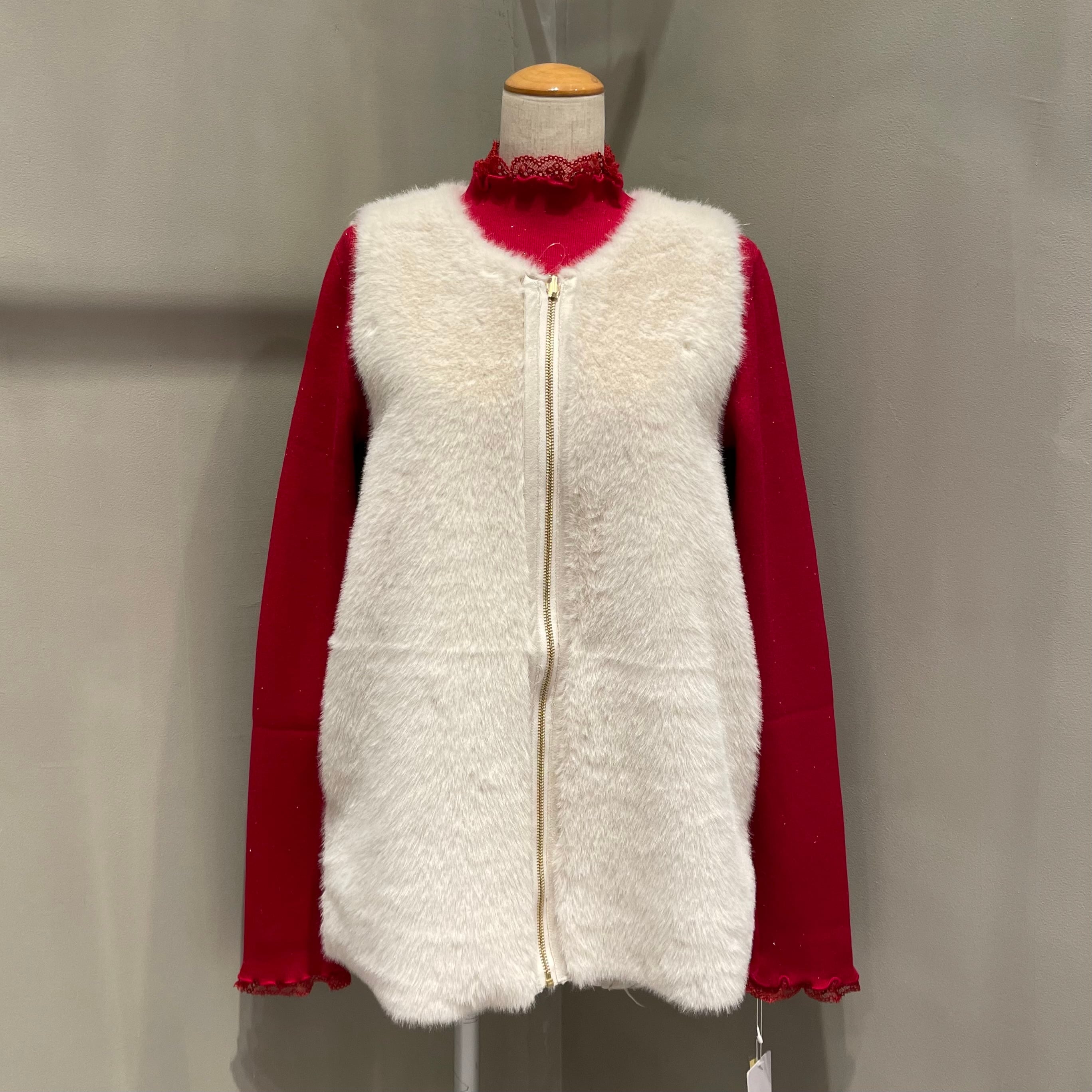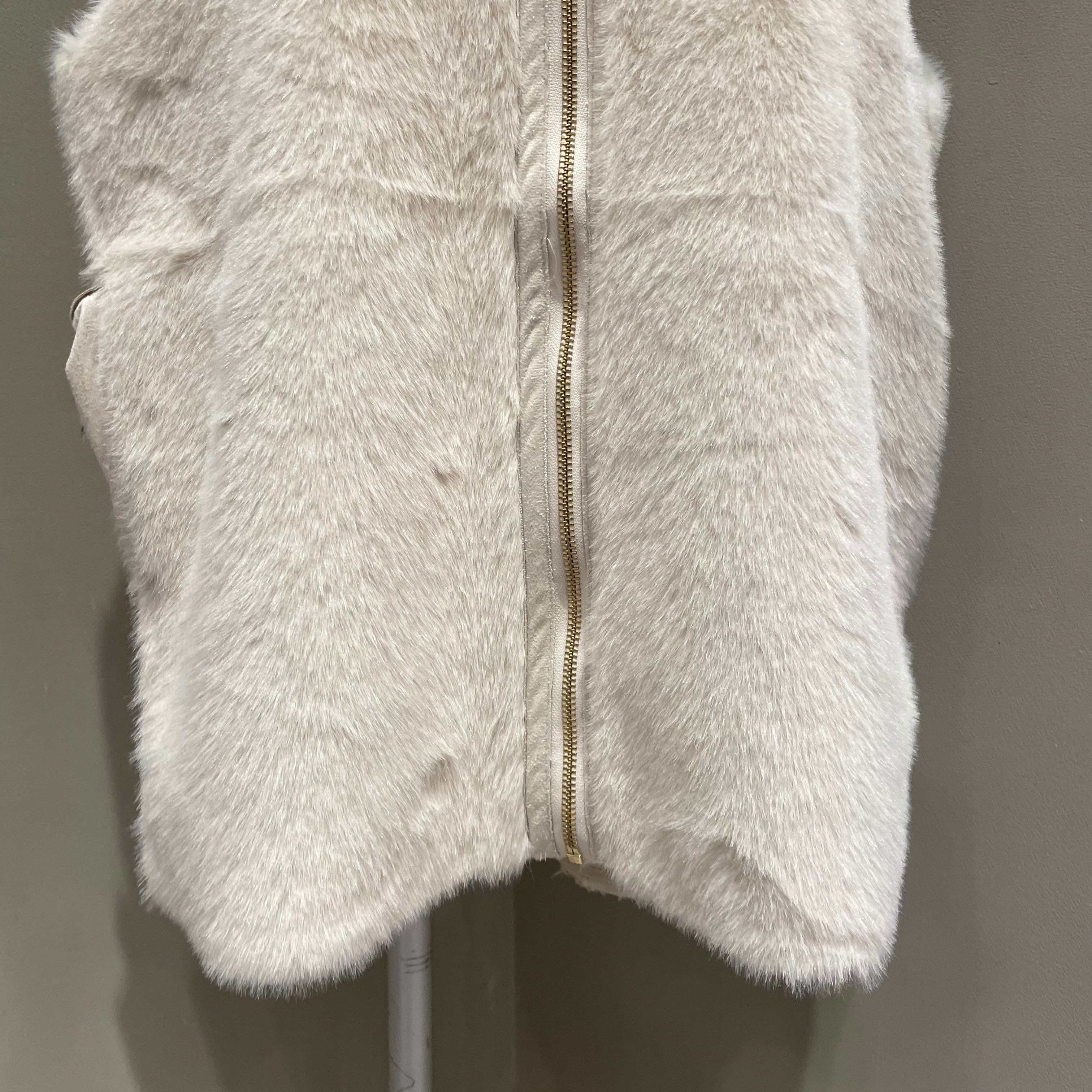 ラビット風エコファーとフェイクスエードのリバーシブル仕様で、1枚で異なる表情を楽しめるベスト