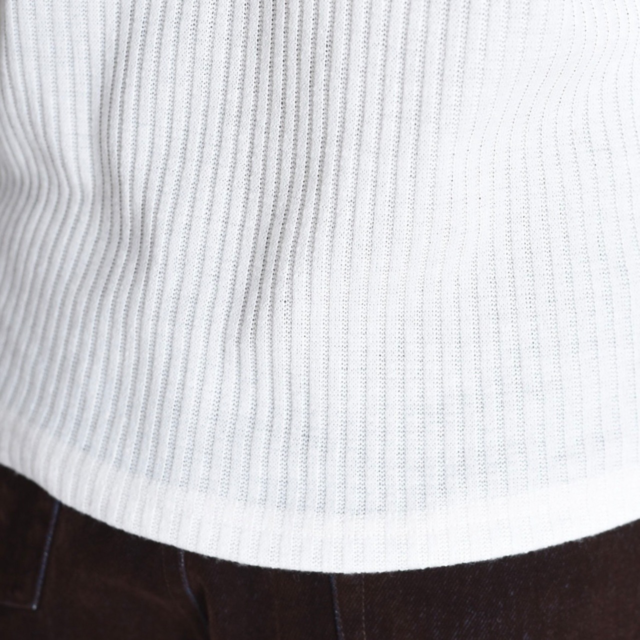 袖のラインが全体を引き締め、ジャケットやベストのインナーとしても存在感を発揮するアイテムです。