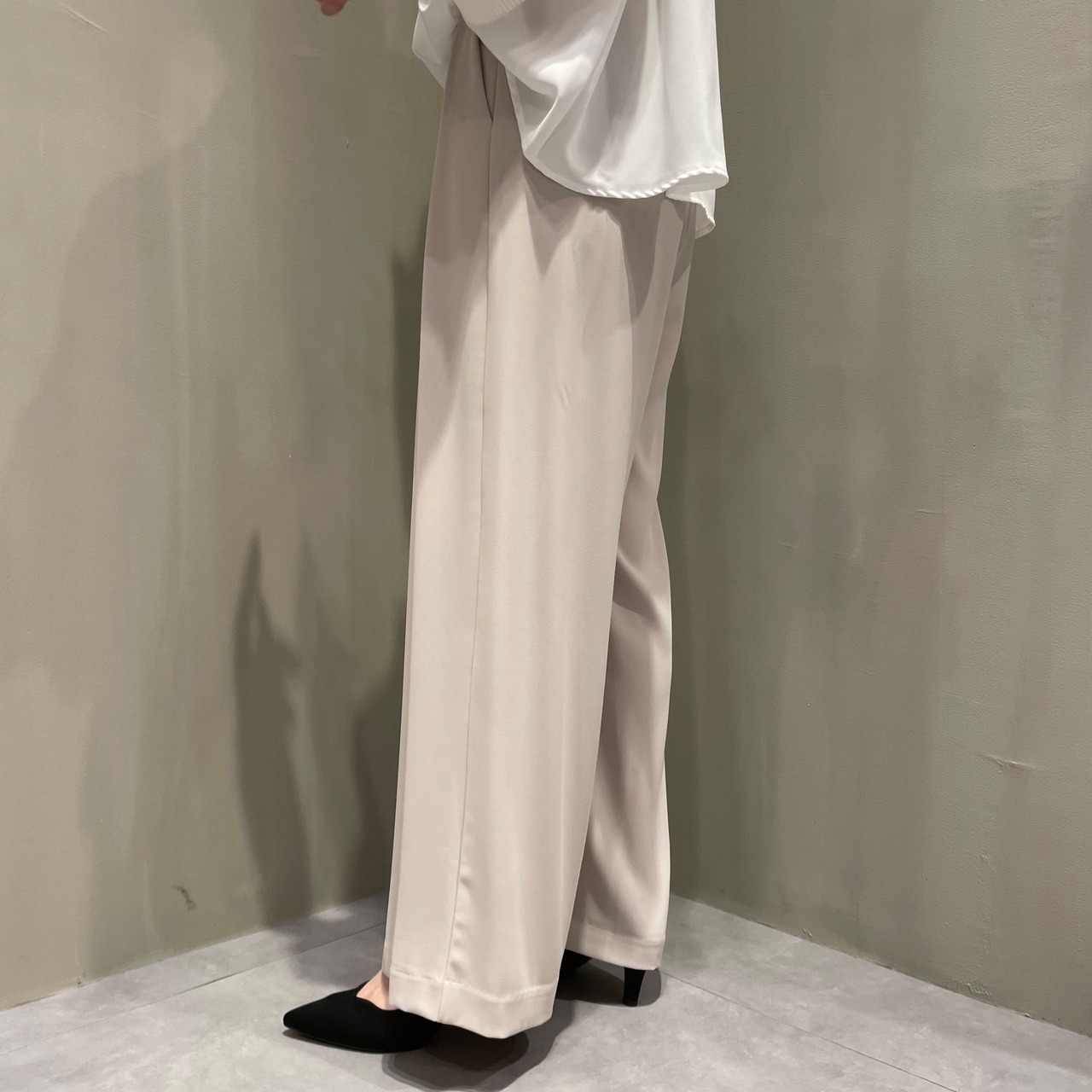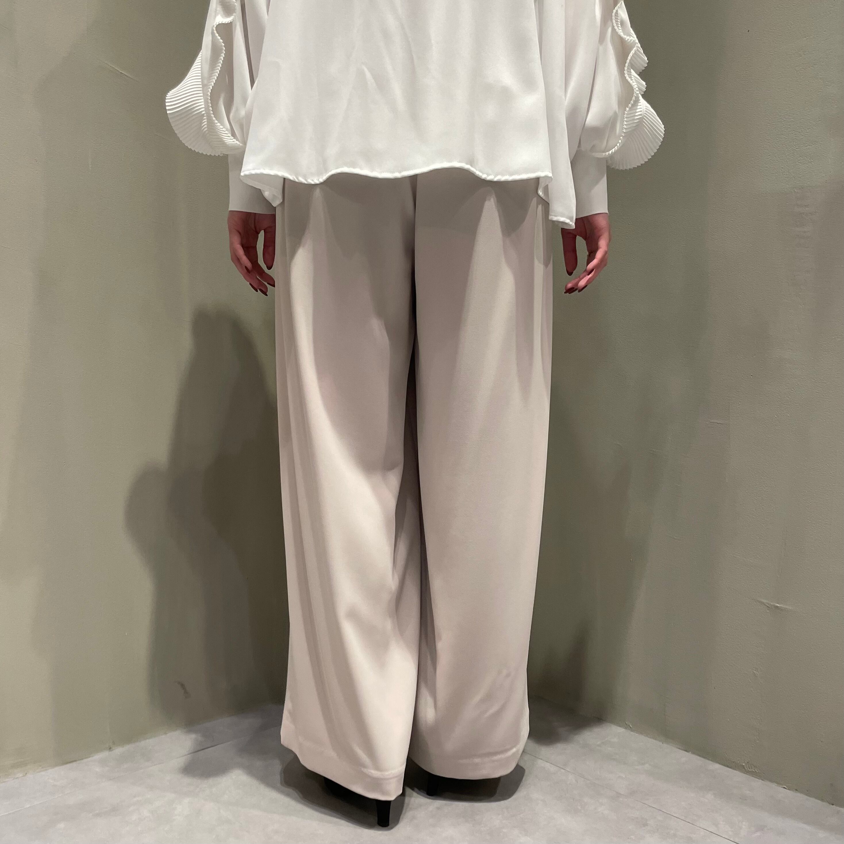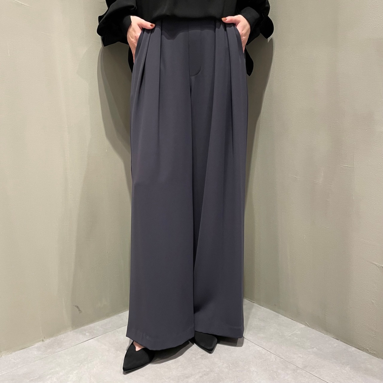 股上深めで脚長効果◎なハイウエストタックパンツです。