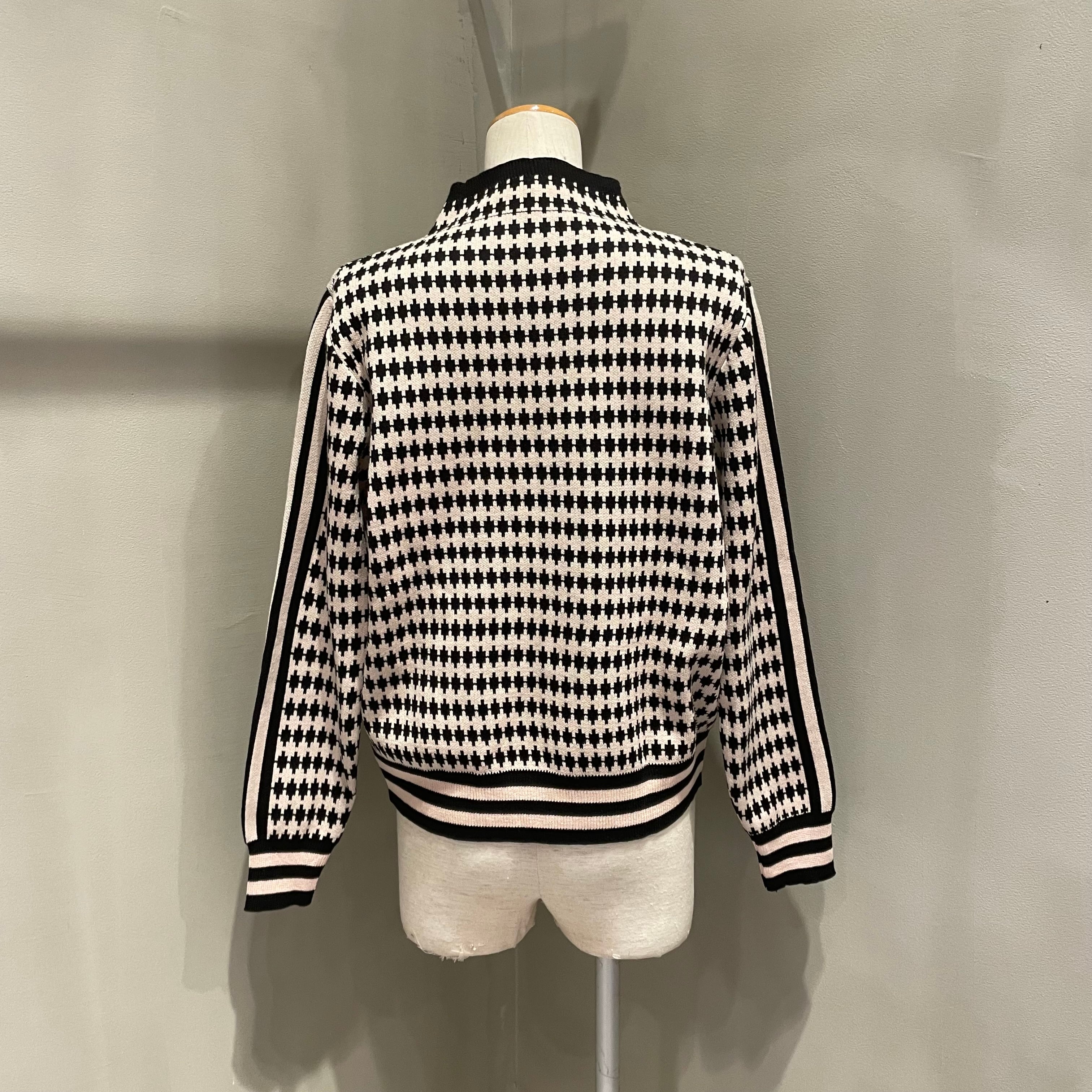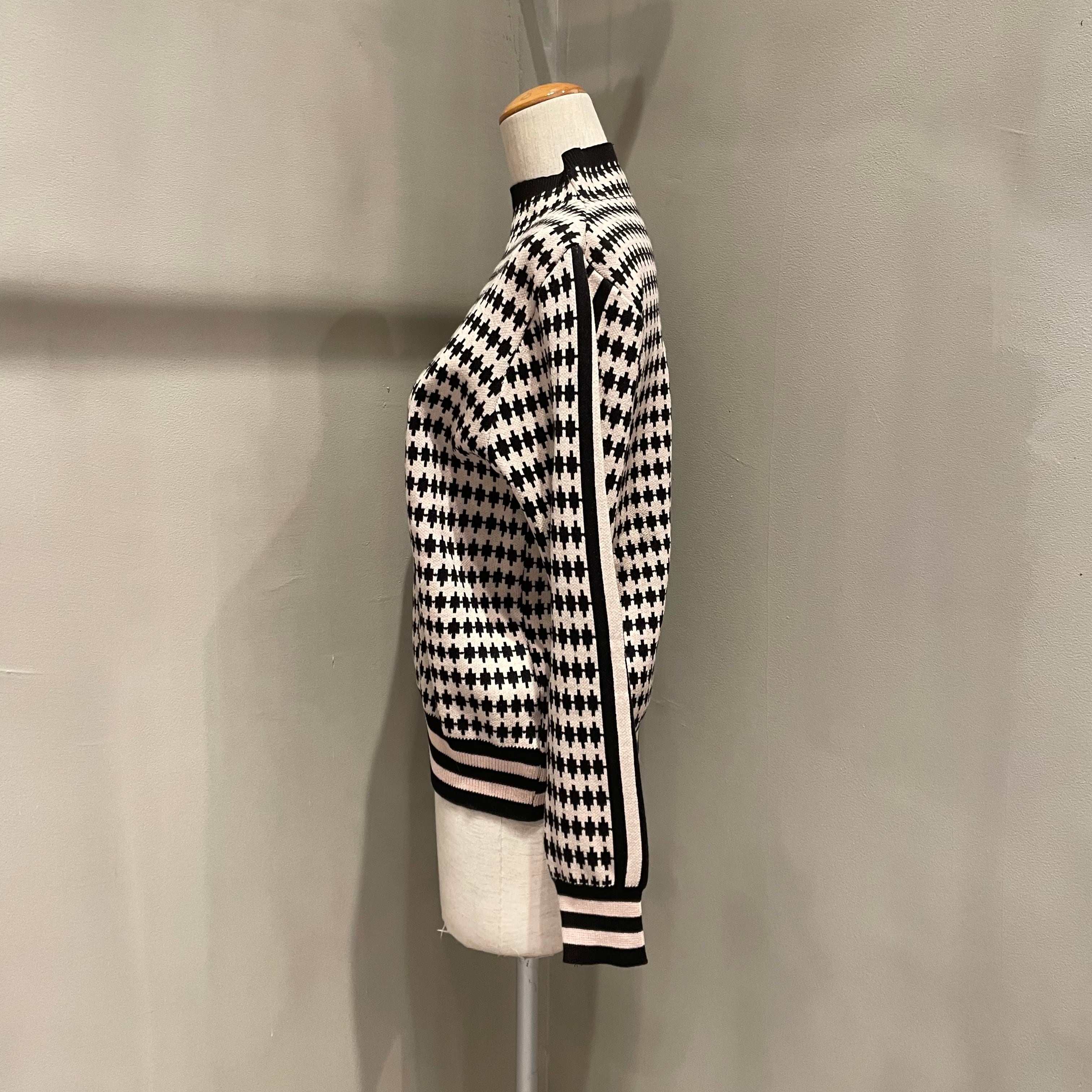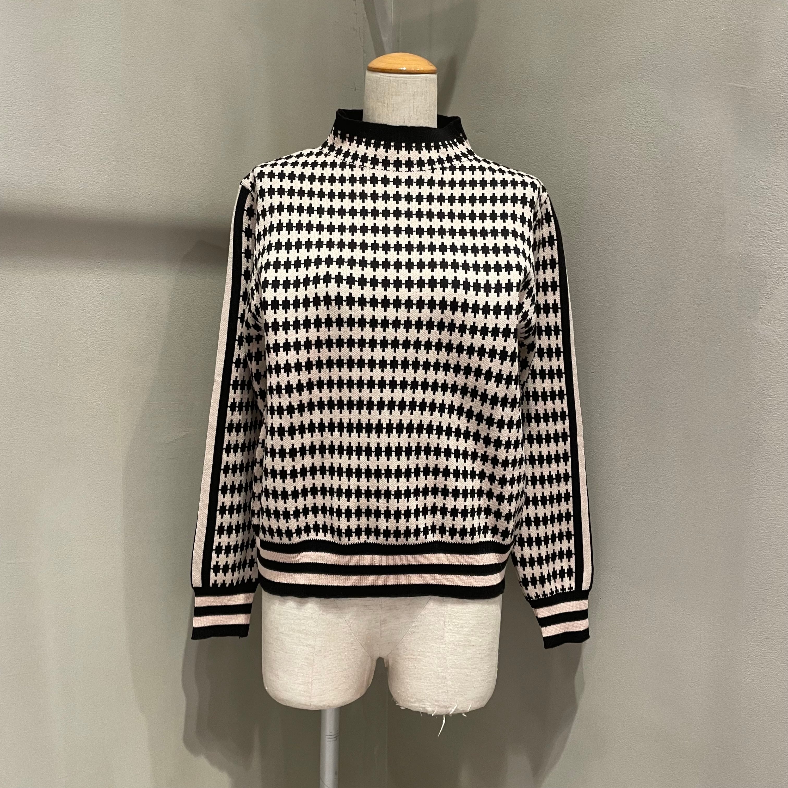 全体的に散りばめられた総柄と、袖ラインのデザインが特徴的なハイネックニット。