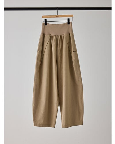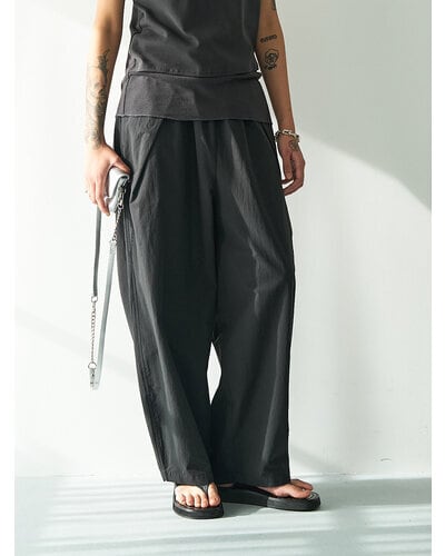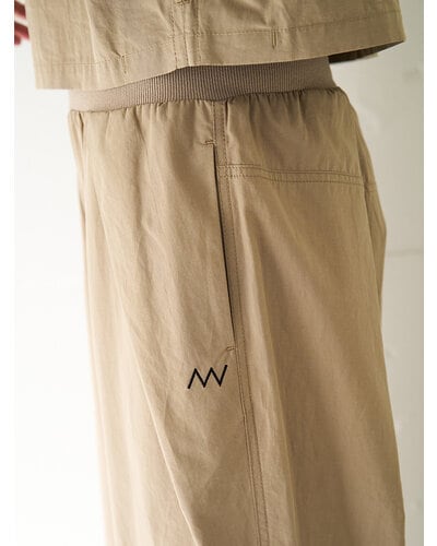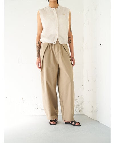 前後に深く斜めにいれたタックで作るカーブシルエットになっていて、肌に張り付かない涼しく履けるメンズライクな印象のパンツに仕上げました。 ゴムパンツとは違った、イージーながらもすっきりと履き込めるのがうれしいポイントです。