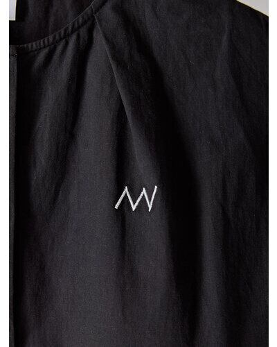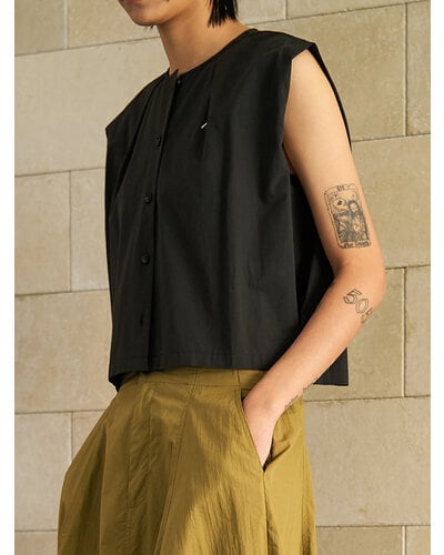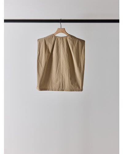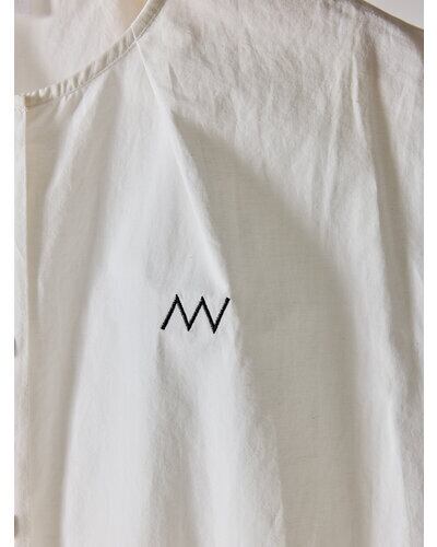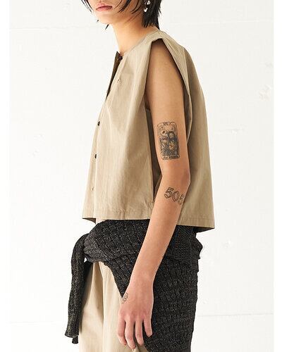 正面から見るとシンプルなノーカラーのシャツブラウスは、再度に施したマチとタックで作り出すボクシーシルエットが