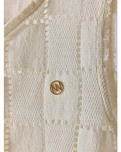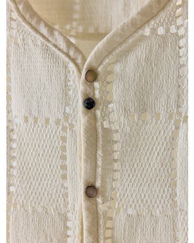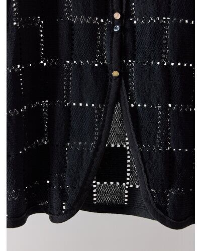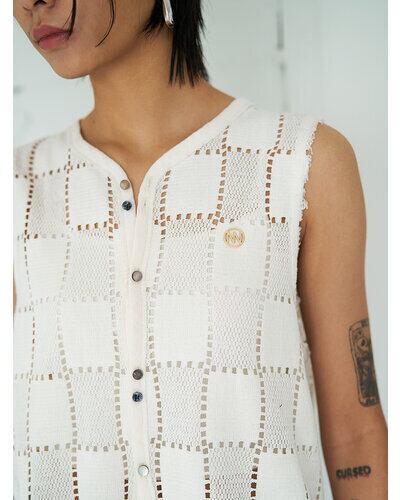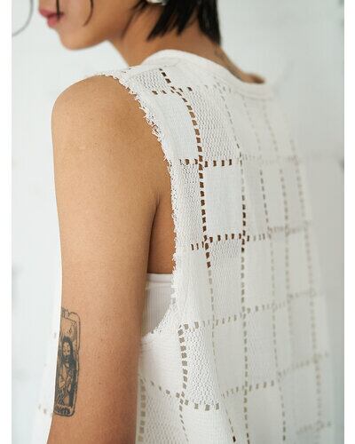 マニッシュなスクエア柄レースが印象的なレーストップス。切りっぱなしのパイピングや肩部分のカットオフディテールが、程よく力の抜けたムードを演出します。ランダムに配した貝ボタンがさりげない遊び心を添え、表情に奥行きをプラス。フロント裾は前あきを斜めにカッティングすることで、ボトムと合わせた際もバランス良く、自然なスタイルアップが叶う一着です。