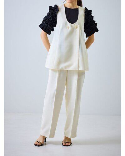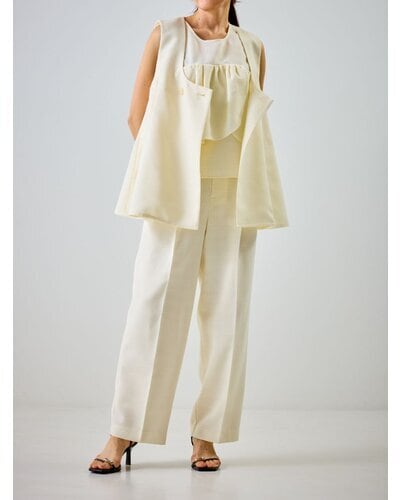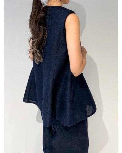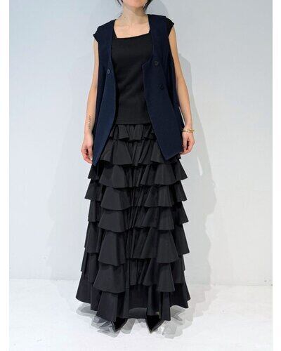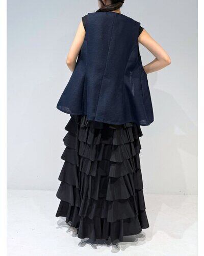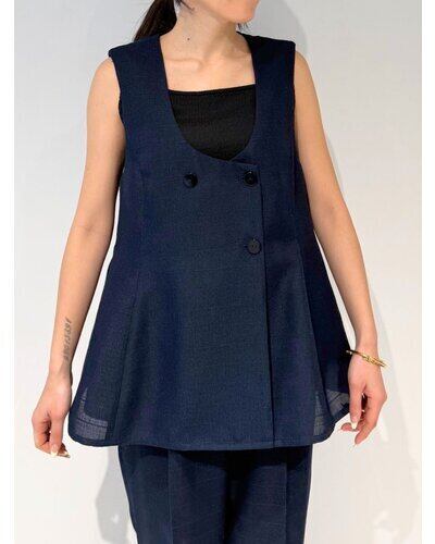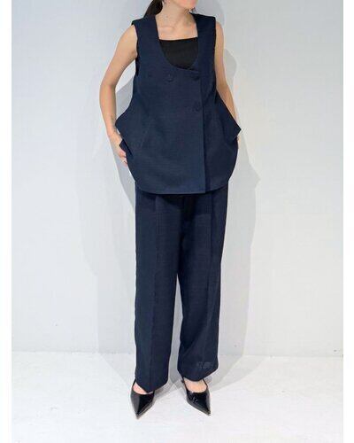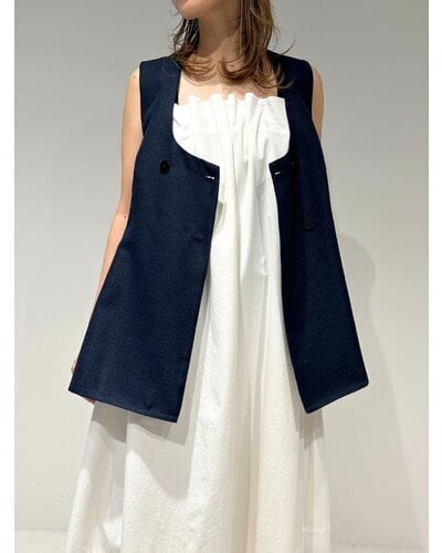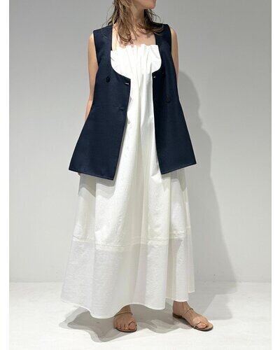 大きめのUネックが程よいやわらかさと抜け感を演出し、ジレ特有のかたさを抑えた印象に。裾にかけてほんのりフレアを効かせることで、柔らかなシルエットを描きながら下半身をすっきりと見せてくれます。