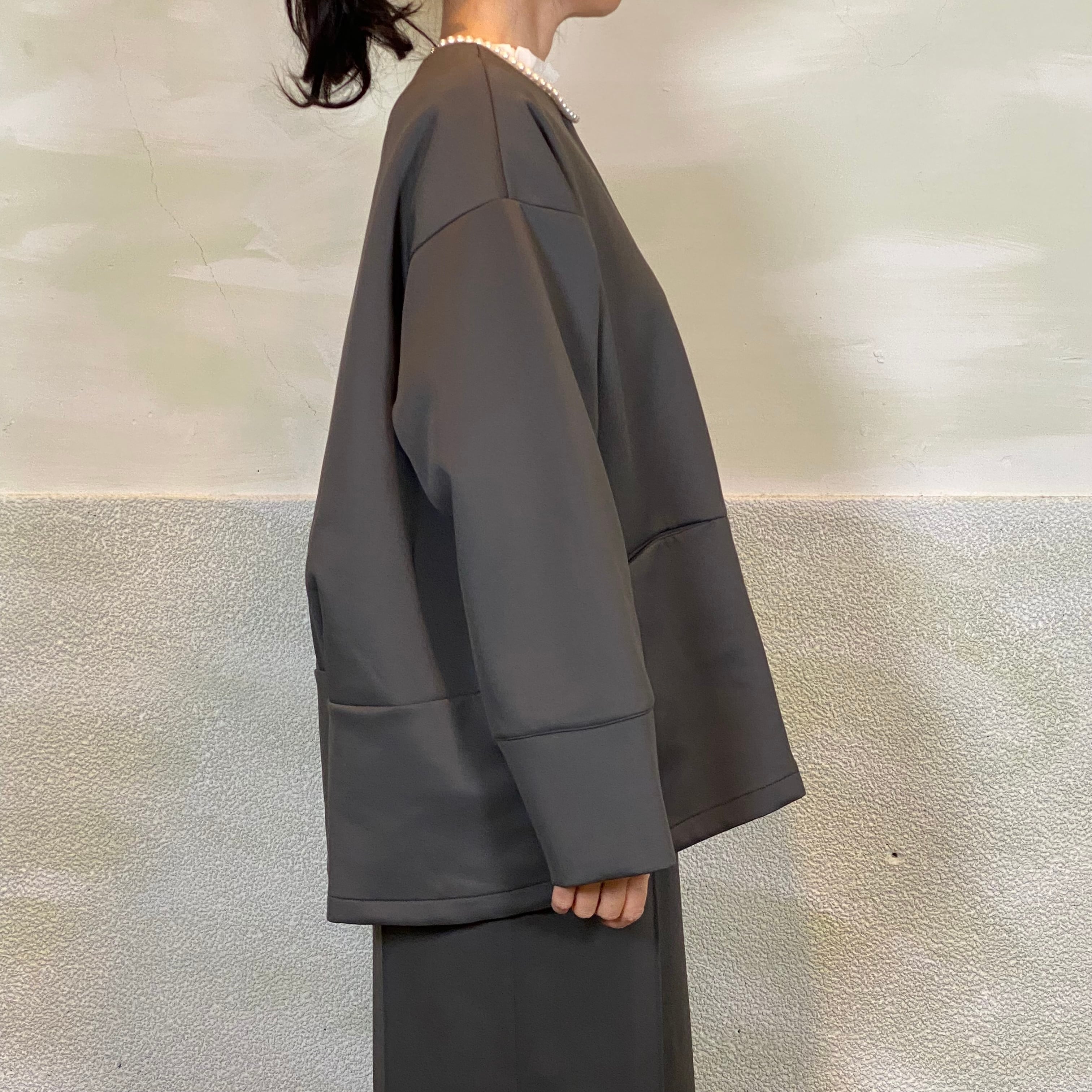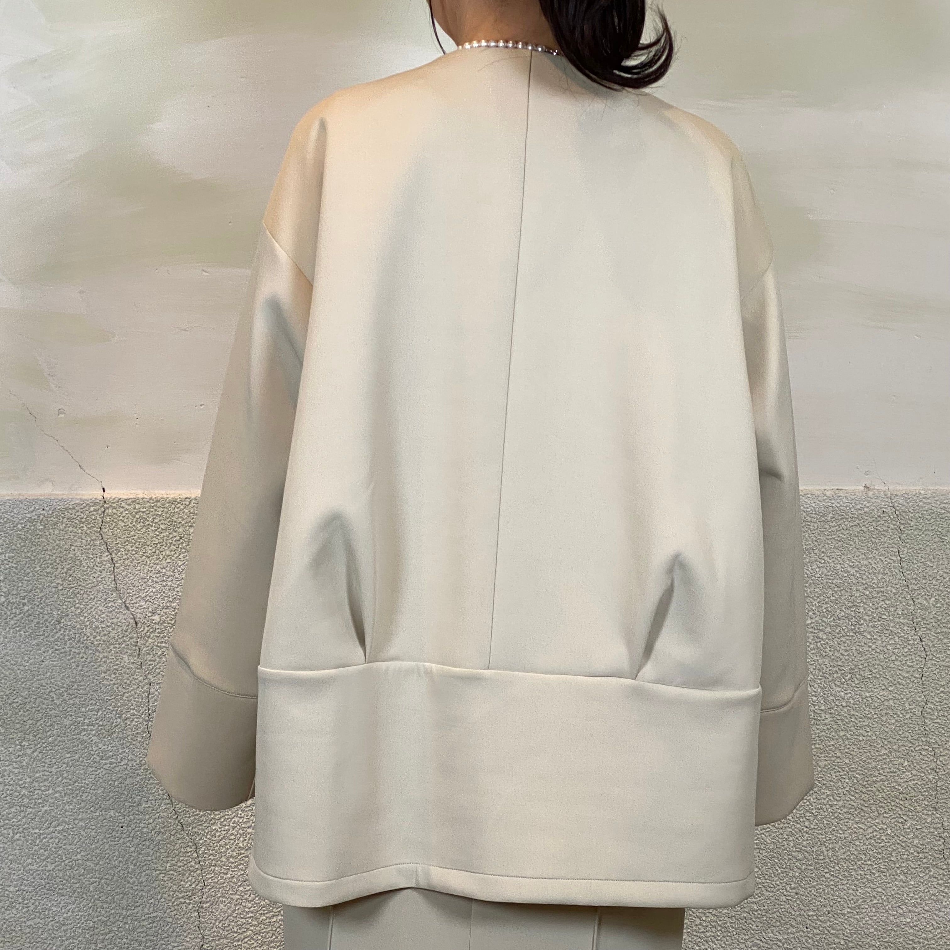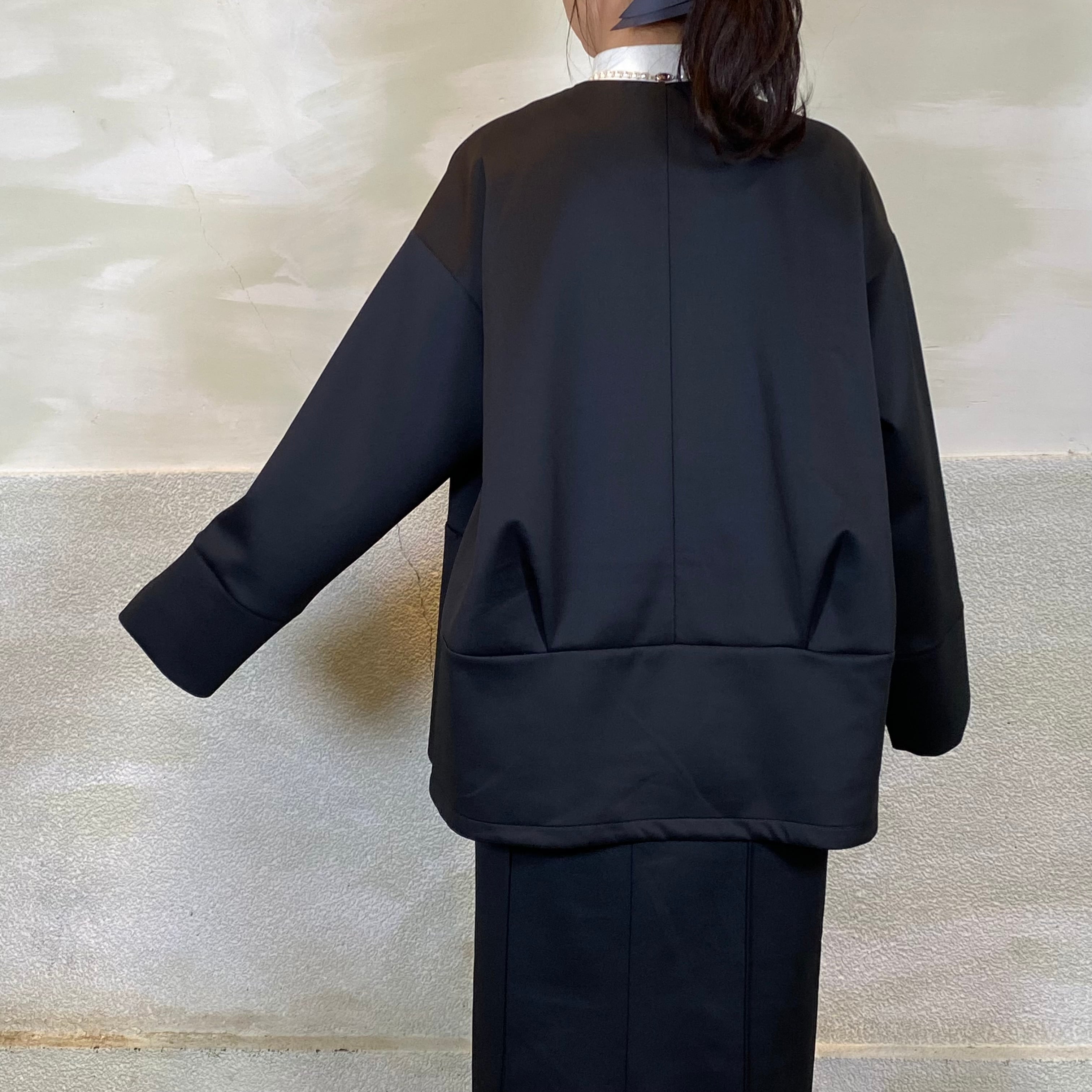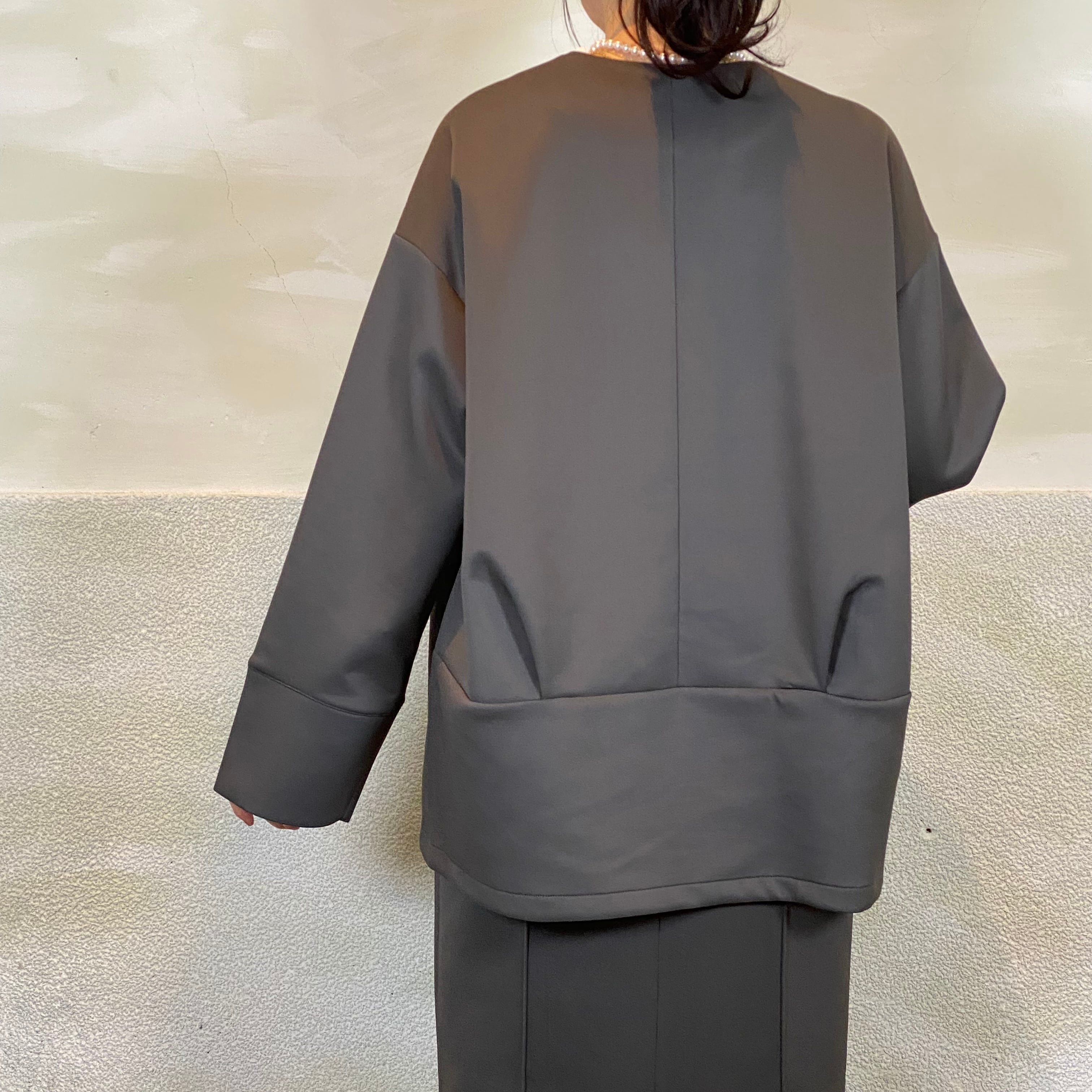 後身頃はタックデザインで、立体的なコクーンシルエットがポイントです。ゆとりのあるサイジングで、重ね着してもごわつかず着心地も◎