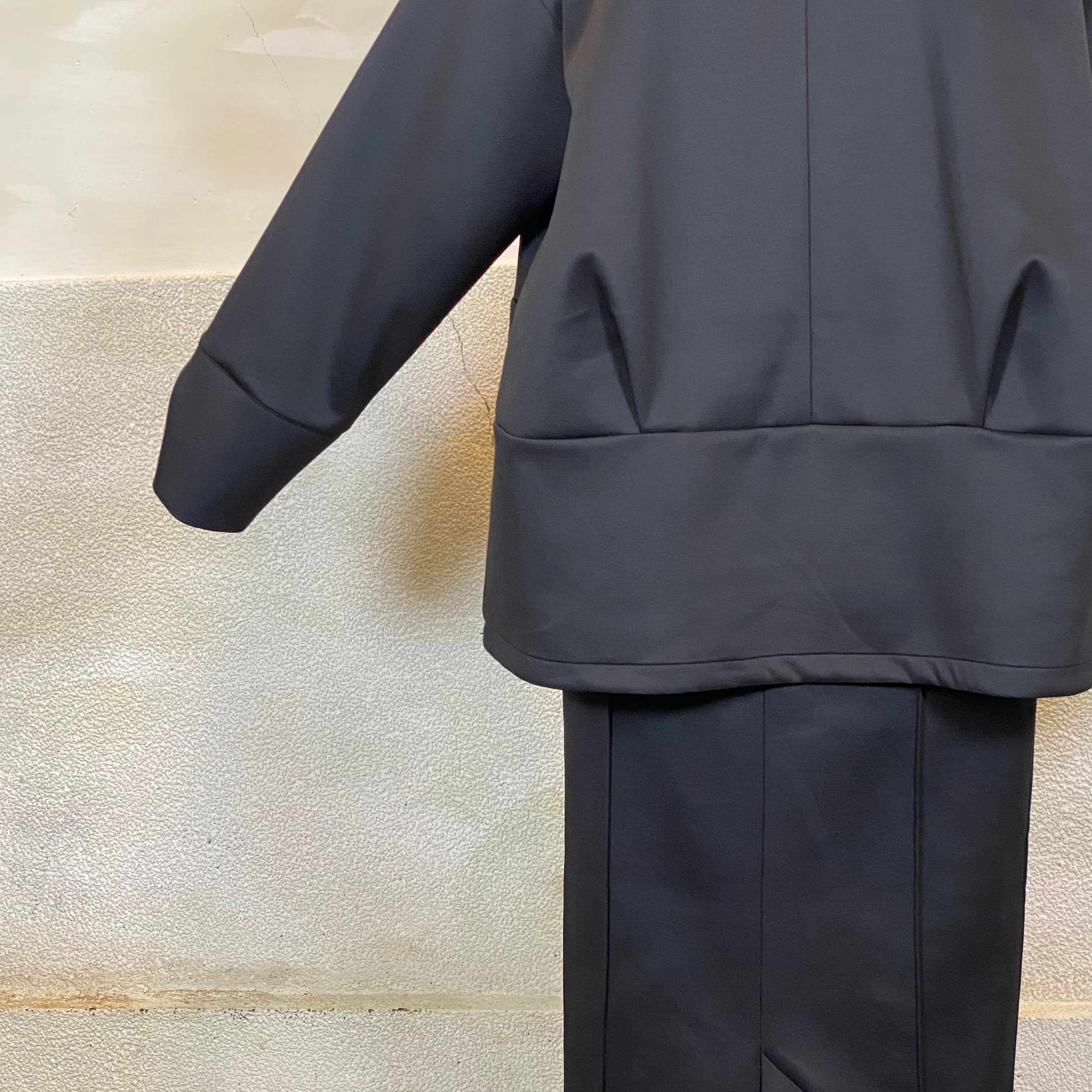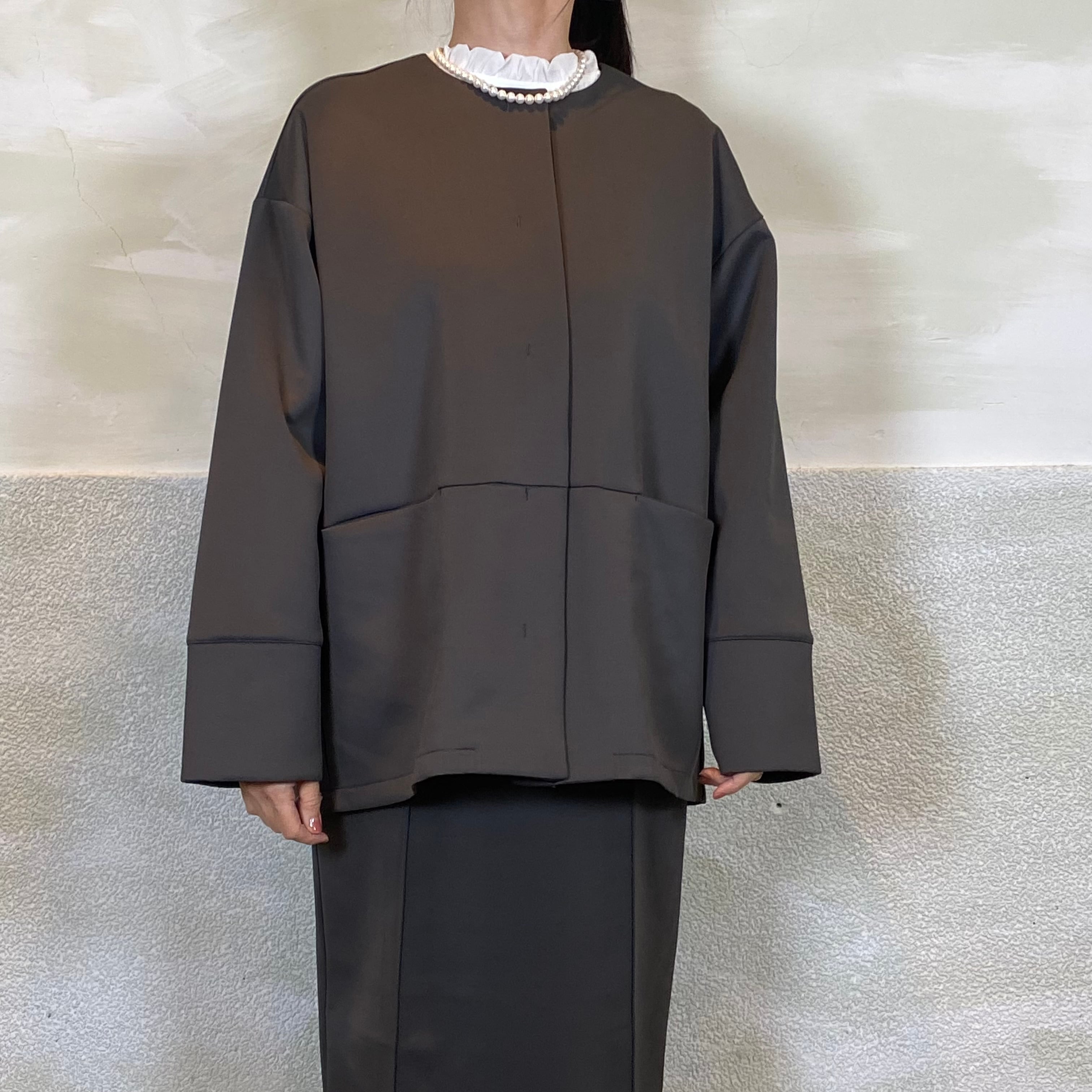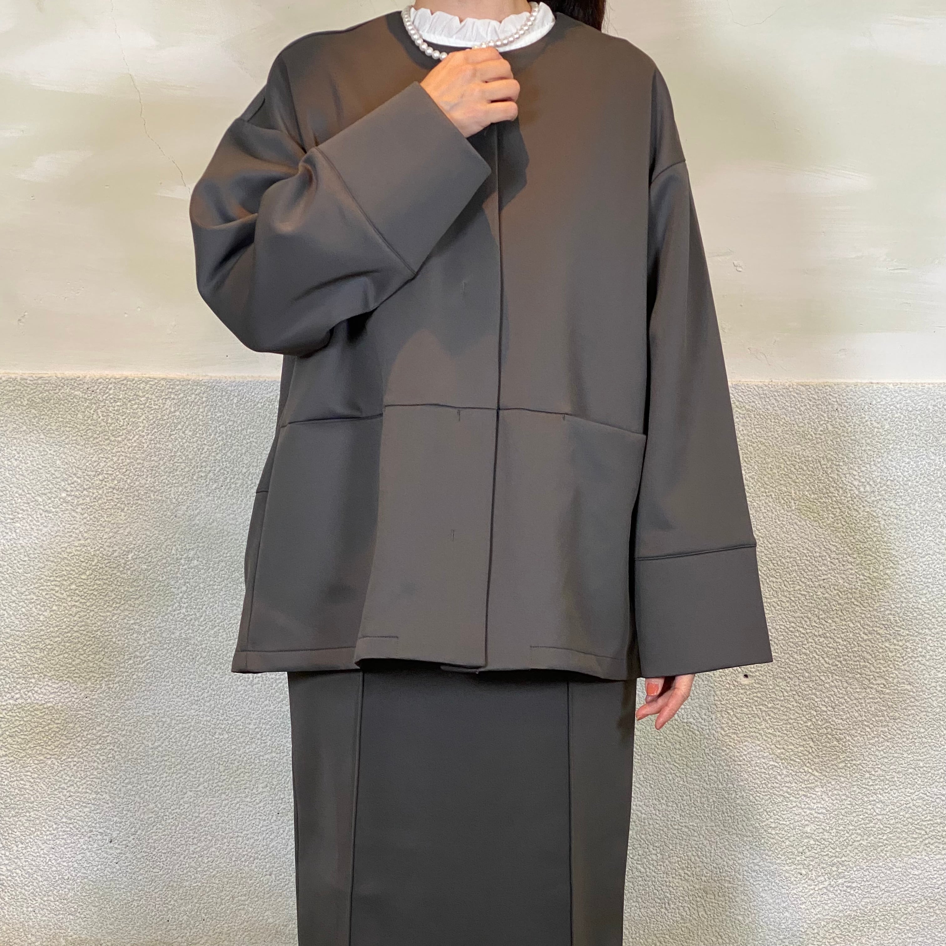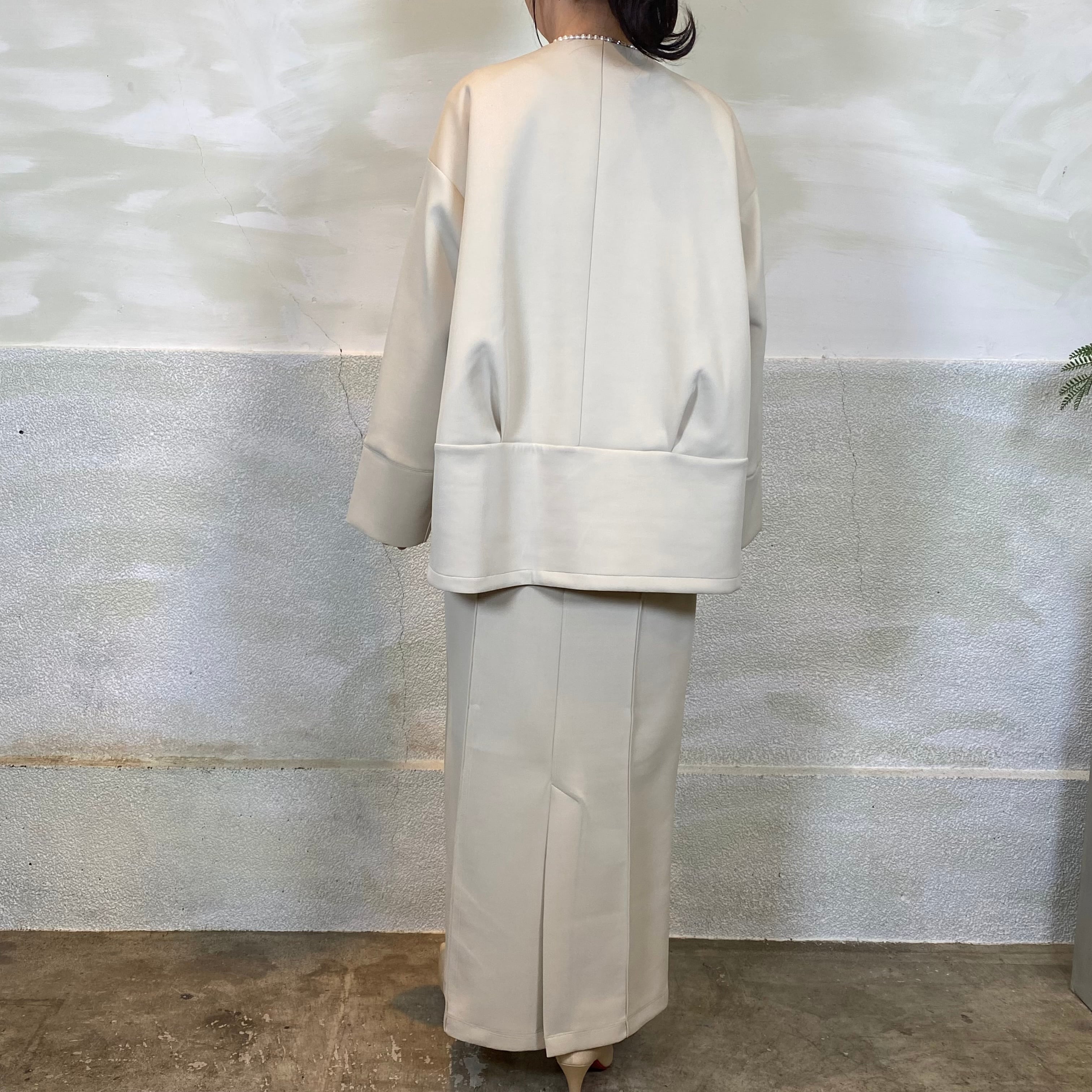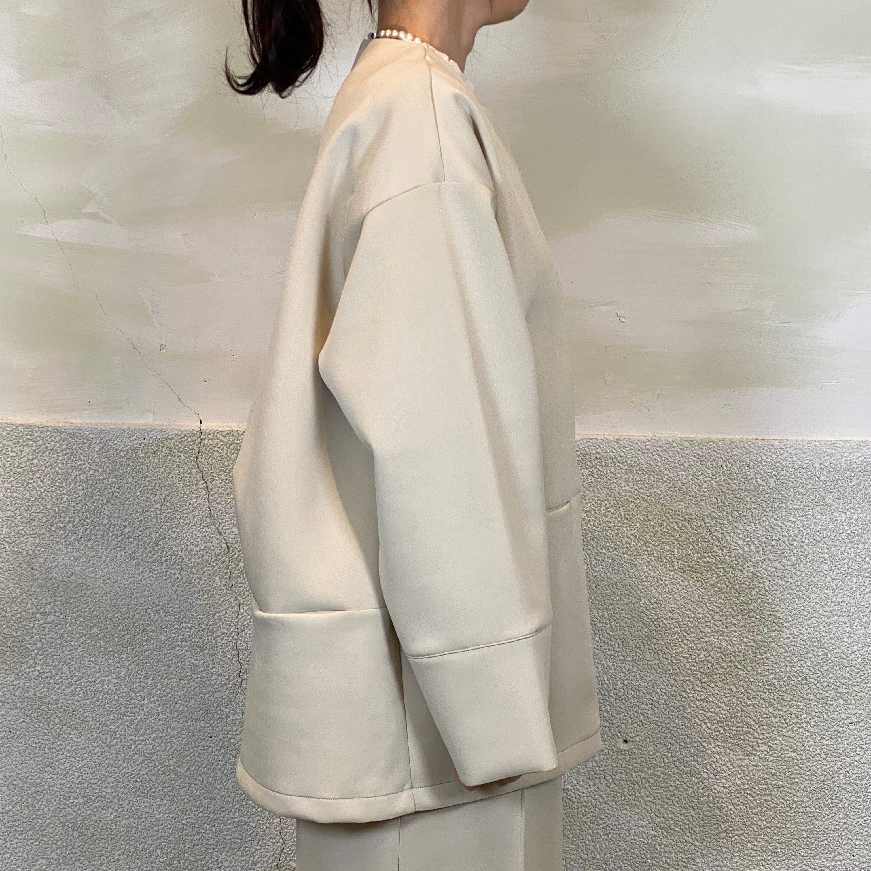 後身頃はタックデザインで、立体的なコクーンシルエットがポイントです。ゆとりのあるサイジングで、重ね着してもごわつかず着心地も◎