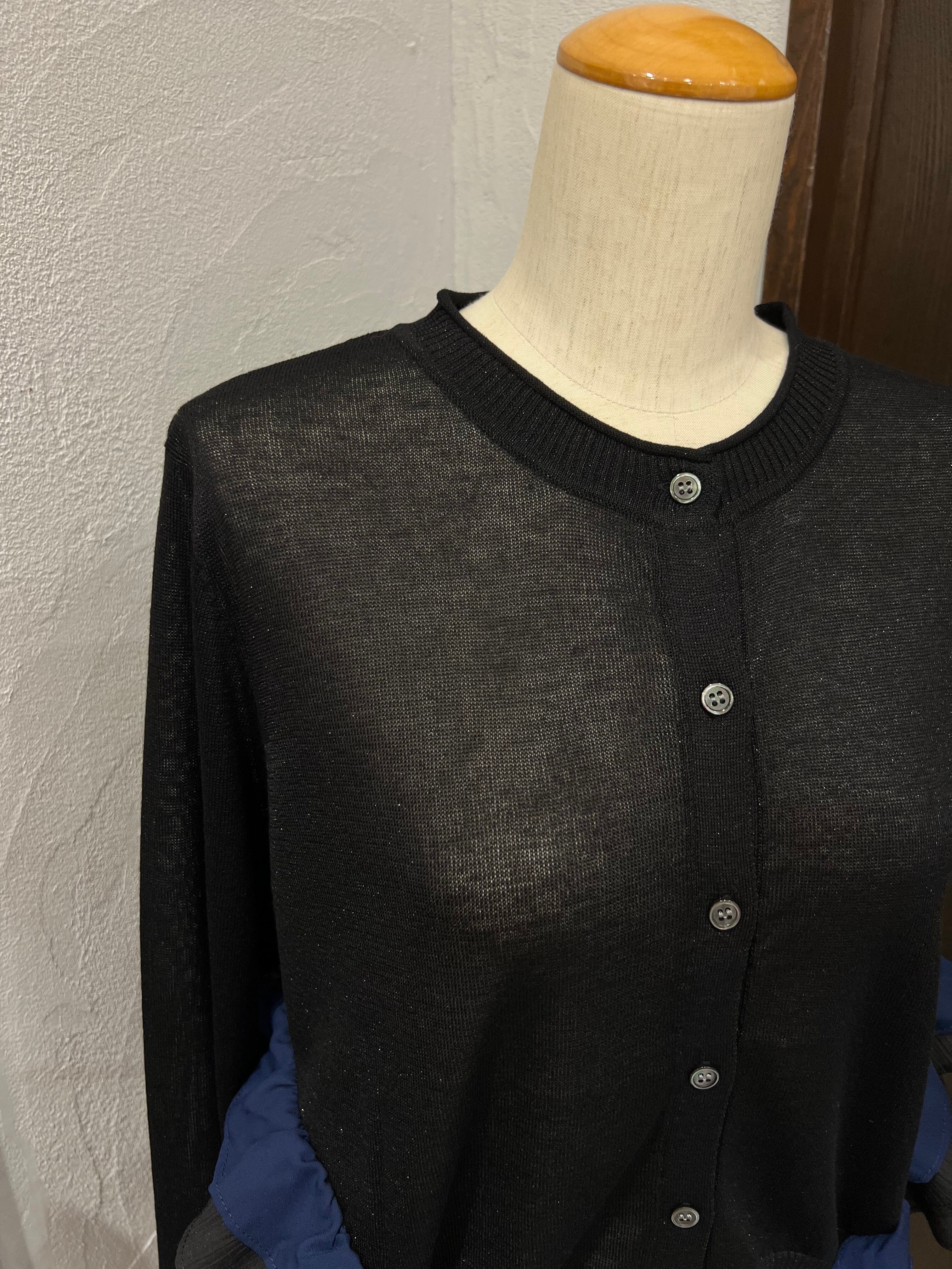 レーヨン混のツヤと程よい落ち感が上品なニットに様々な素材でフリルをオンした着映え感抜群のカーデです。