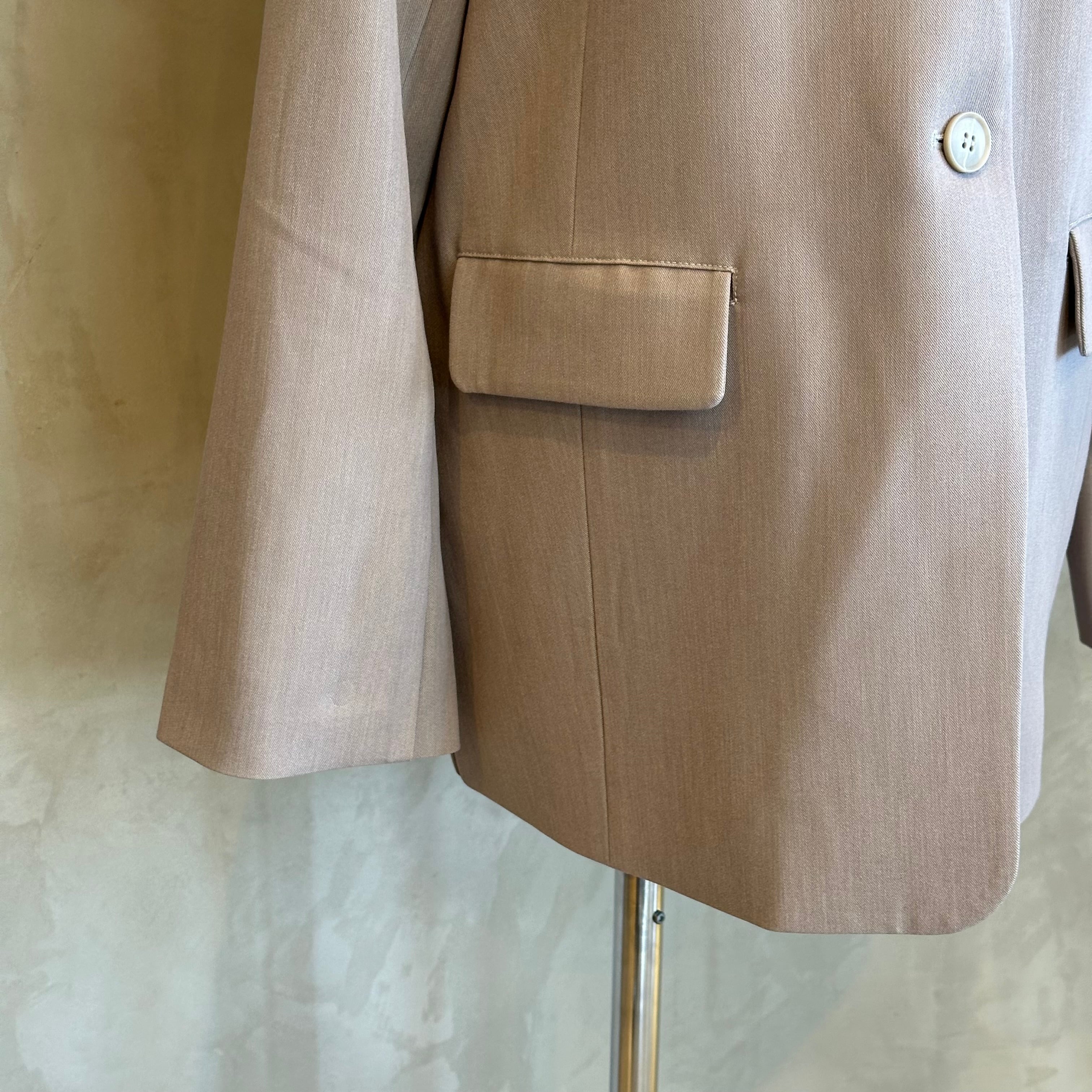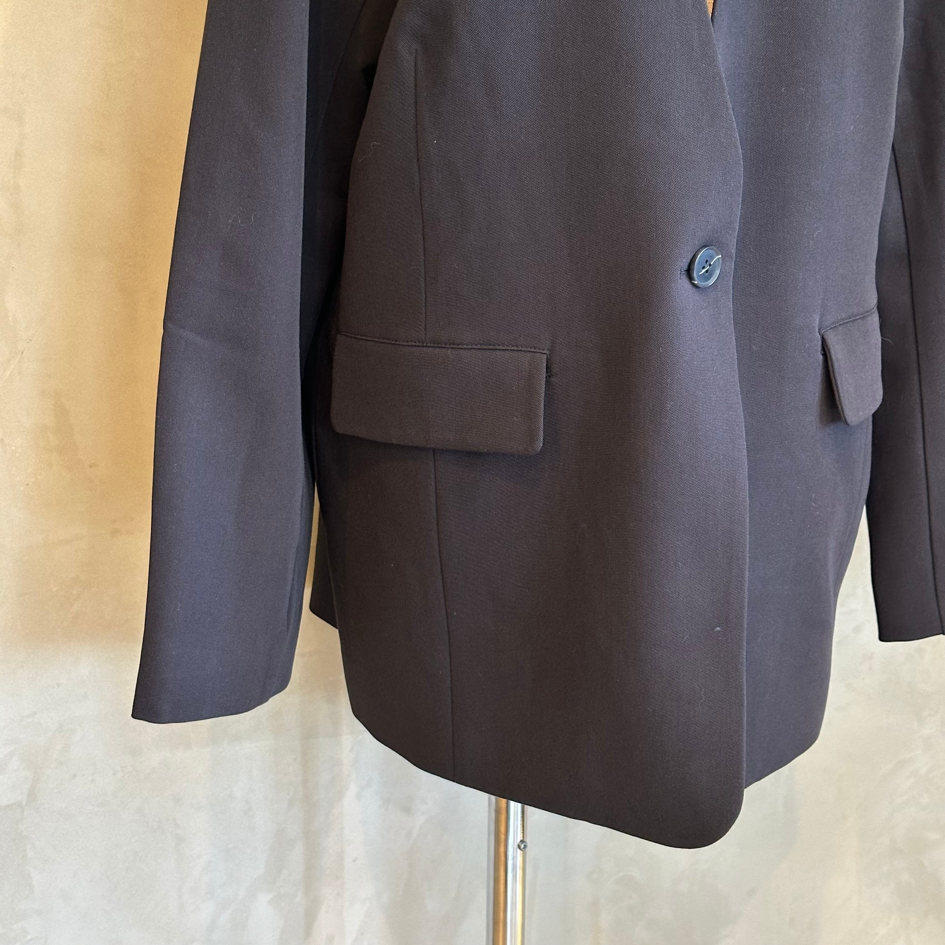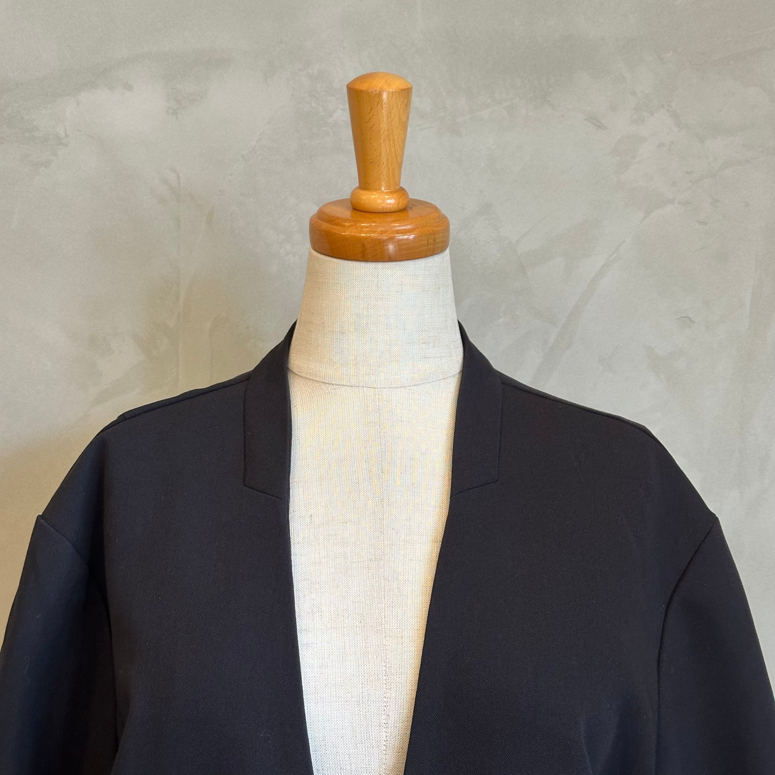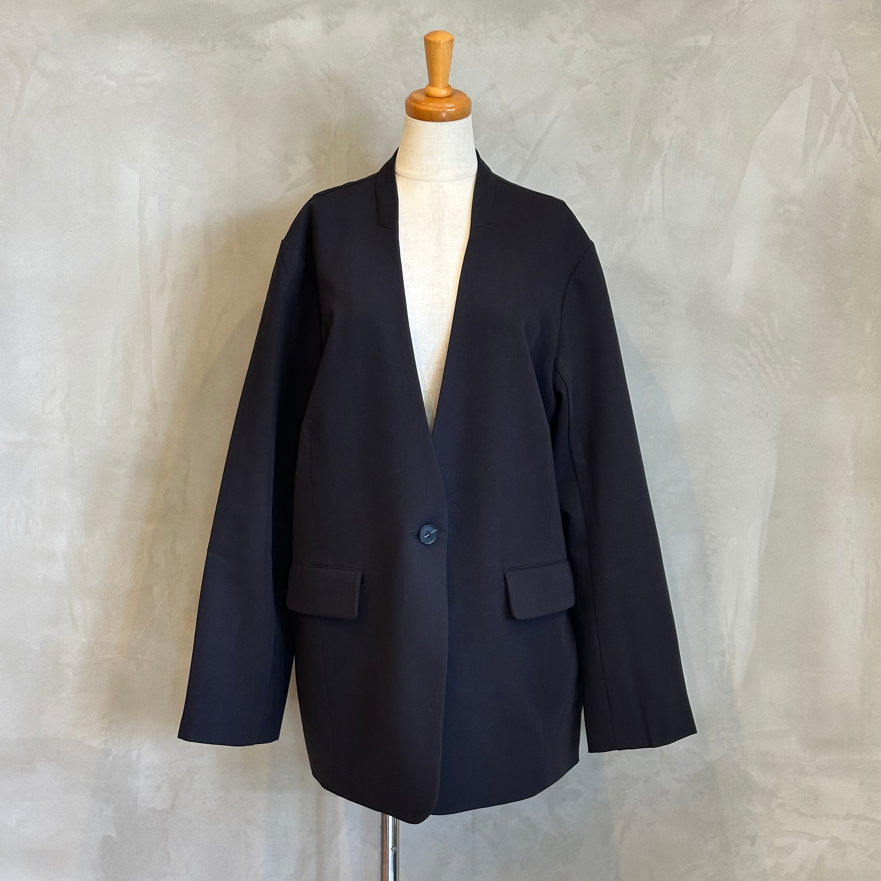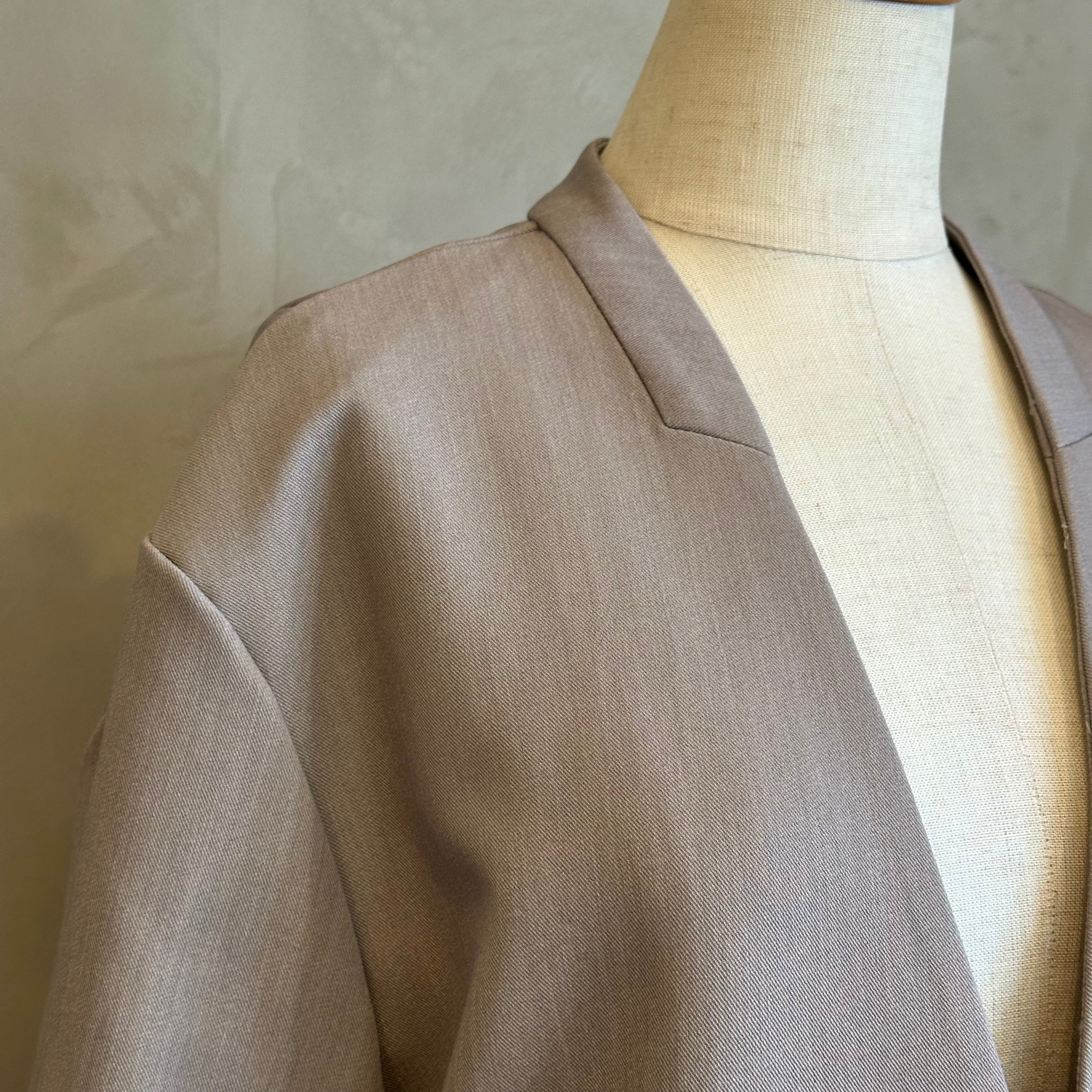バックスリットとポケットがポイントのモード感あるノーカラージャケット。