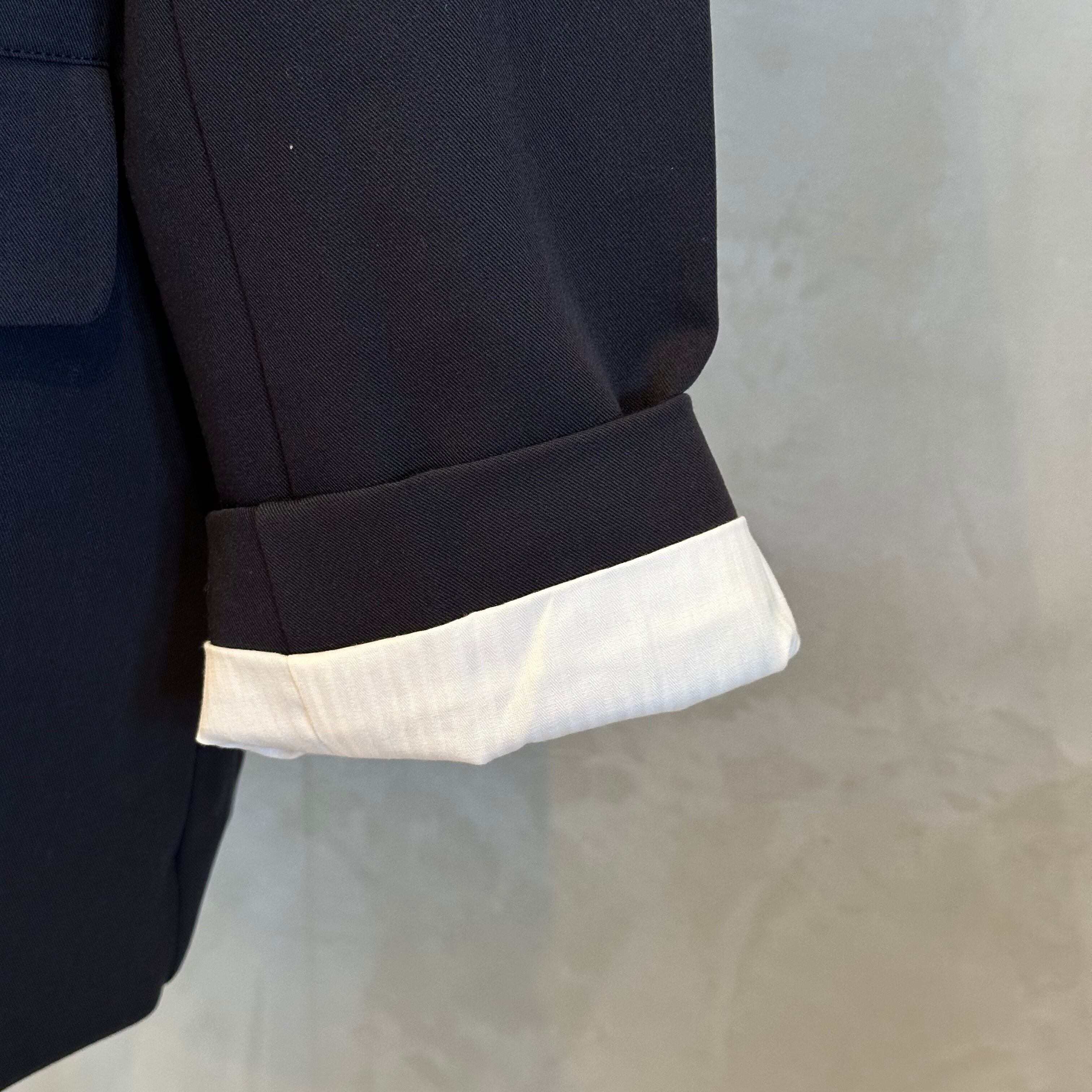 シンプルなジャケットですが、袖口ボタン、裏地切替など細部にこだわりを詰めています。