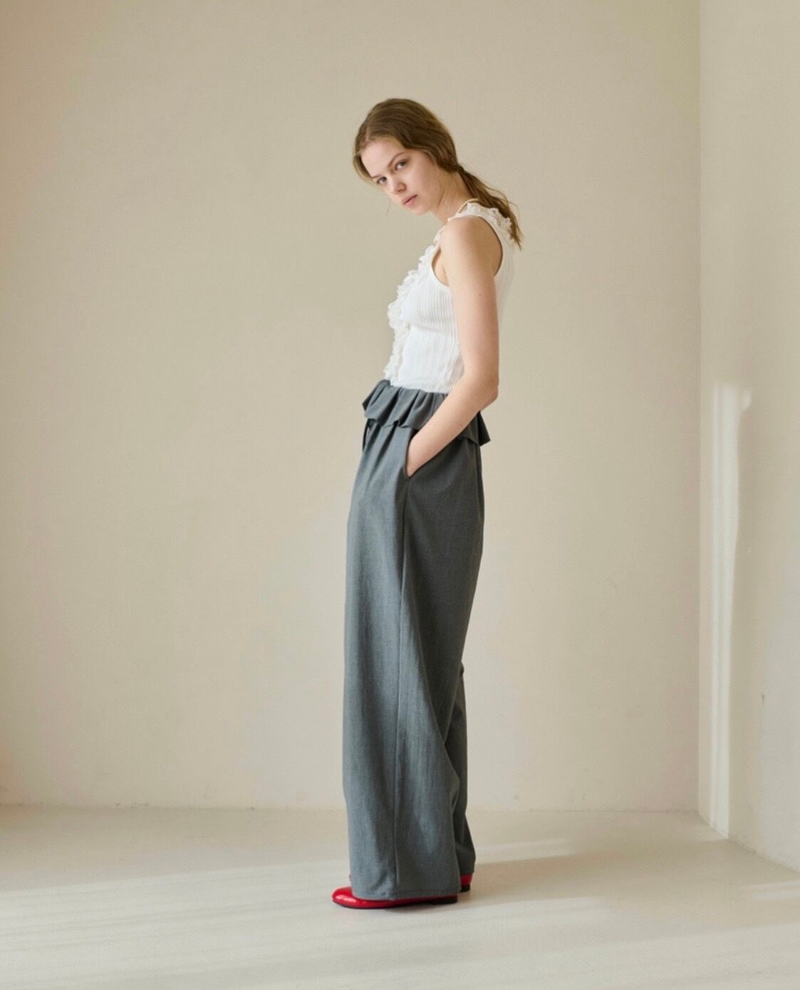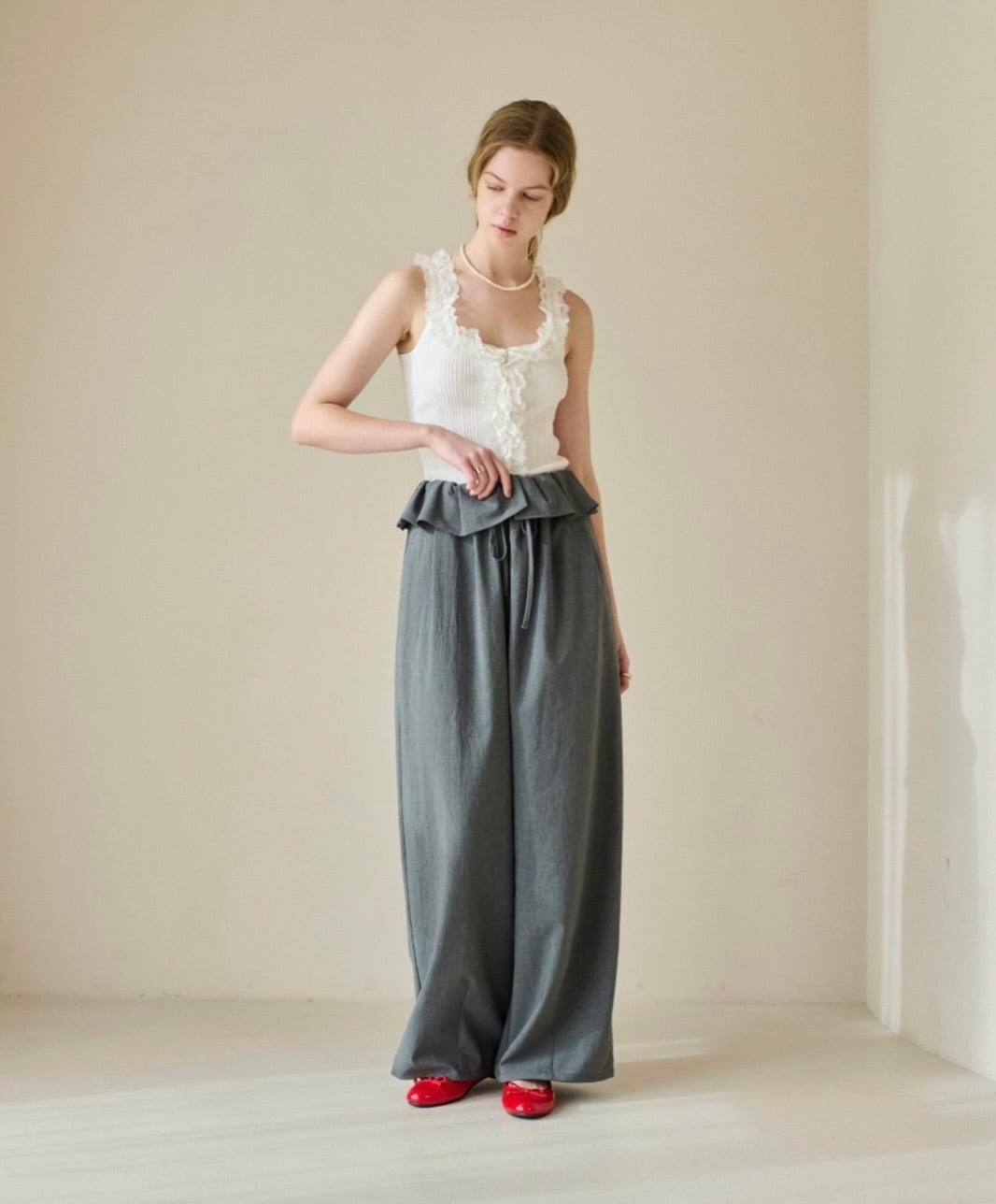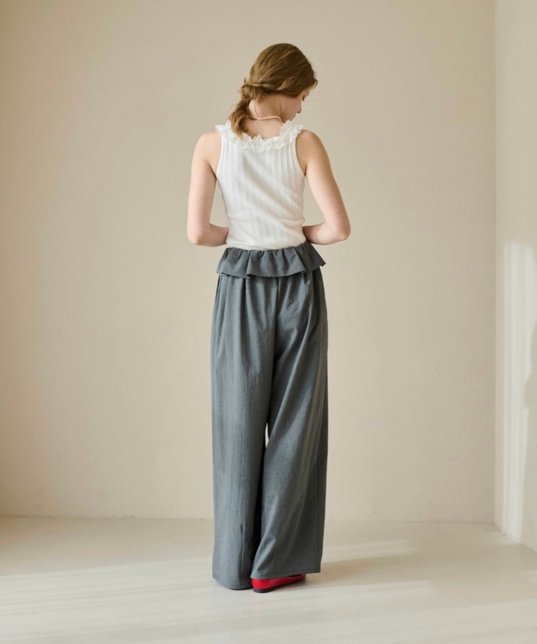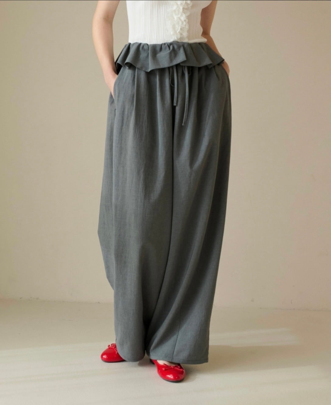 ウエストのフリルが可愛く、トップスをインしたり、短めのトップスを合わせたときにアクセントになります。