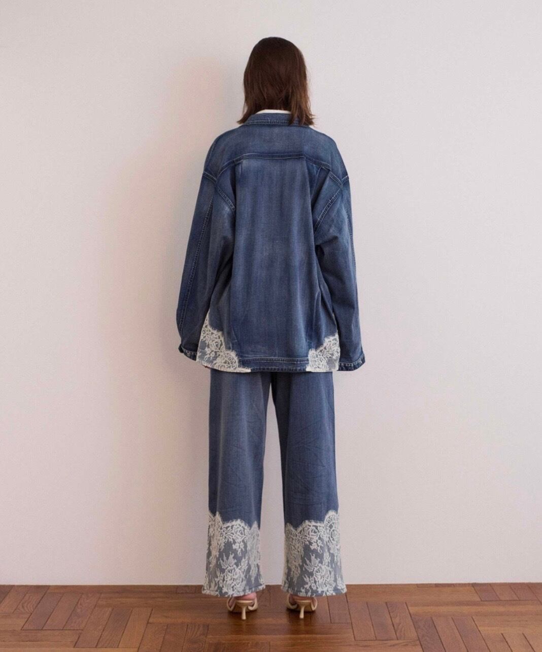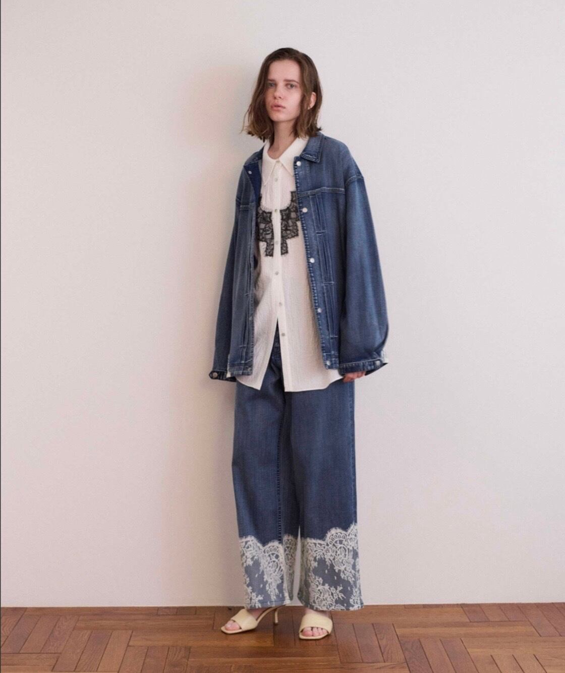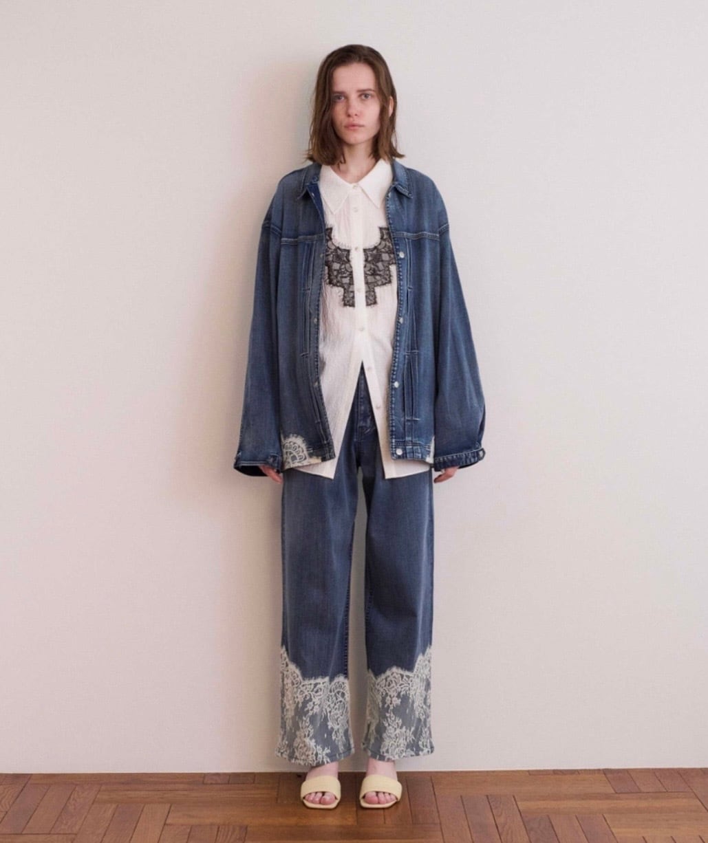 繊細なアンティーク調のレースをスカラップで裾に配置し、加工感のあるデニム素材と組み合わせることで、甘さと辛さがマッチしたCOELならではのアイテムになりました。