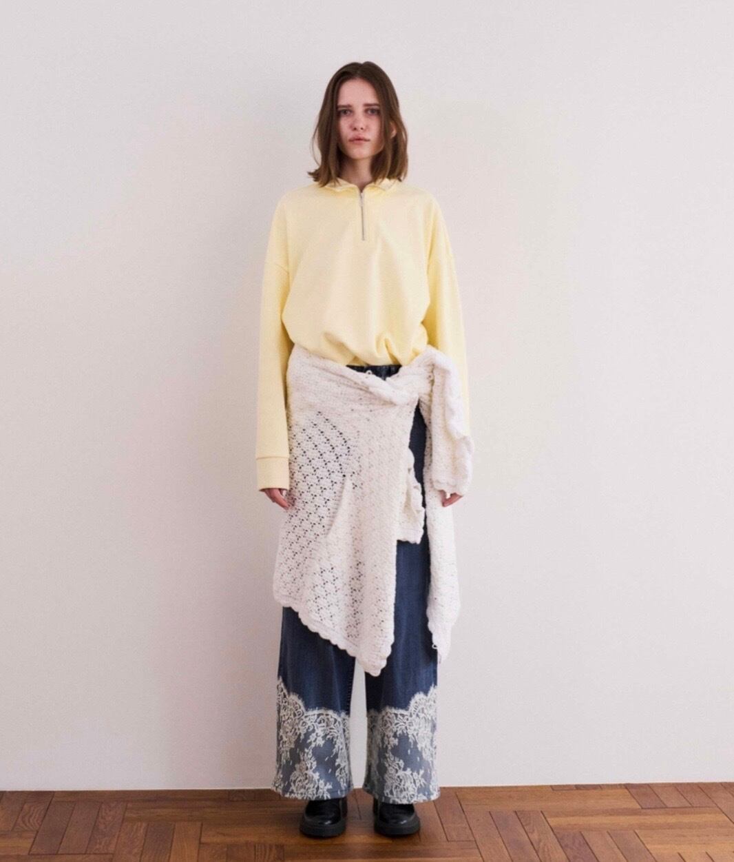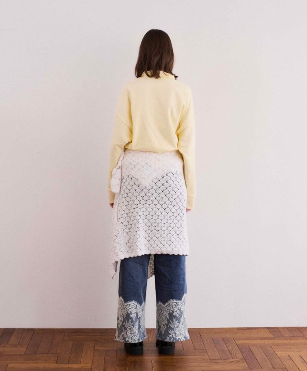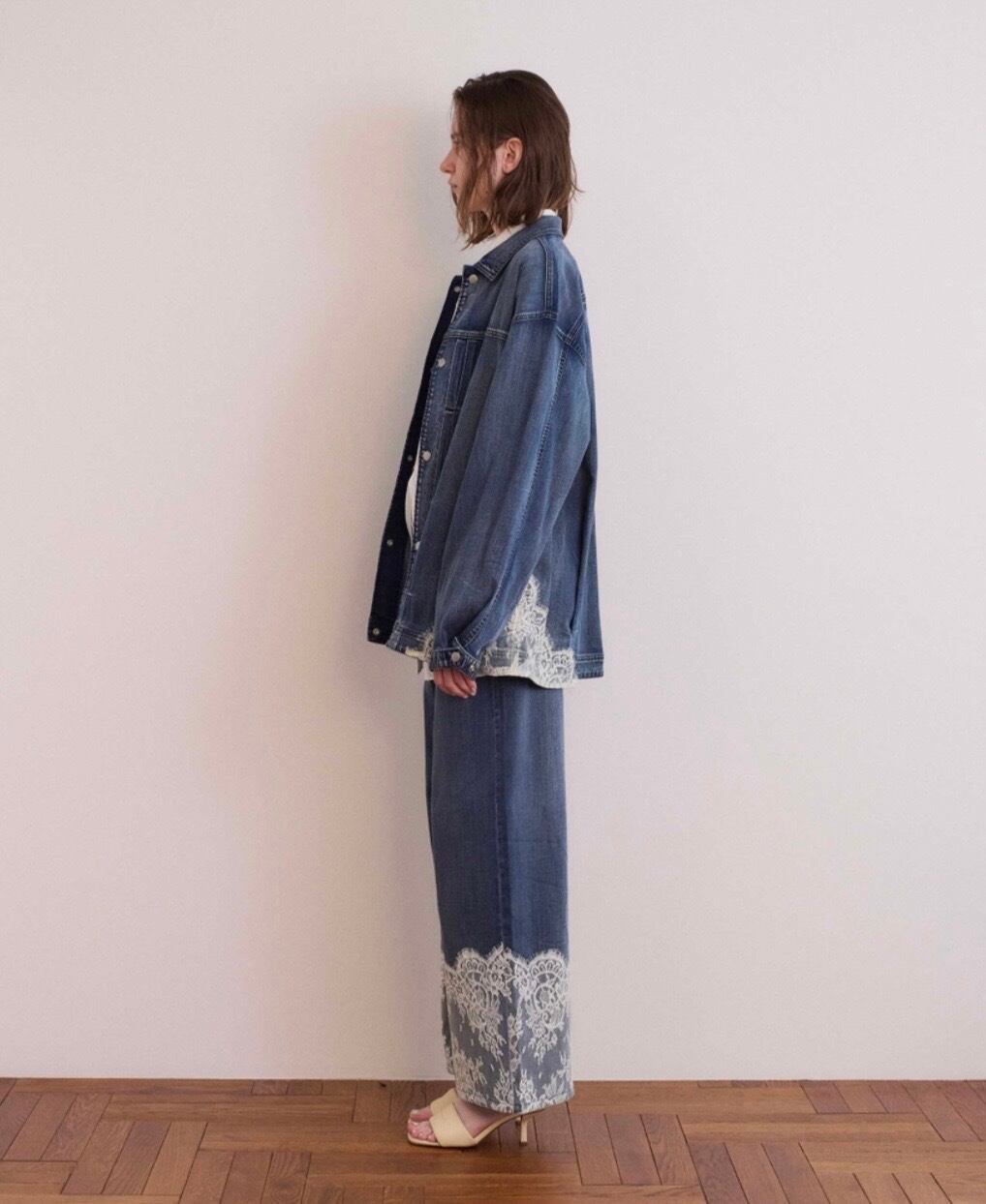 繊細なアンティーク調のレースをスカラップで裾に配置し、加工感のあるデニム素材と組み合わせることで、甘さと辛さがマッチしたCOELならではのアイテムになりました。