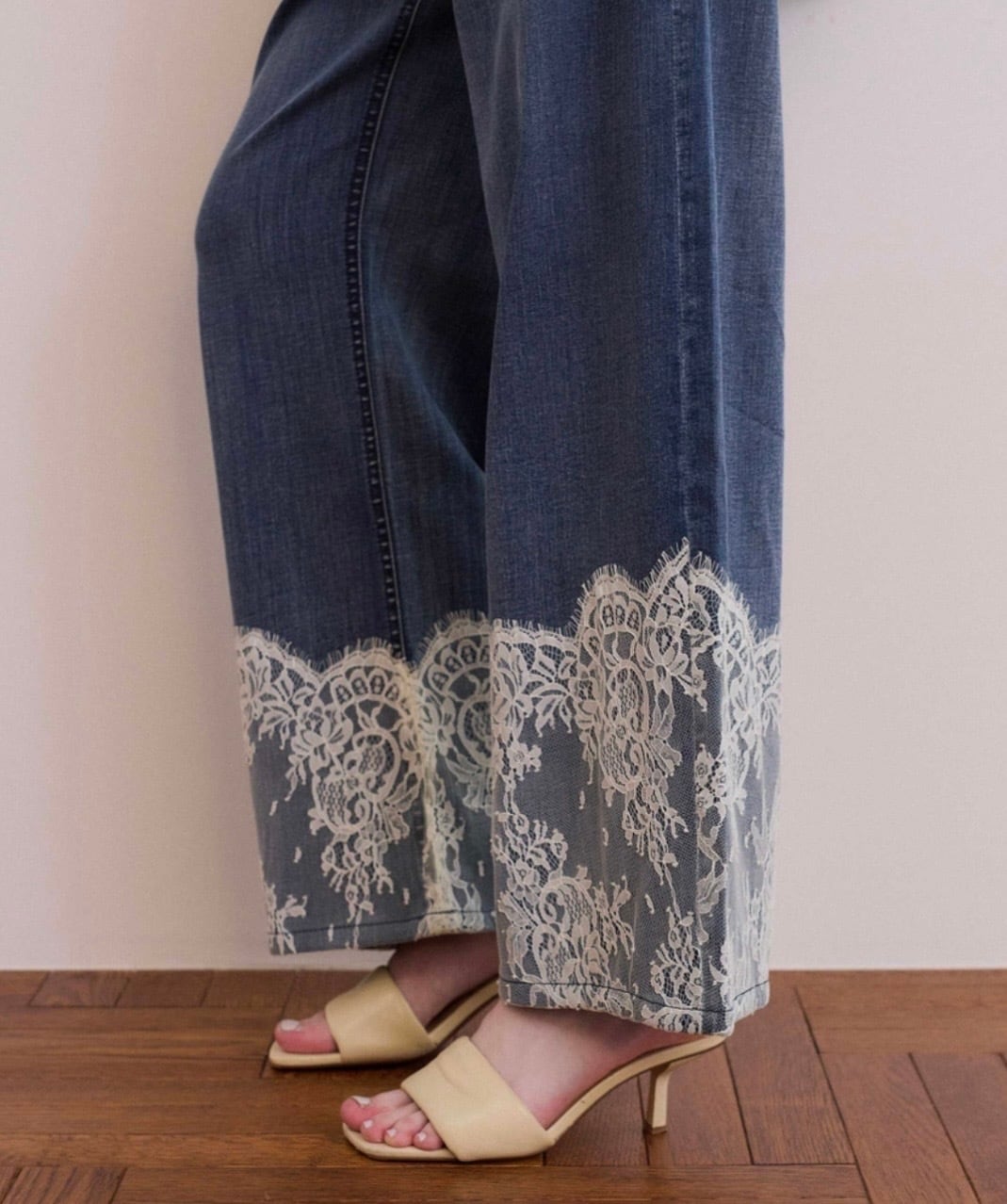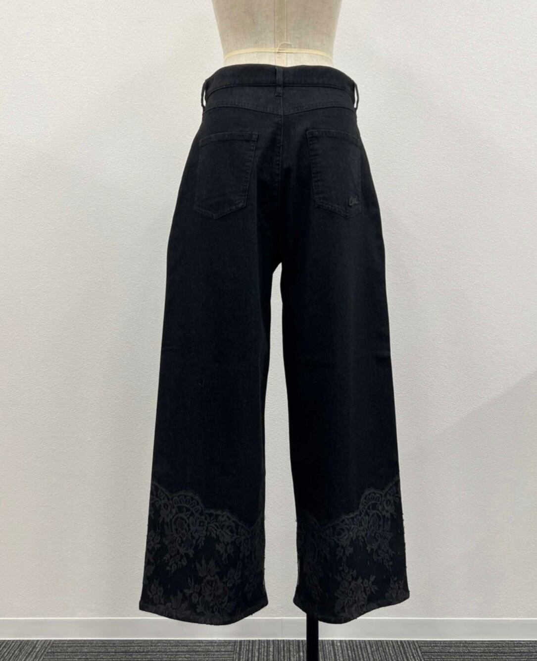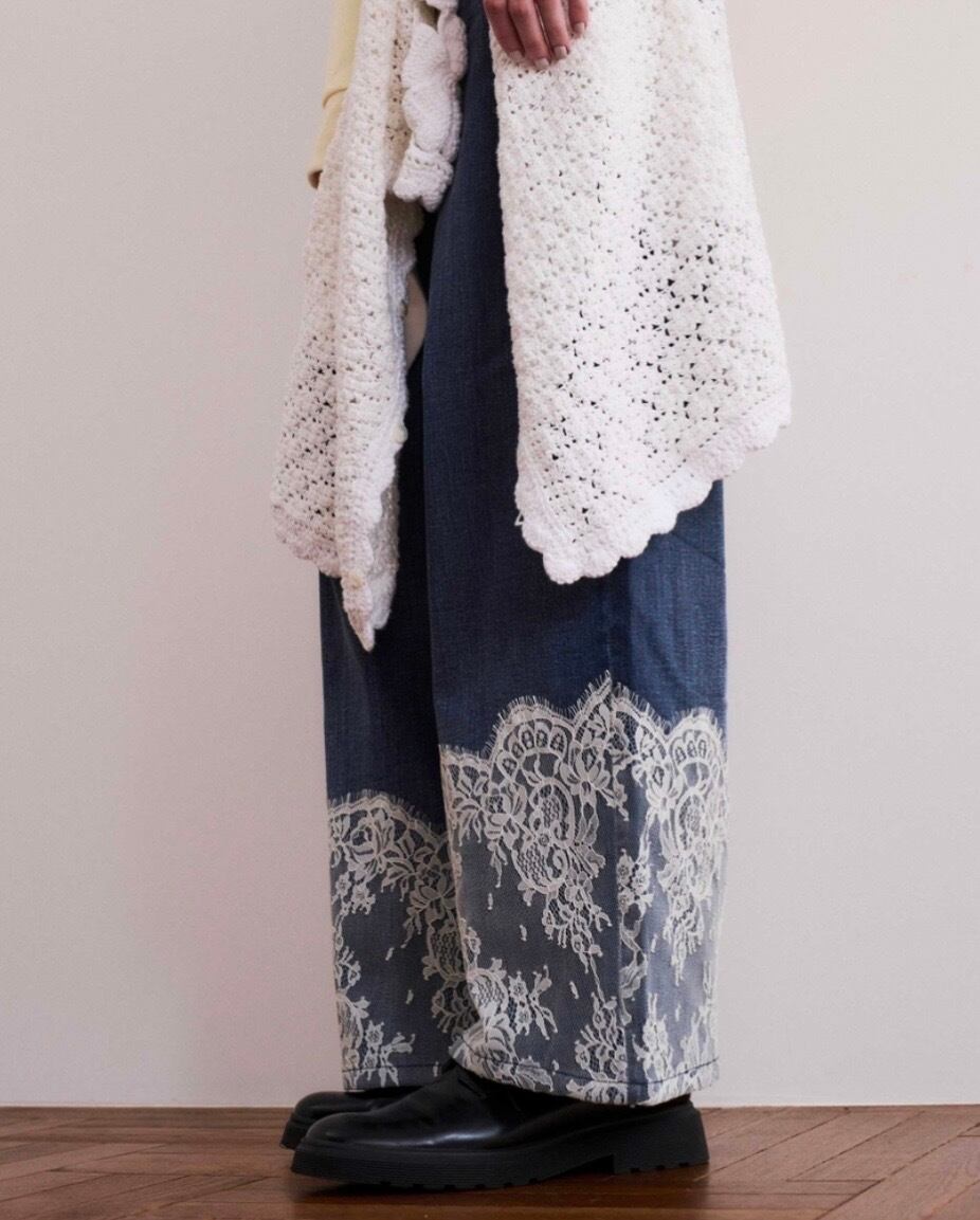 【Design】レース×デニムの異素材デザインがポイントの、ワイドデニムパンツ。