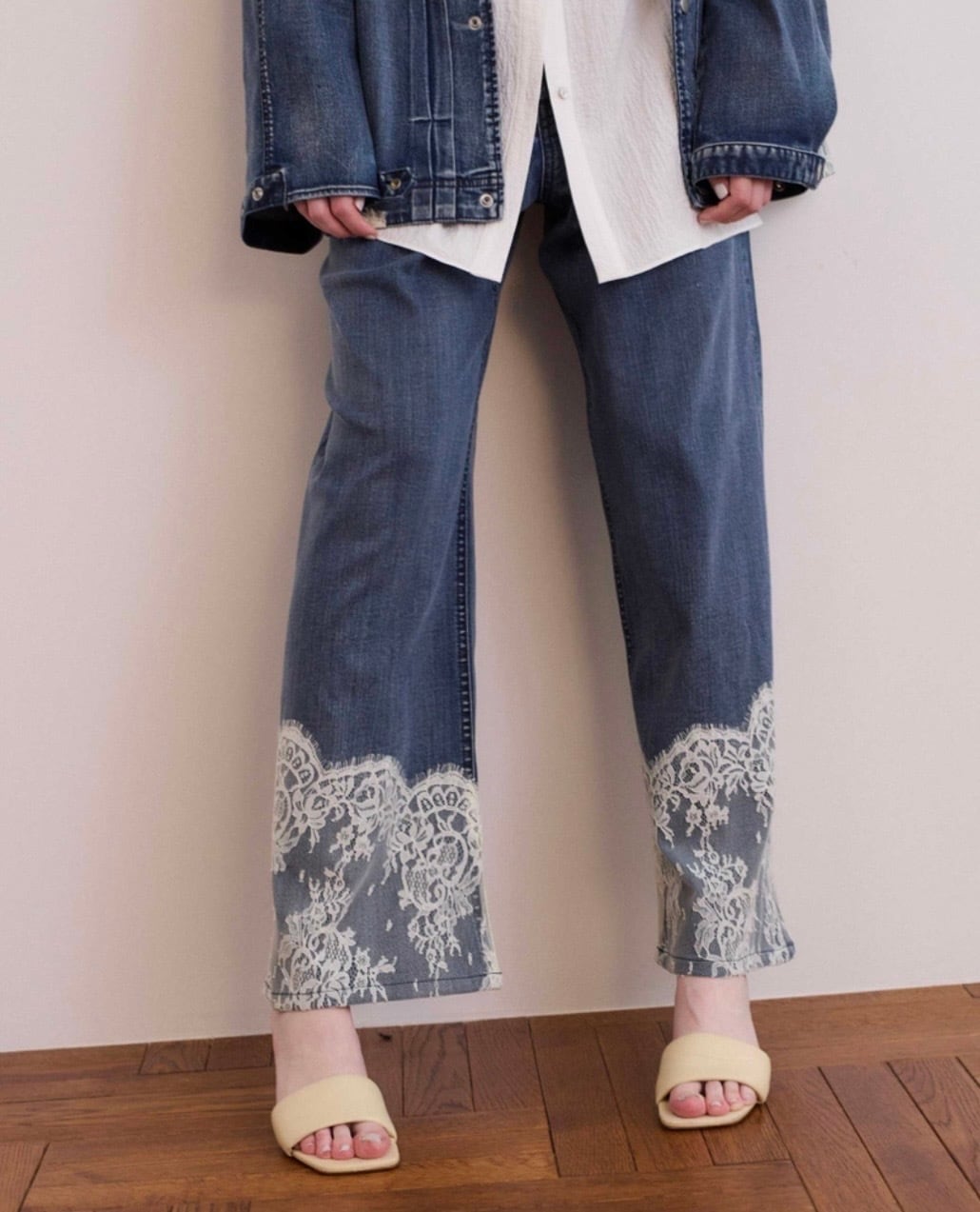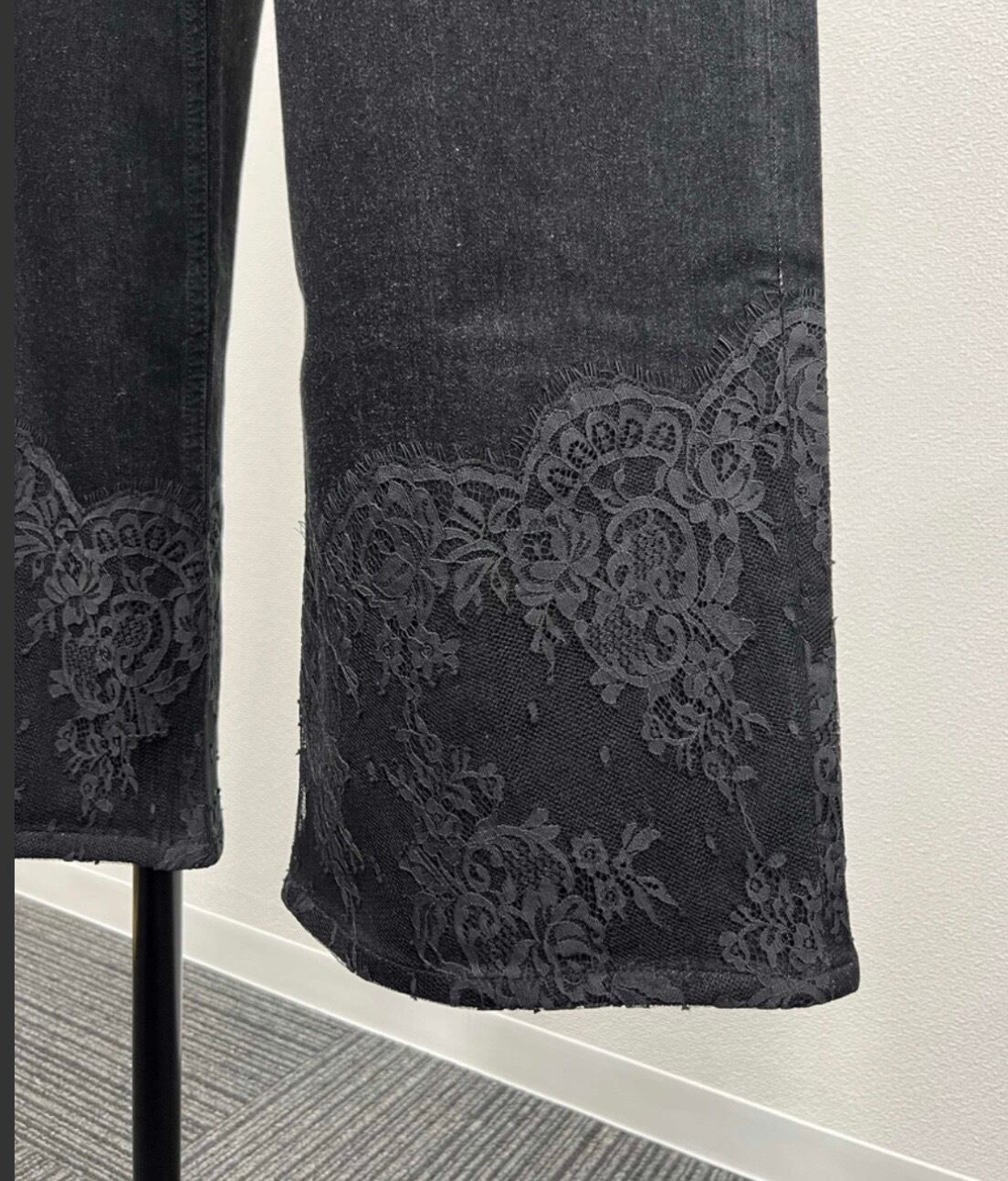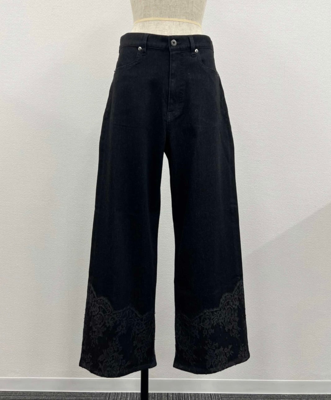 【Design】レース×デニムの異素材デザインがポイントの、ワイドデニムパンツ。
