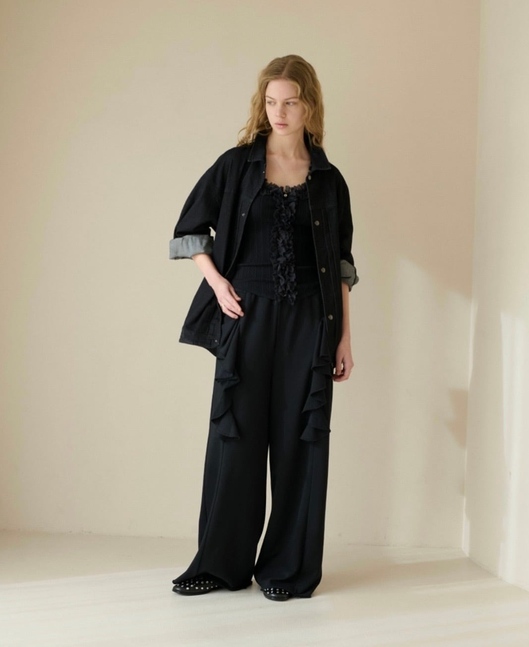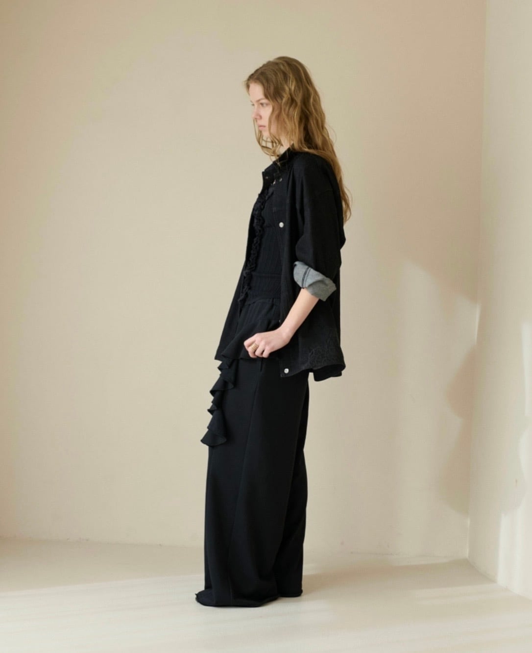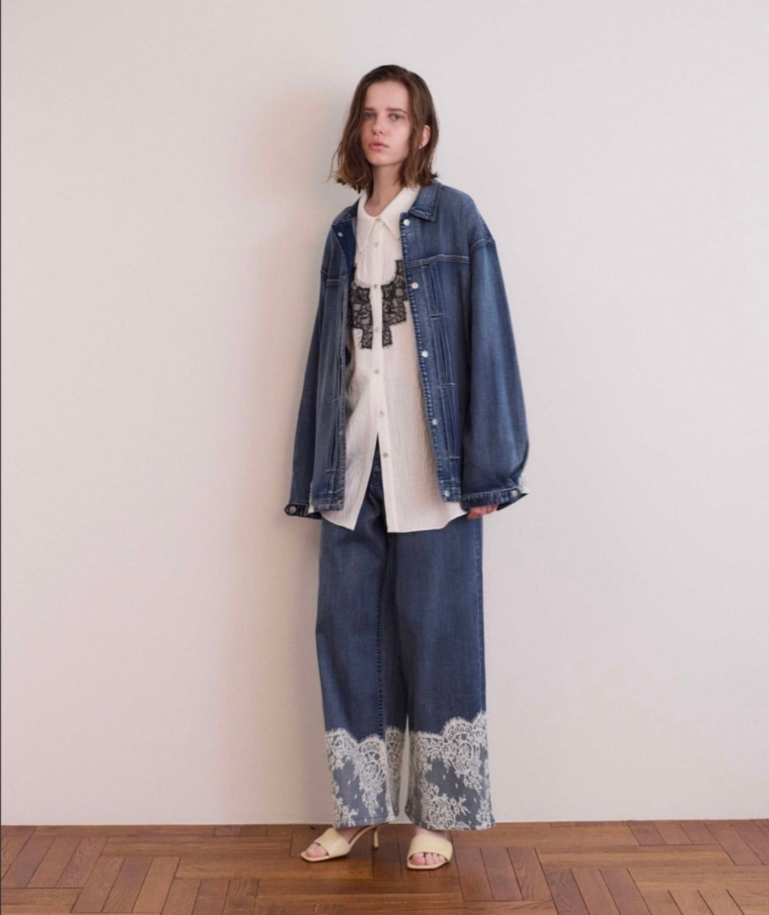 繊細なアンティーク調のレースをスカラップで配置し、加工感のあるデニム素材と組み合わせることで、甘さと辛さがマッチしたCOELならではのアイテムになりました。