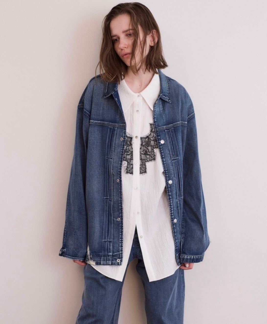 【Design】レース×デニムの異素材デザインがポイントの、シャツのようにサラッと軽く羽織れるカバーオール。