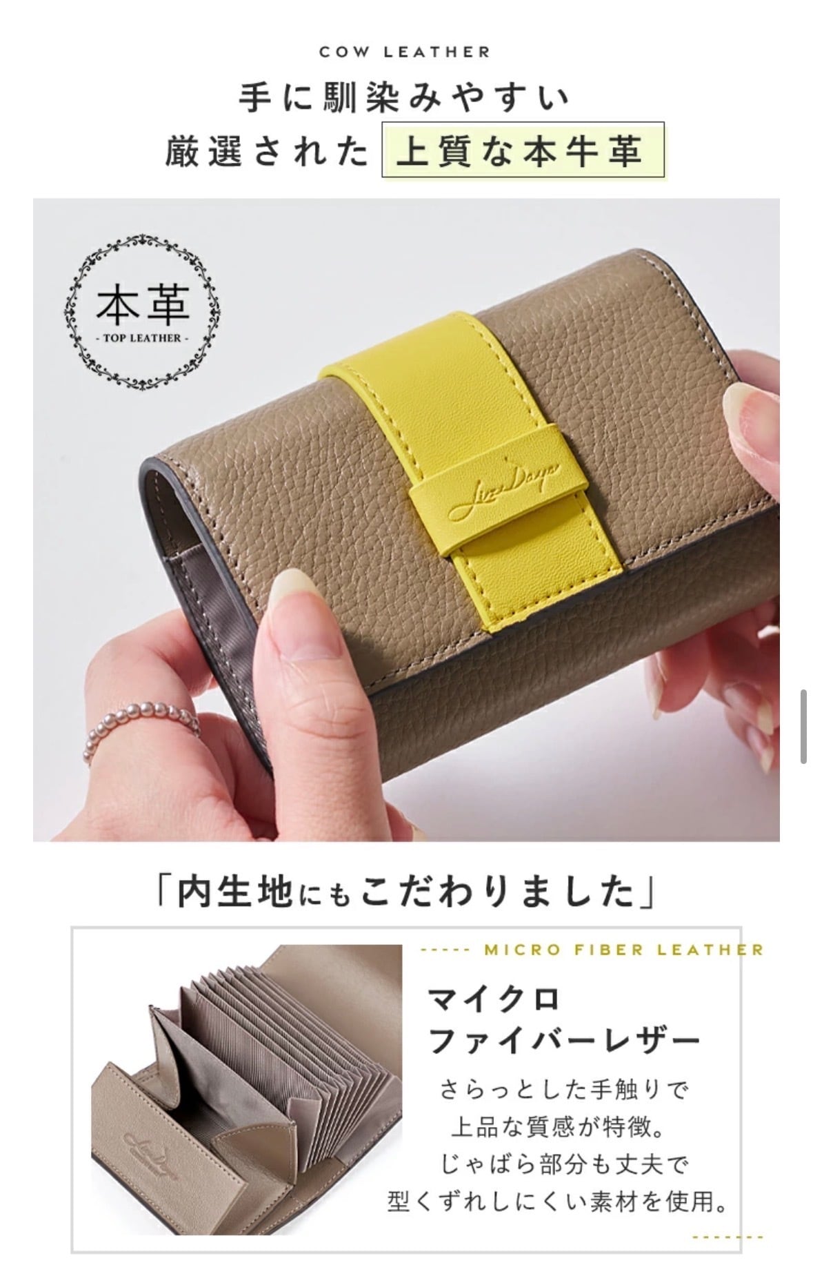 180°大きく開くカード収納に、ボックス型の小銭入れ、下側にはお札を折り曲げずに収納できるスペースもあり、ミニサイズながらしっかり大容量◎