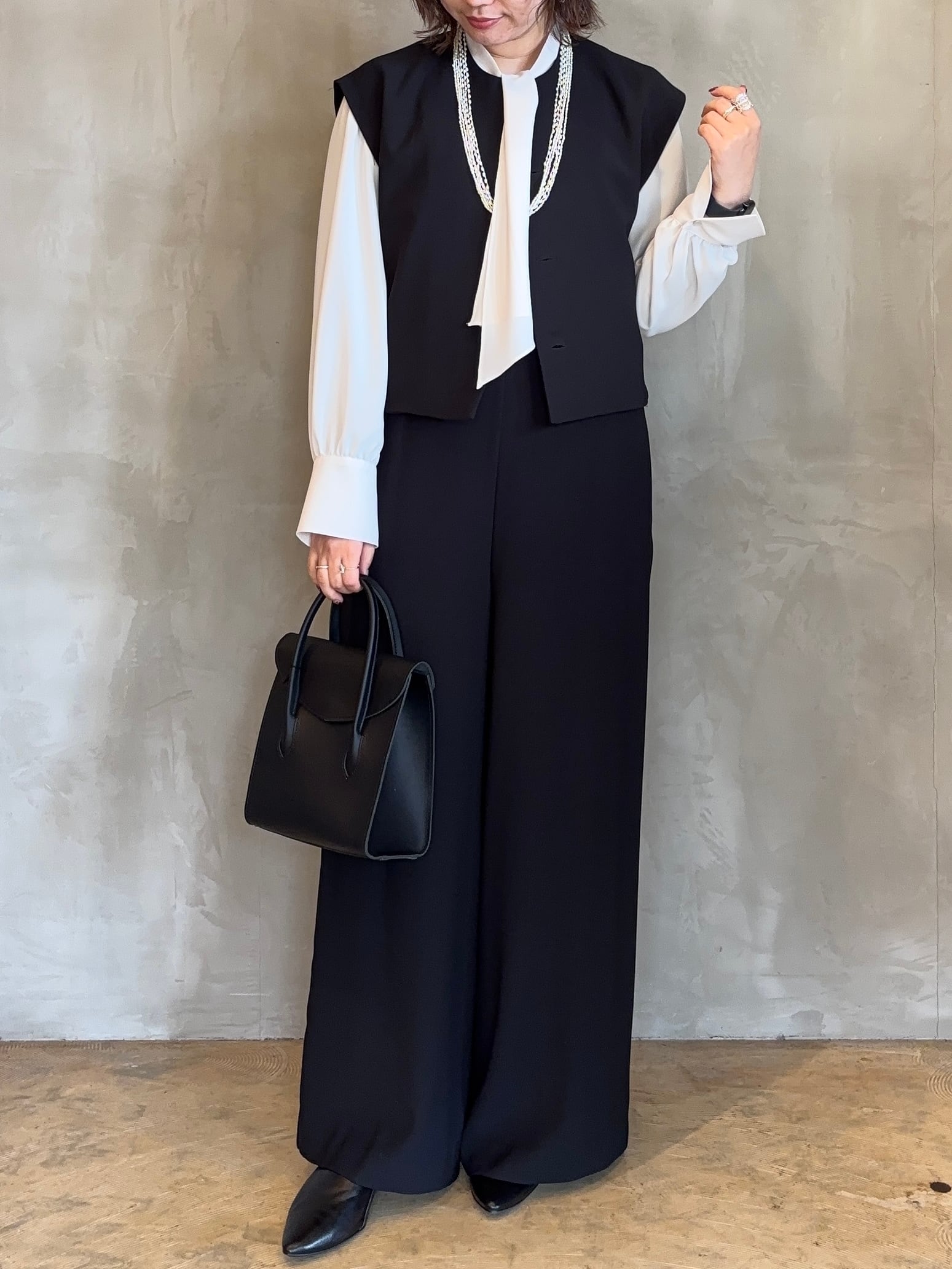 同素材のベストを合わせたセットアップスタイルもおすすめ。