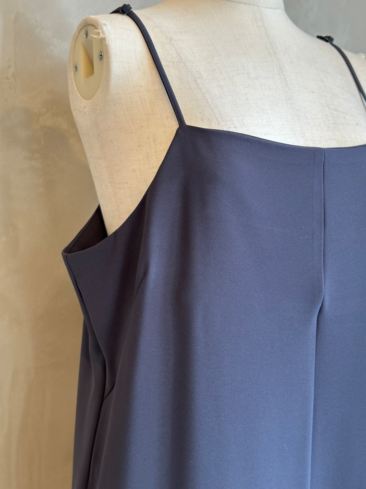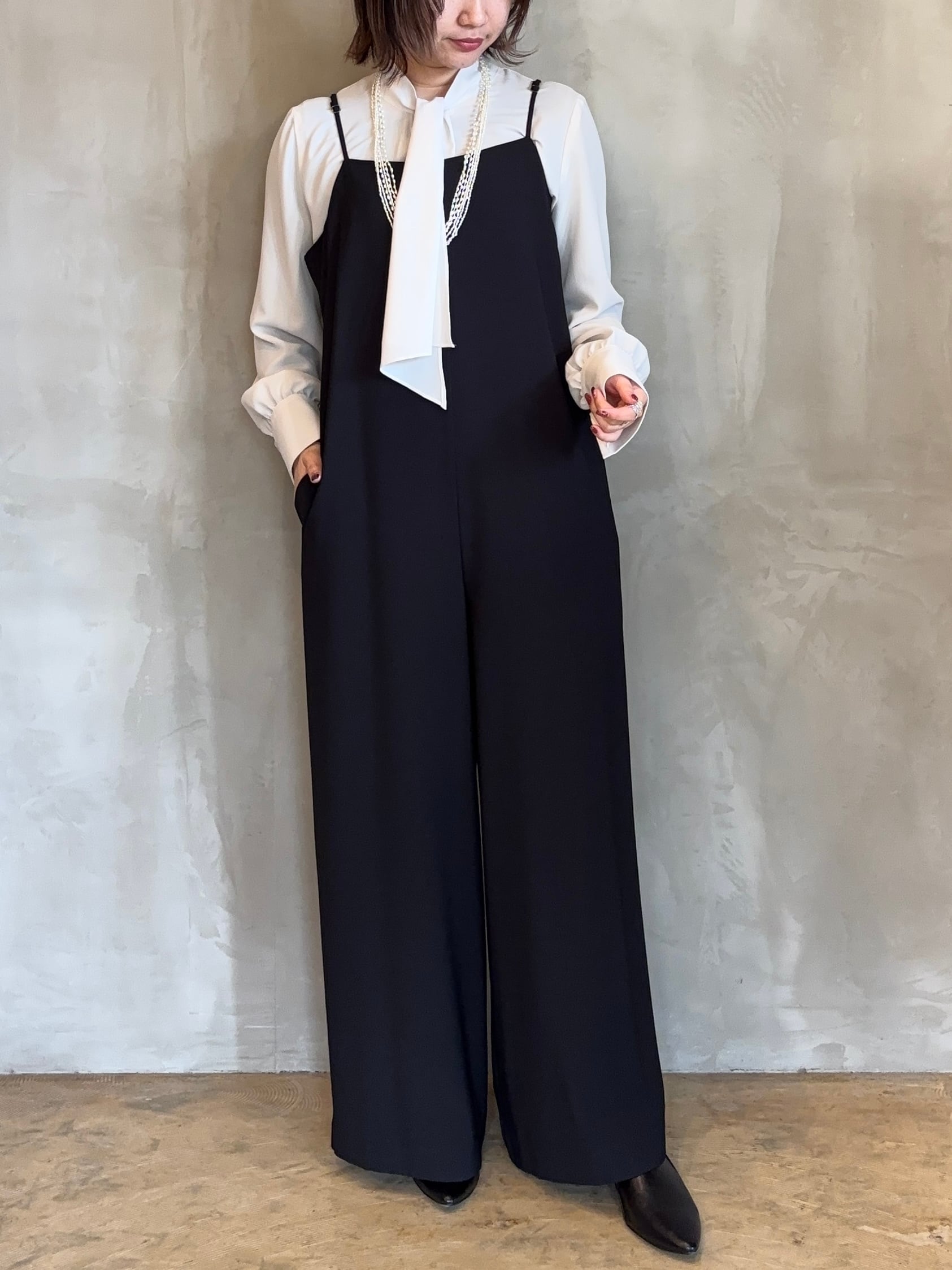 細めのストラップが女性らしさを引き立て、カジュアルになりがちなサロペットも洗練された雰囲気に。