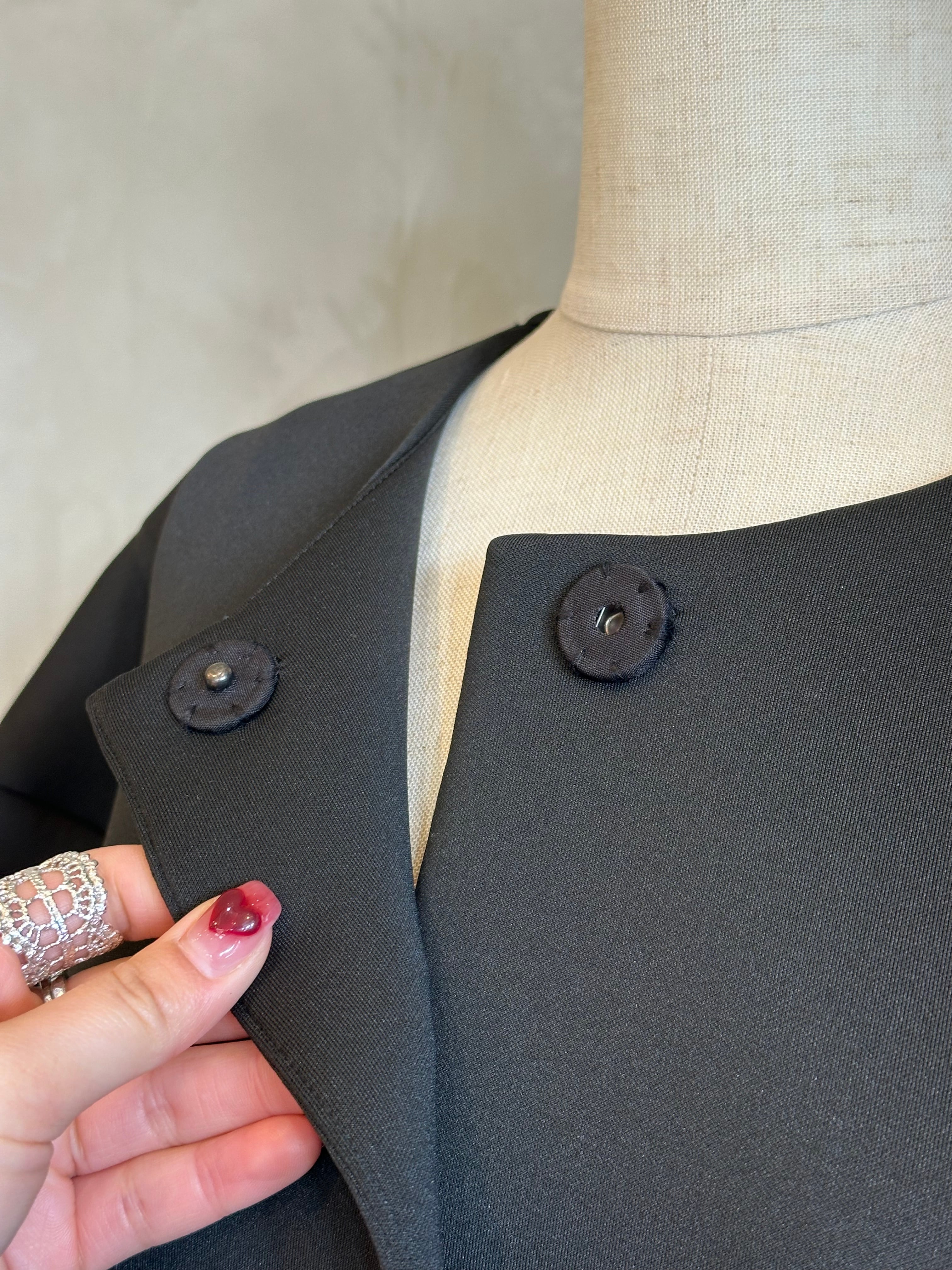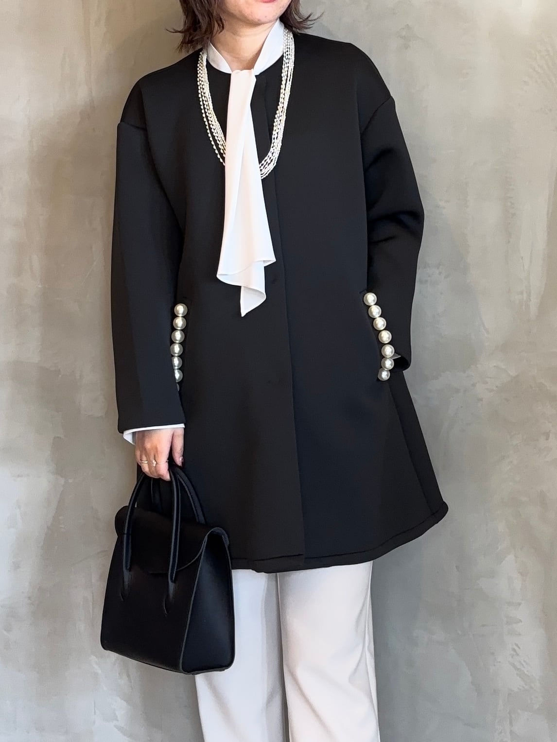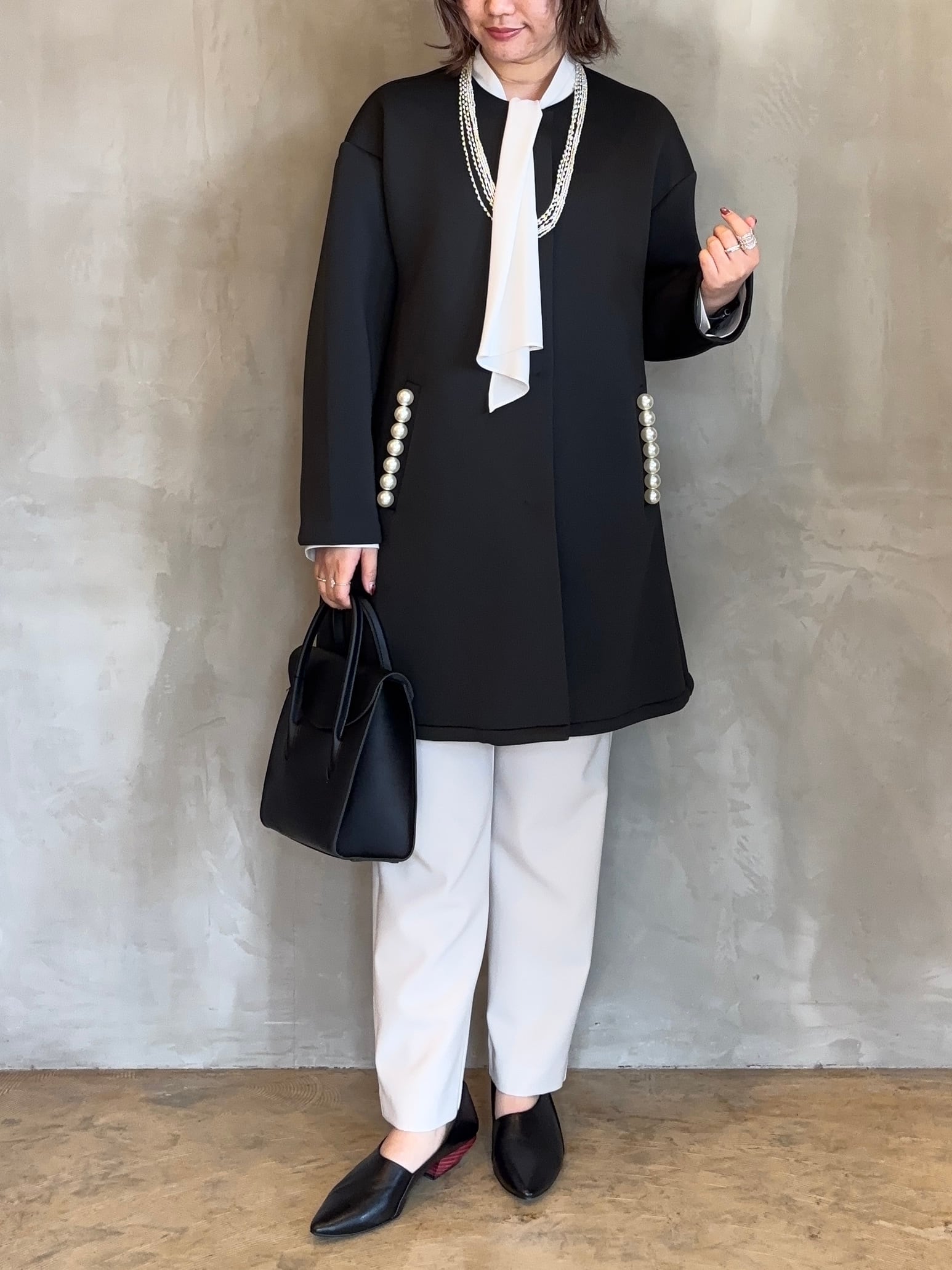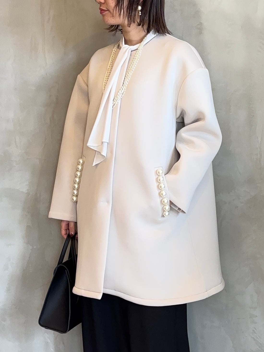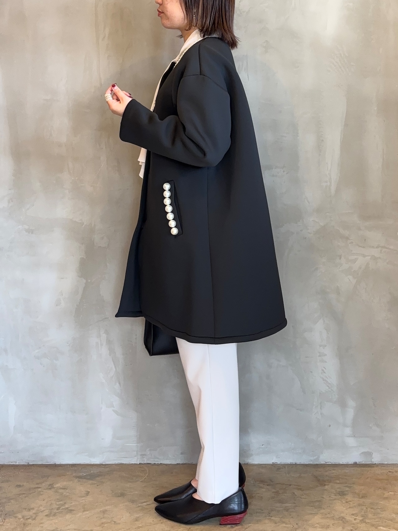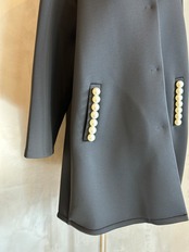 両ポケットに並んだパール釦がさりげなく華やかさを添えてくれる大人の女性らしさを引き立ててくれます。