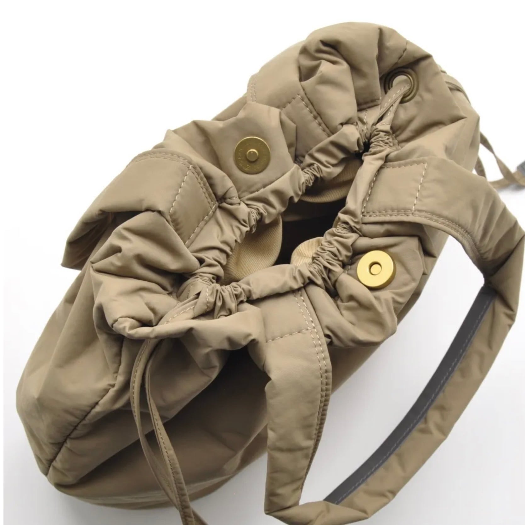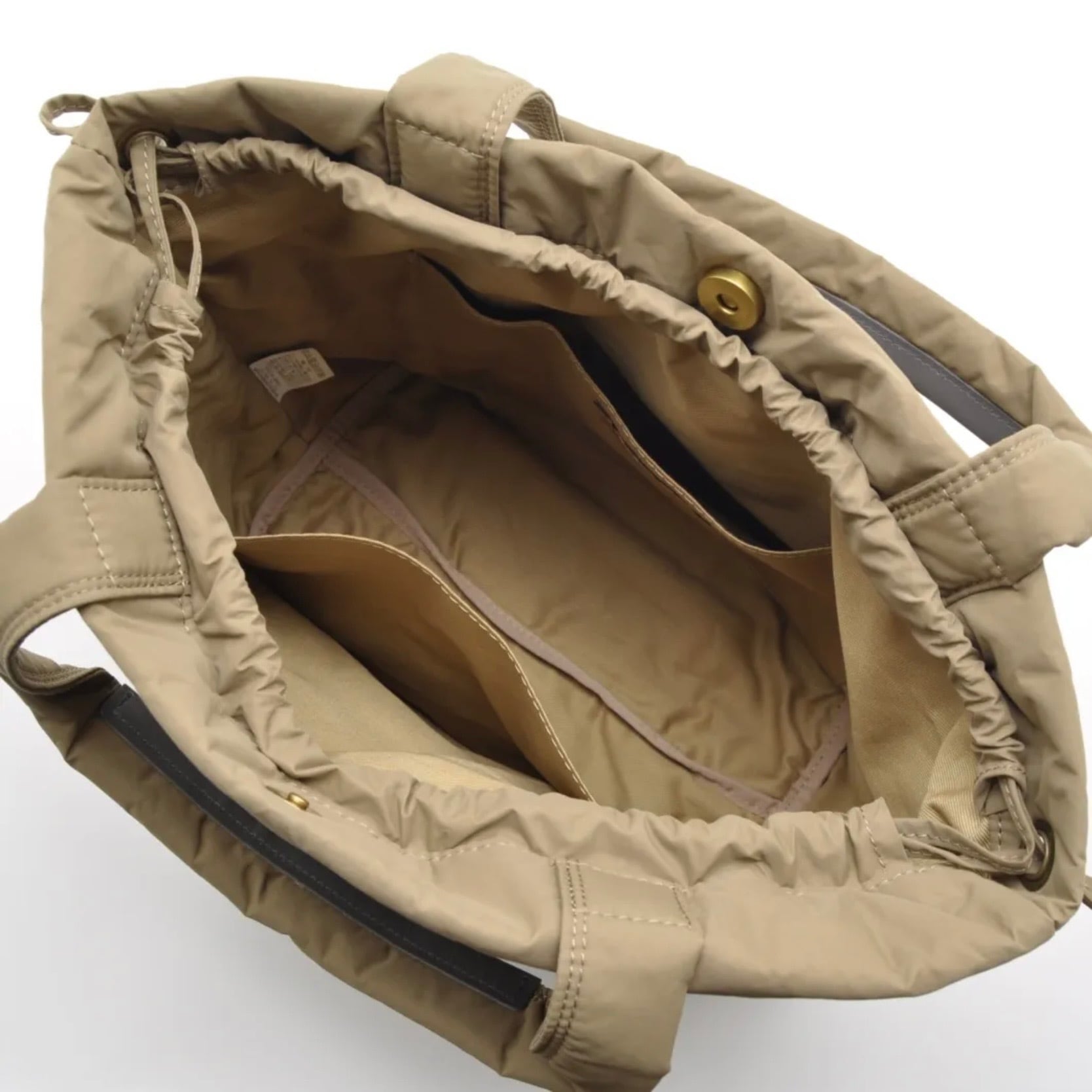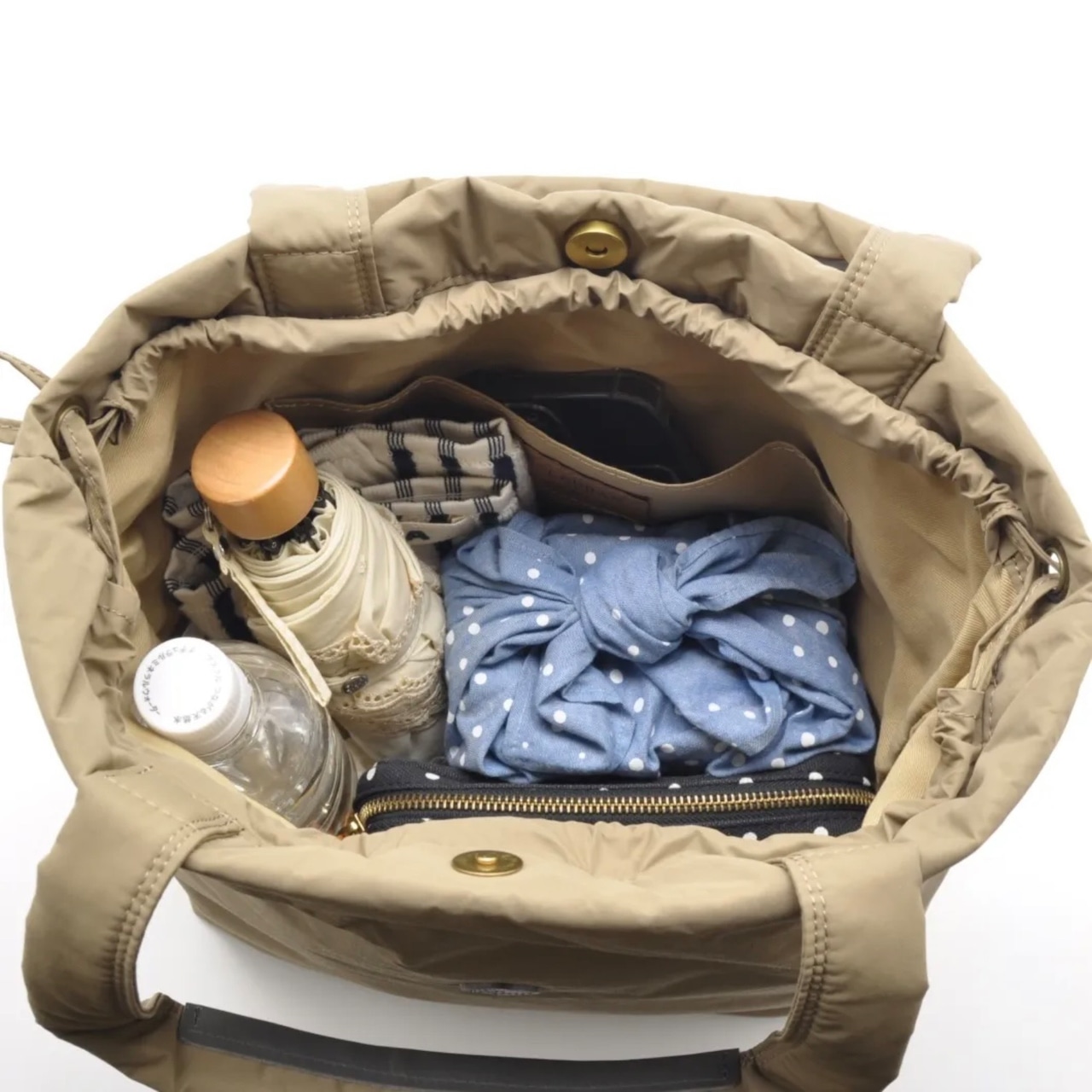 口元を絞ると巾着型にも変えられ、気分に合わせて使い方をアレンジ可能。